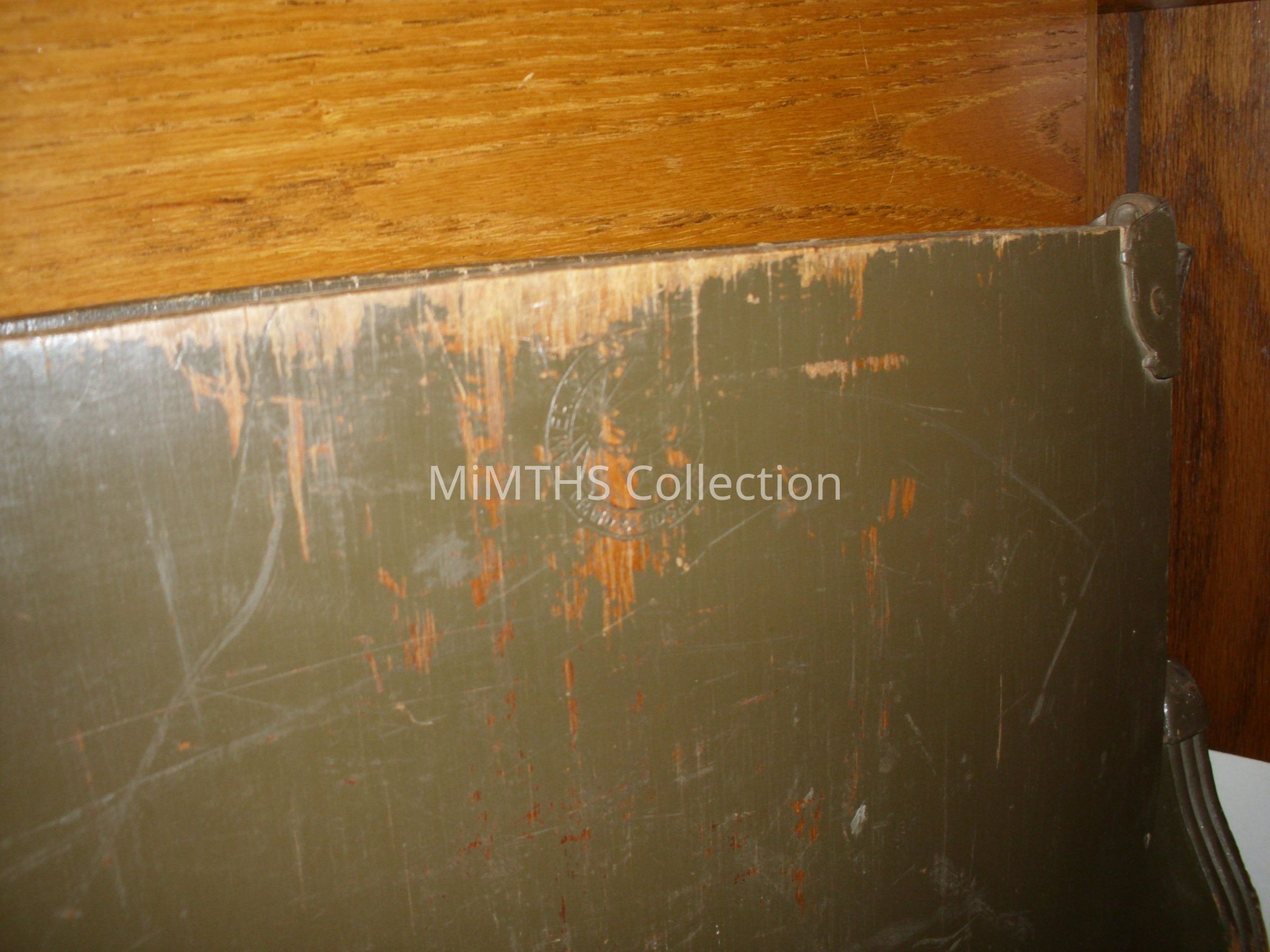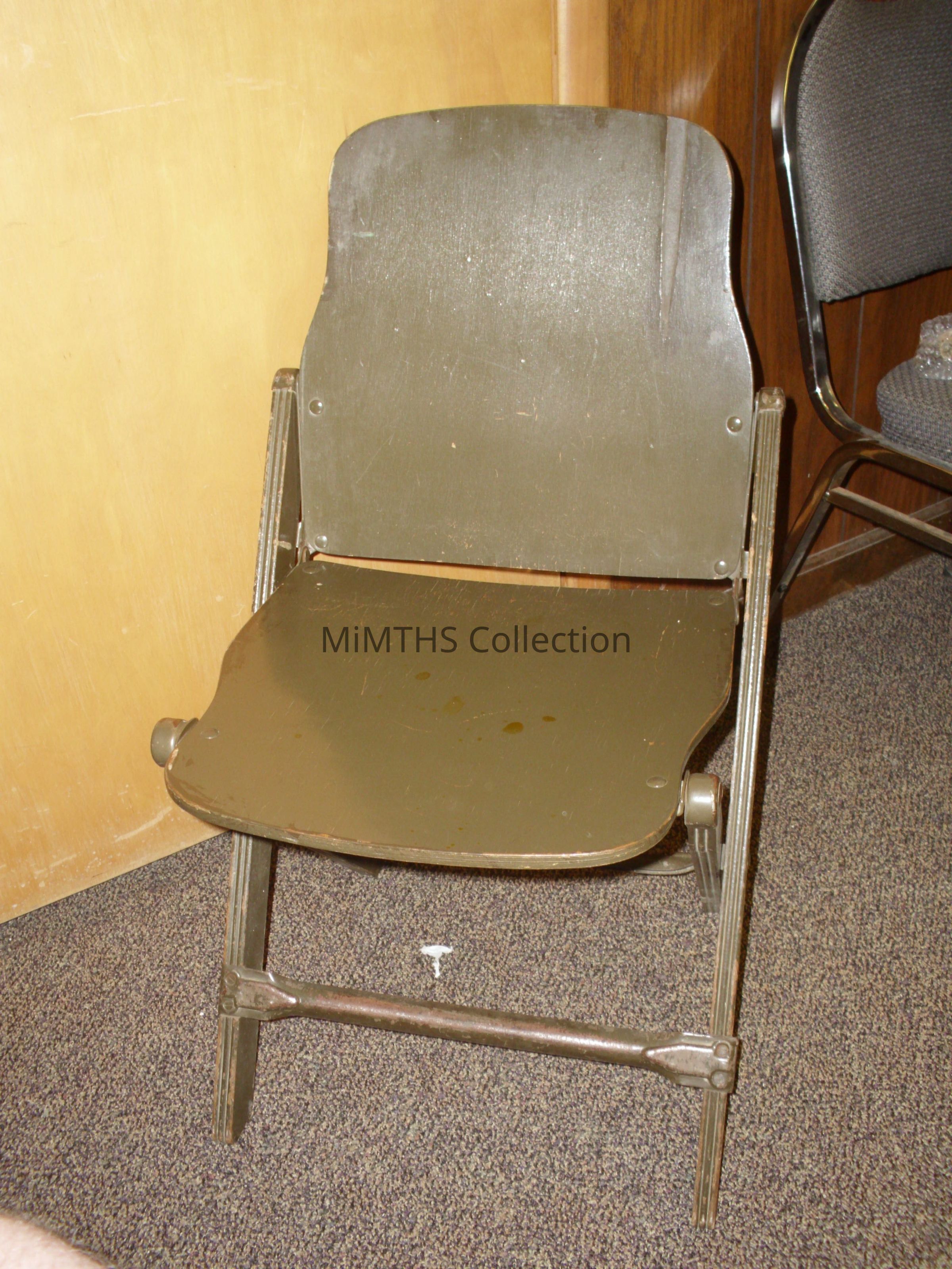 Made by American Seating Company of Grand Rapids. Has non-original OD repaint. Wood construction with metal crossbars on legs. Not dated, but wartime style.Cataloged By
