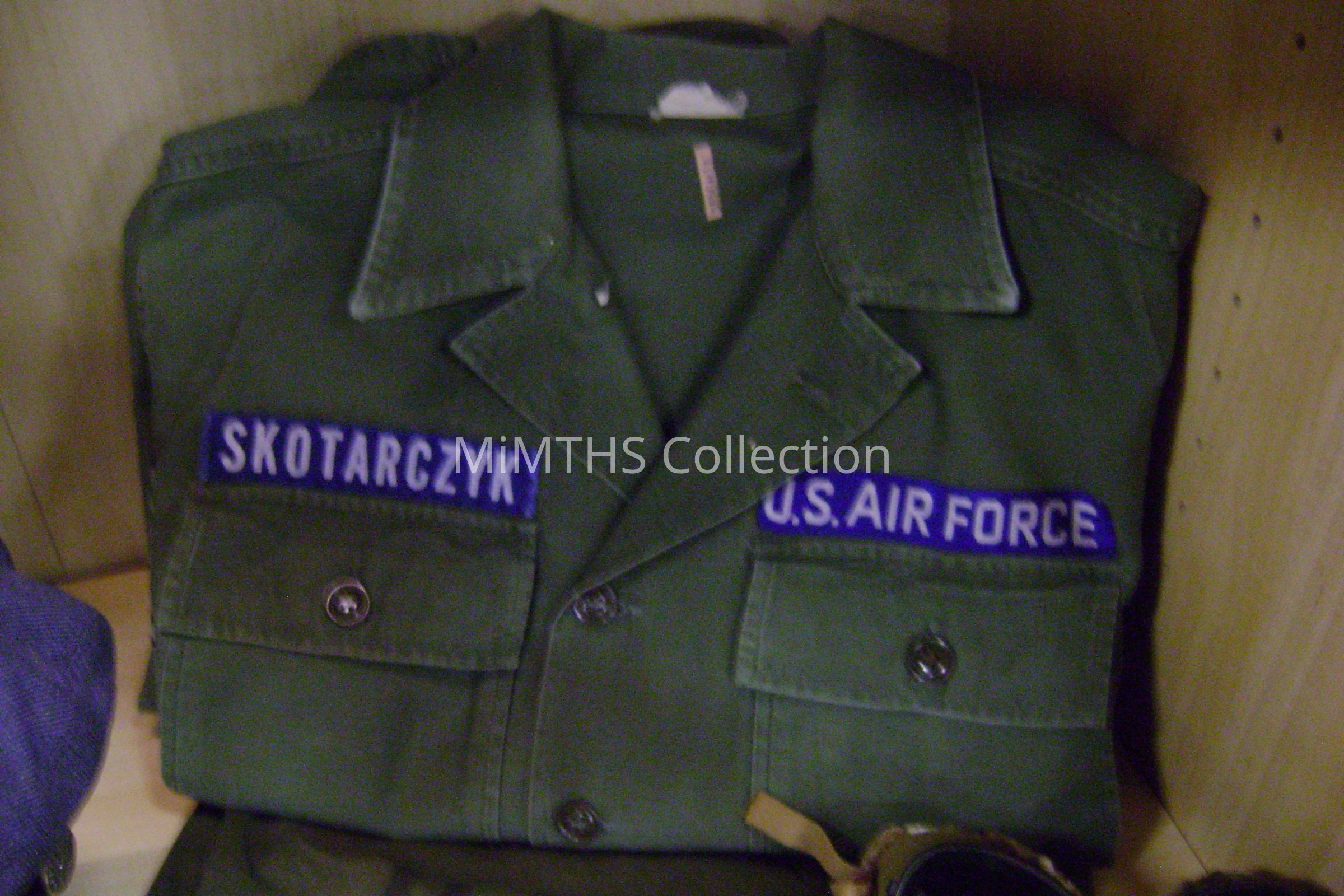 post WWII USAF OG107 fatigue shirt (green), patched name "Skotarczyk" and CM Sgt stripesCataloged By