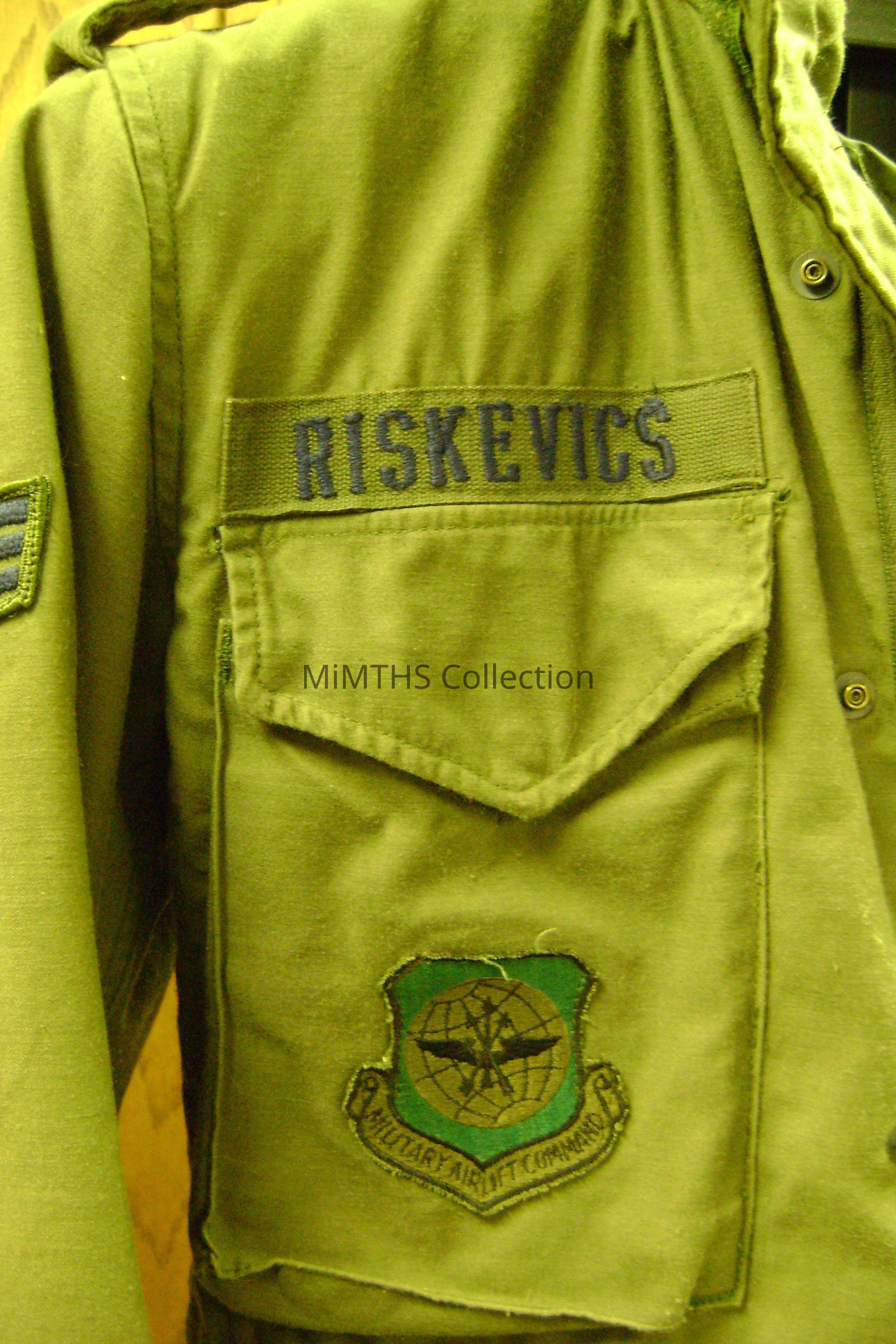 Small M65 field jacket with liner named to "Riskevics" (Sandie Baker) with patches from the 437th Air Mobility Squadron (Charleston AFB)