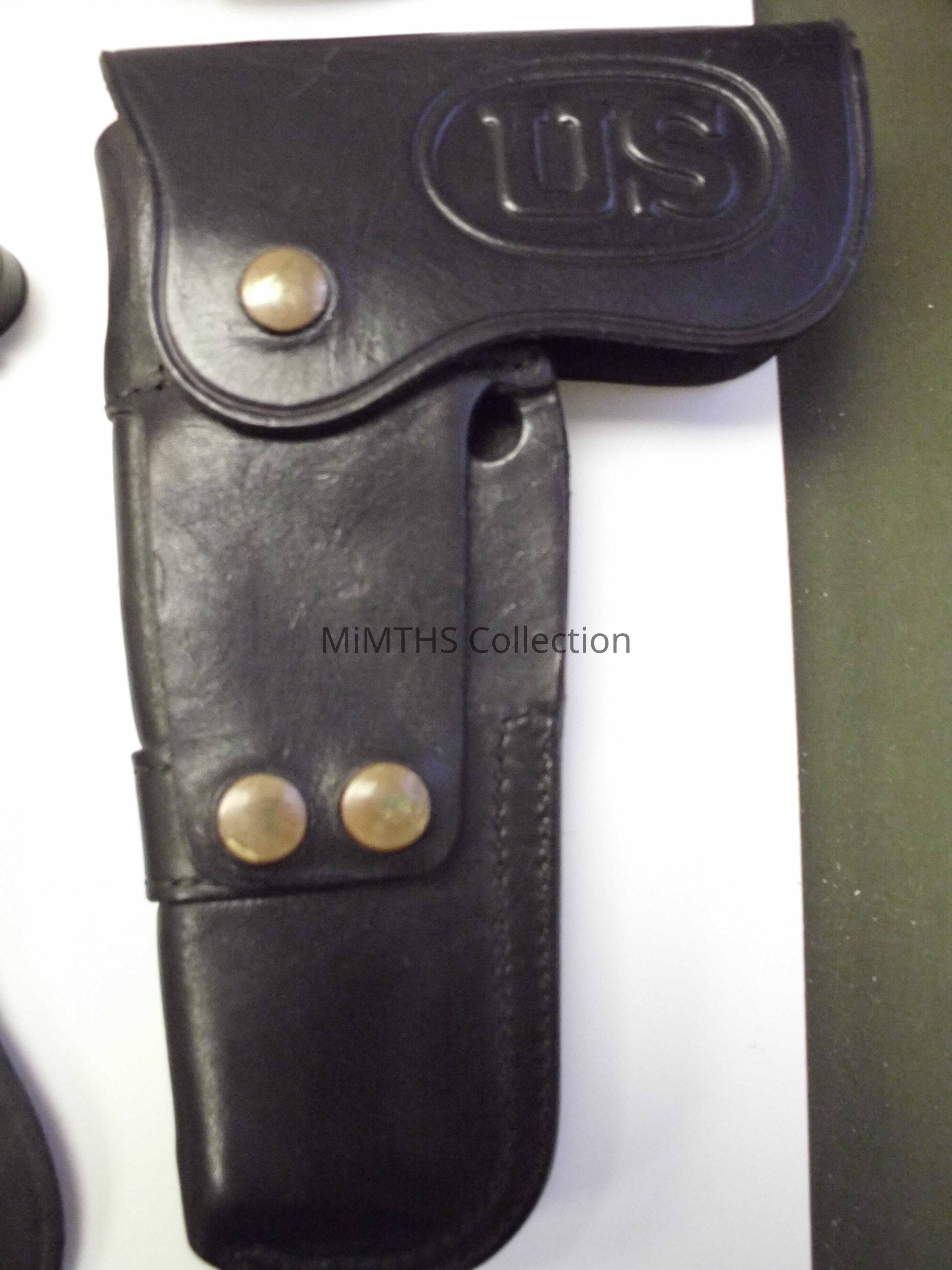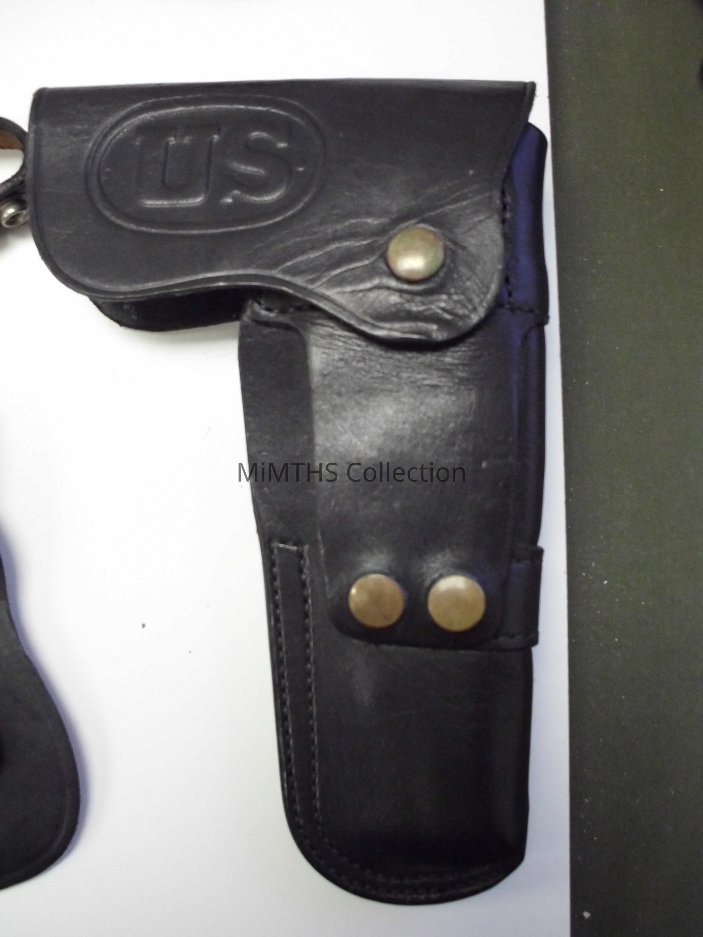 Black leather holster from a USAF MP Belt set. Used by Leo Miller Jr, 127th Security Forces, Selfridge AIr Base.Cataloged By