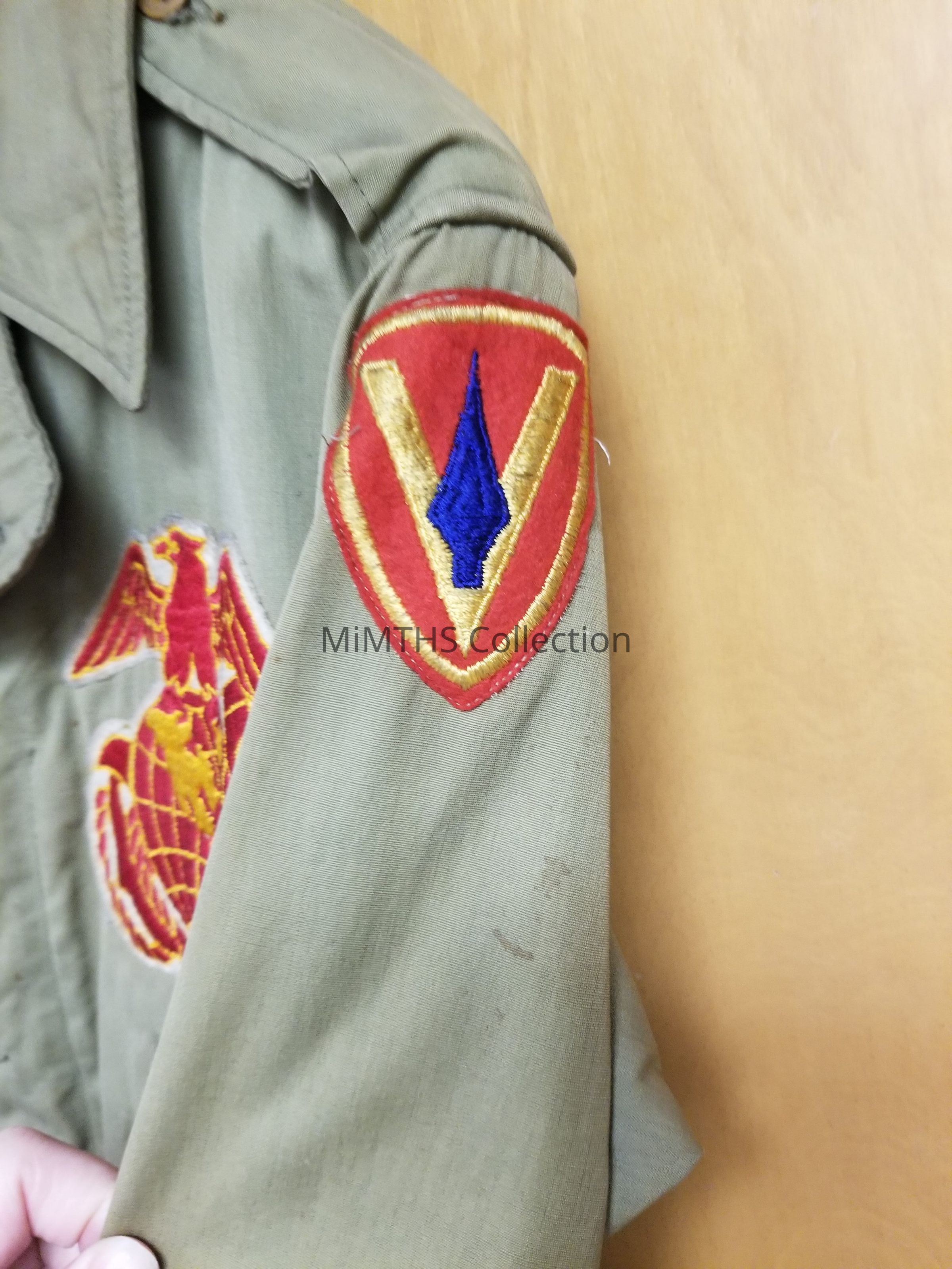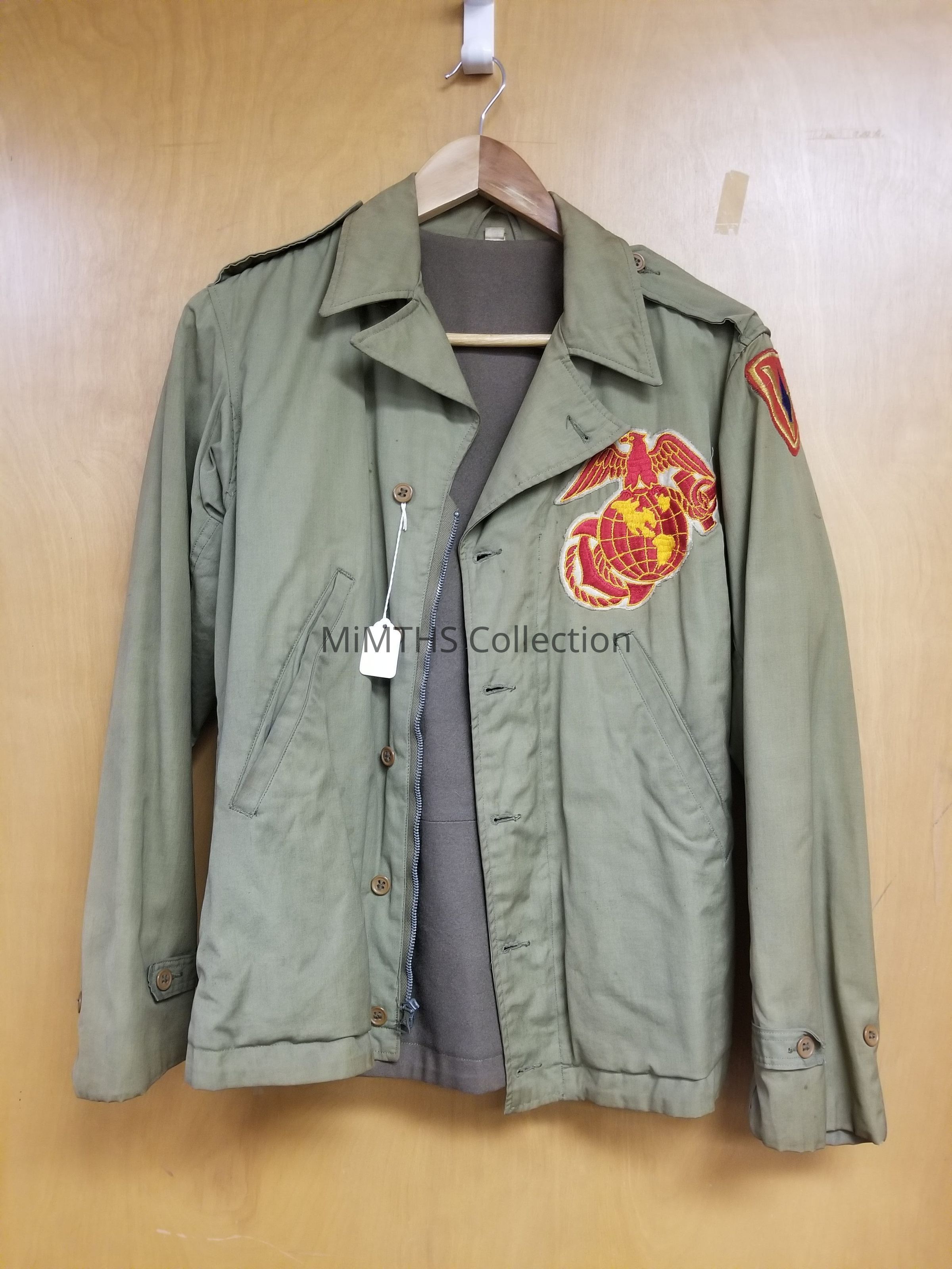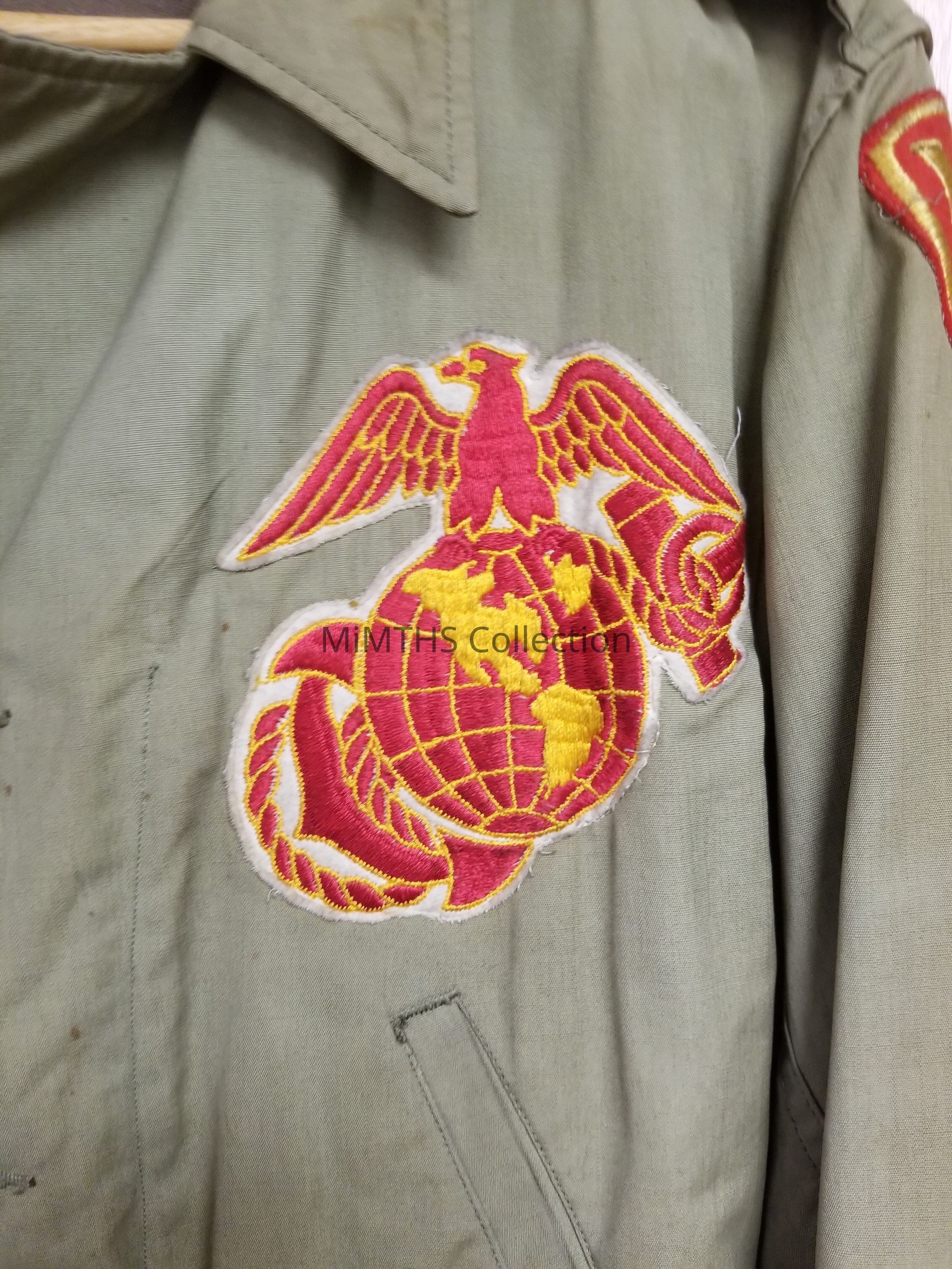 WWII U.S. Marine Corps embroidered field jacket, worn by CPL. Mitchell Filips. Features 5th Division ISS and Marine pocket patches. This type of jacket