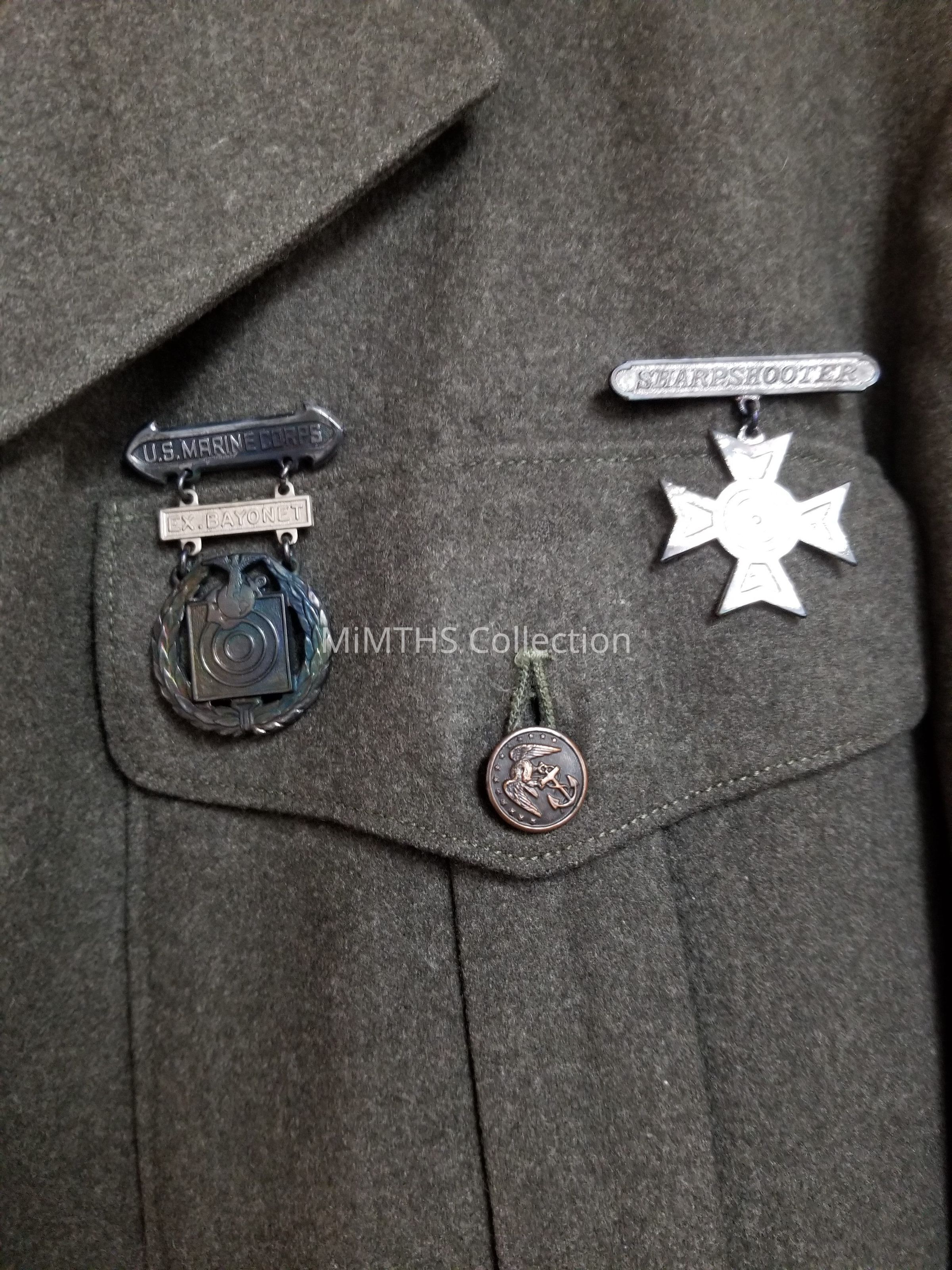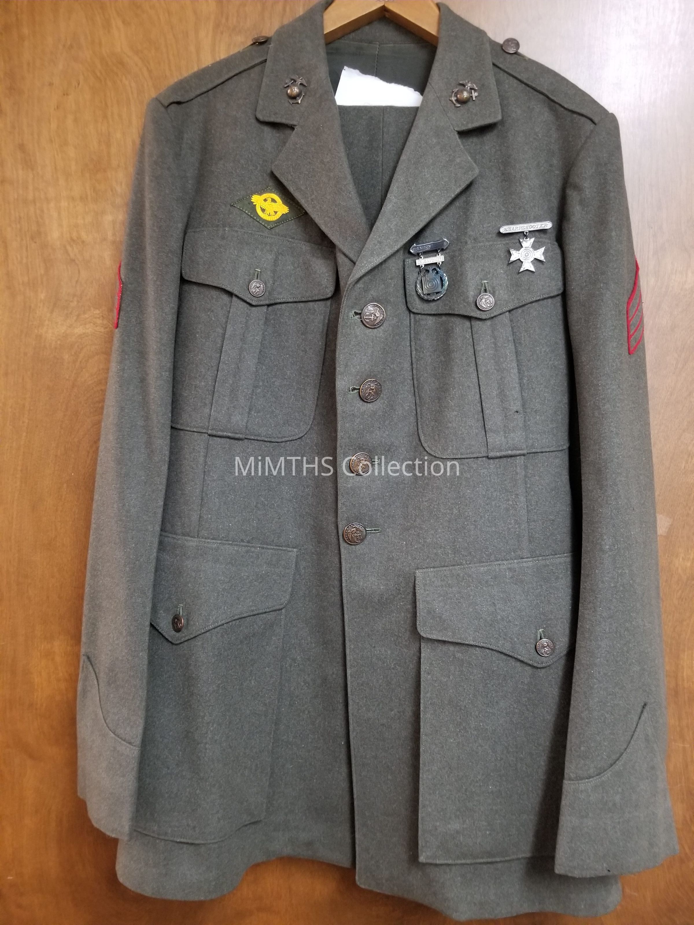Forest green jacket, and trouser made of finely napped kersey wool. With Sergeant stripes, "Ruptured Duck" discharge patch and Sharpshooter medal and Expert Bayonet medal.Cataloged By