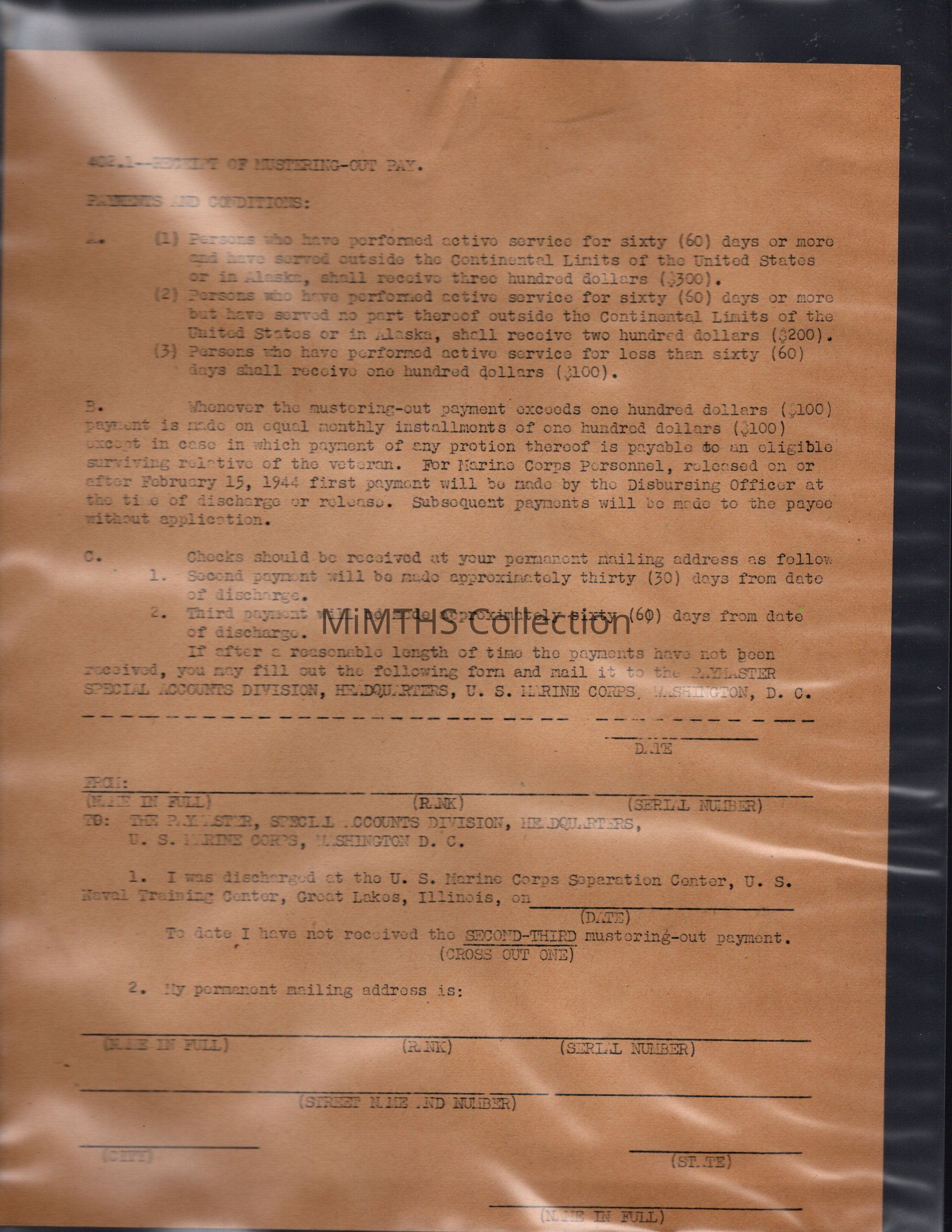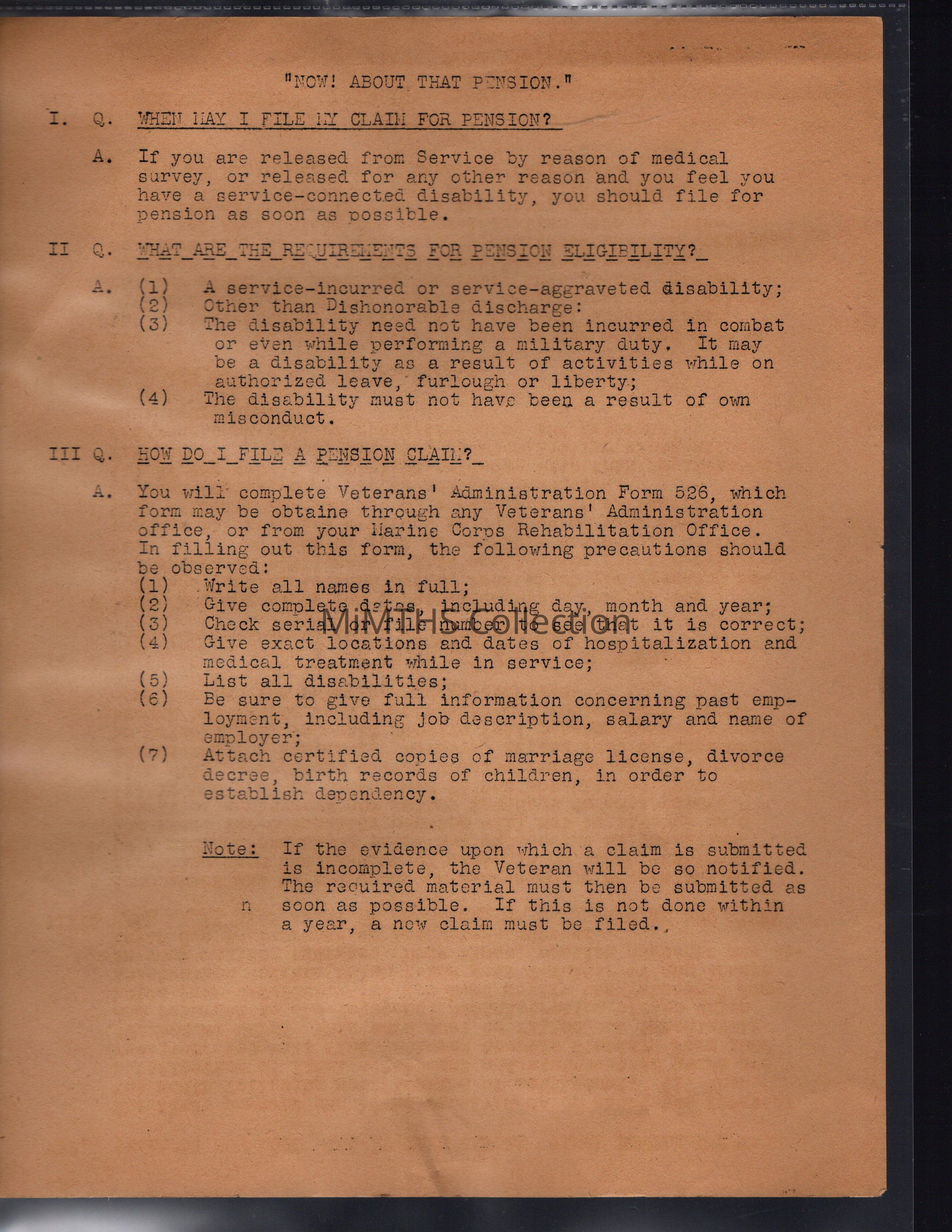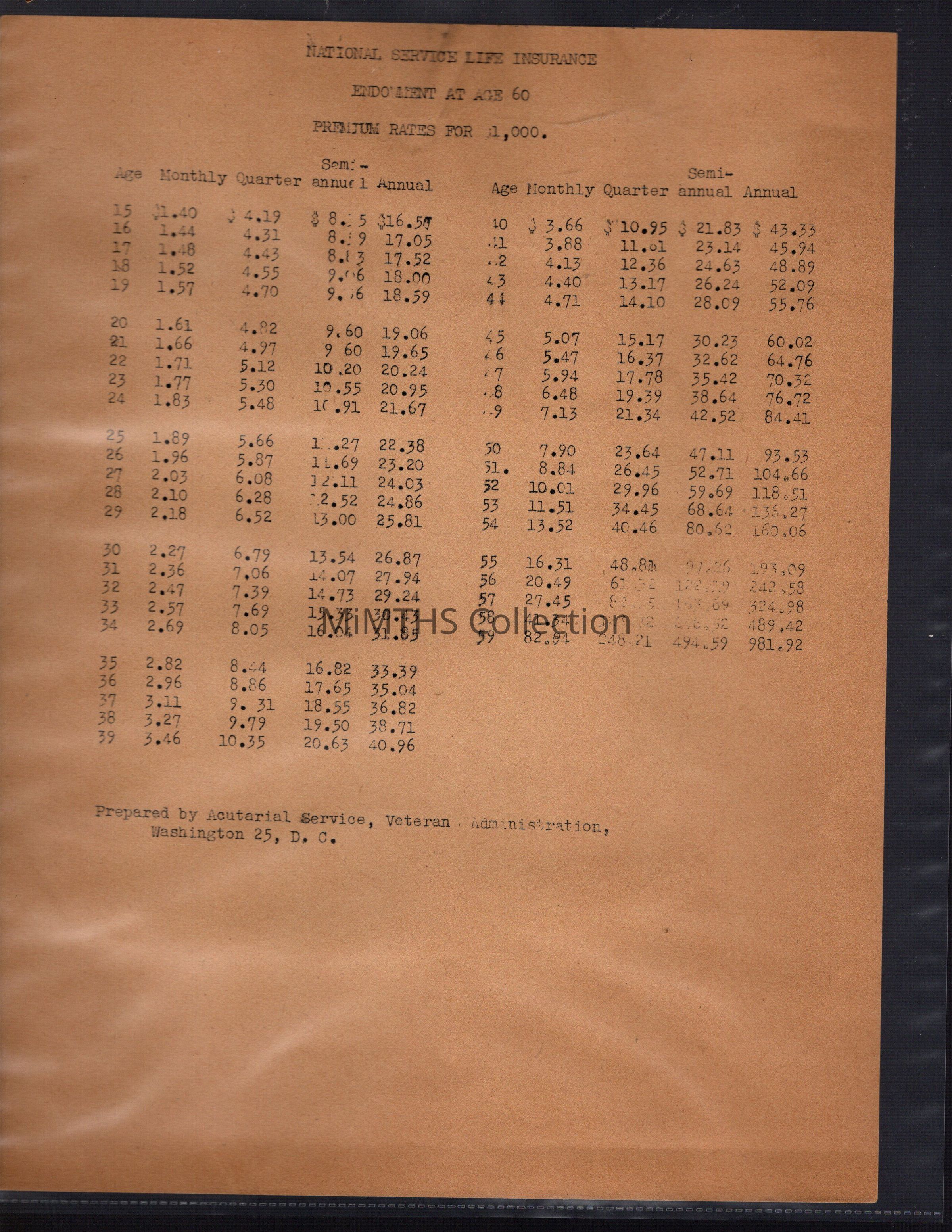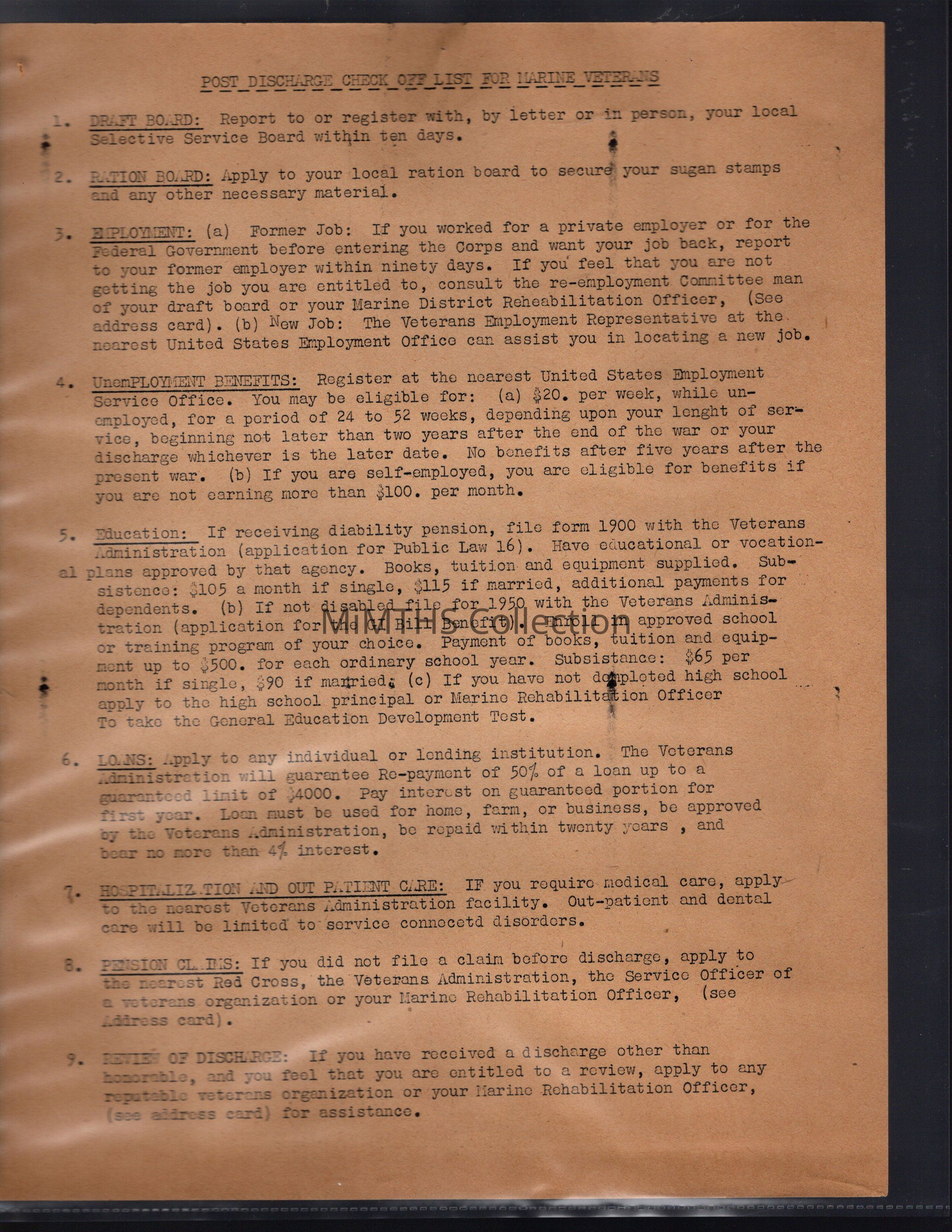Post Discharge documents from the Marine Corps, includes info on registering war souvenir firearms and National Service Life Insurance endowments and premiums from VA. Seven pages in binder.Cataloged By