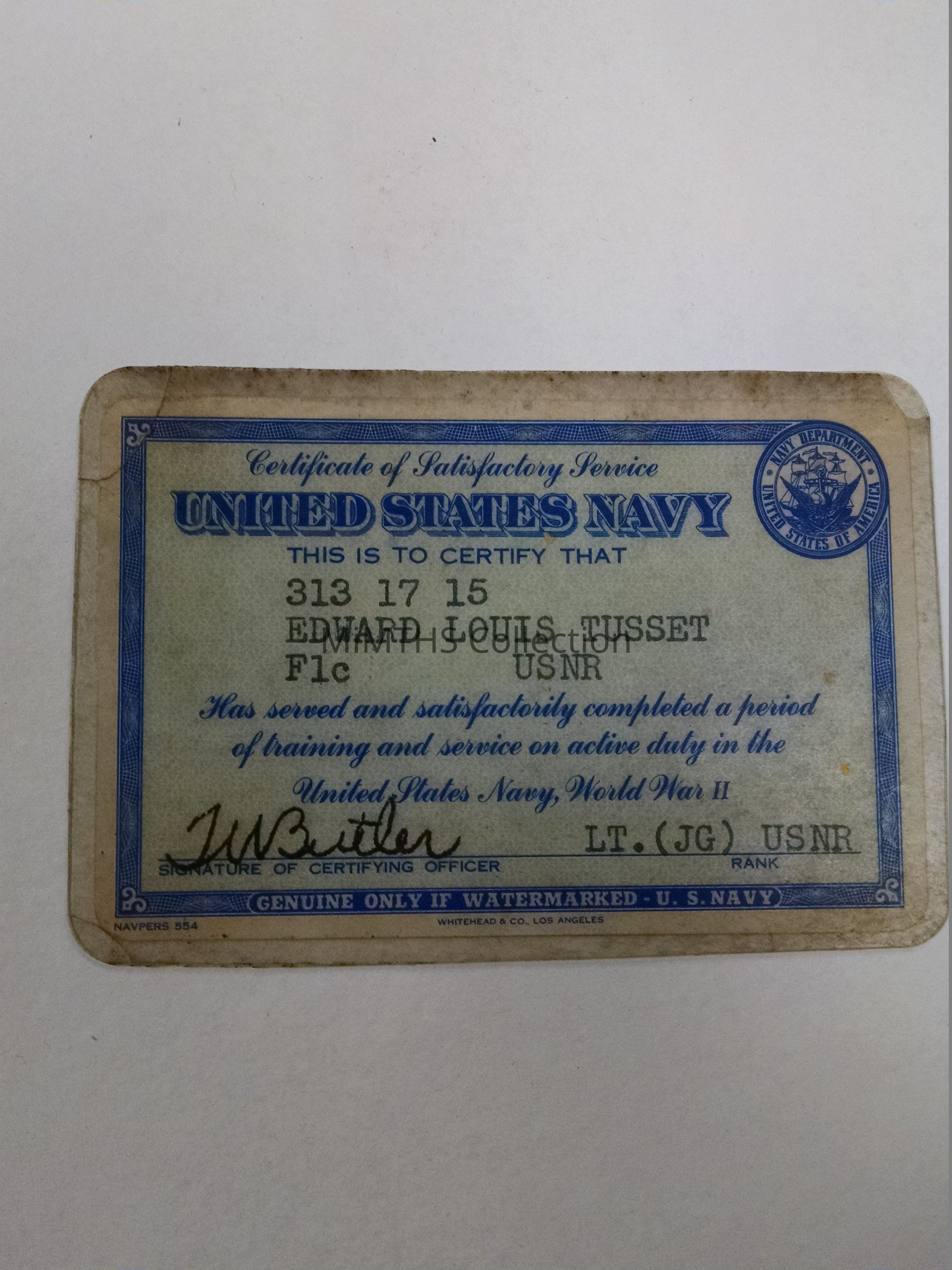 Wallet card indicating that Edward Louis Tusset did serve honorably in the US Navy During WWIICataloged By