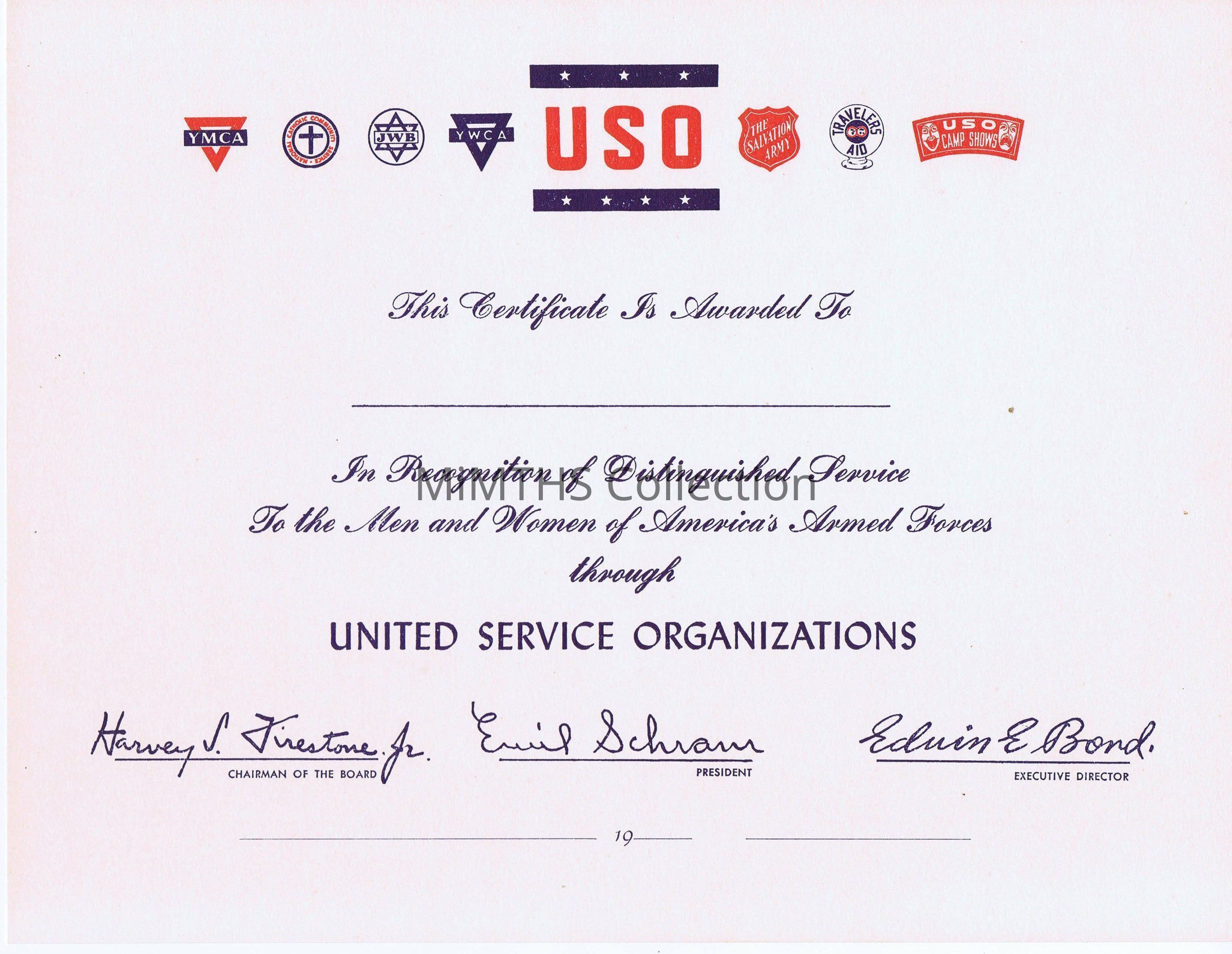 WWII era United Service Organizations Certificate of Distinguished Service. BlankCataloged By