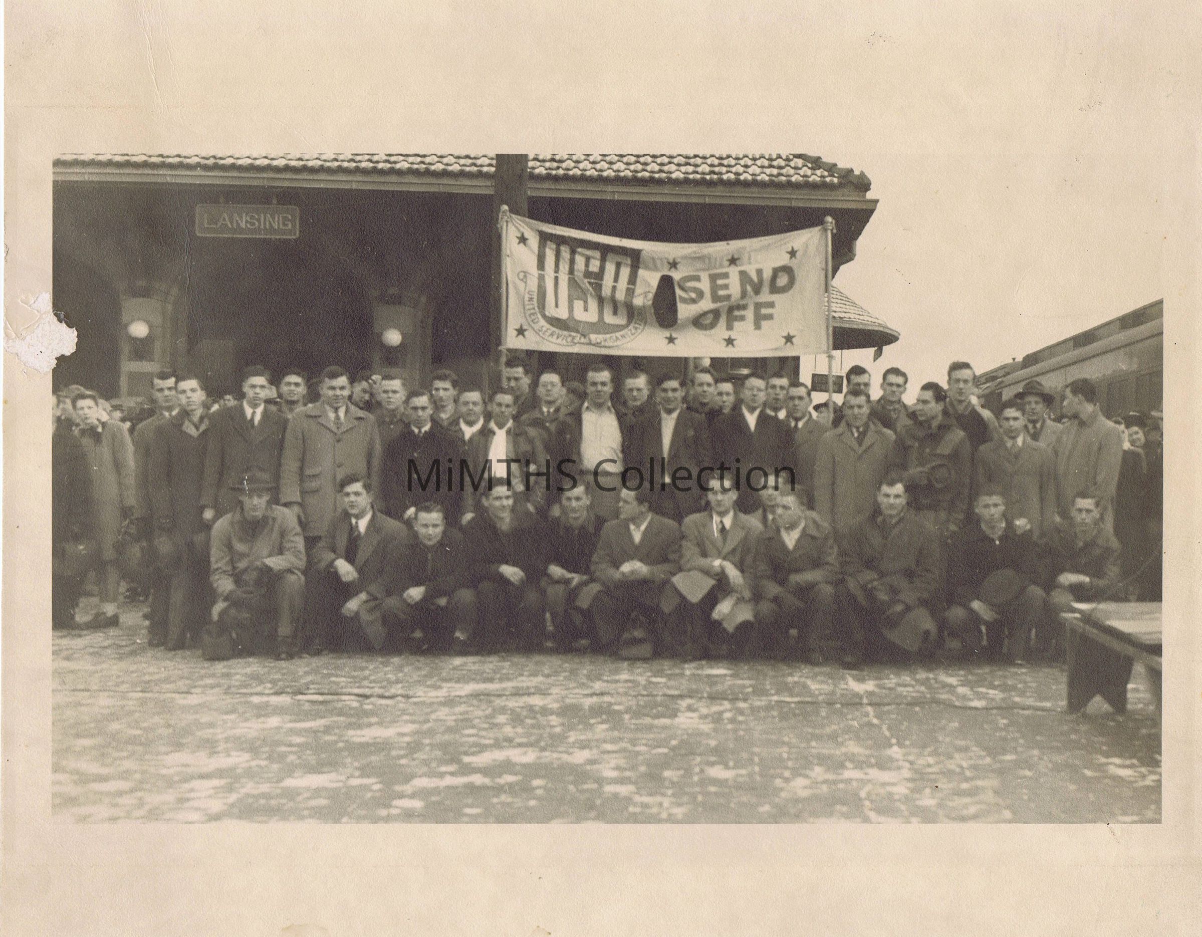 8.5x11" group of people holding USO Banner in Lansing Michigan Train StationPhotograph Details
