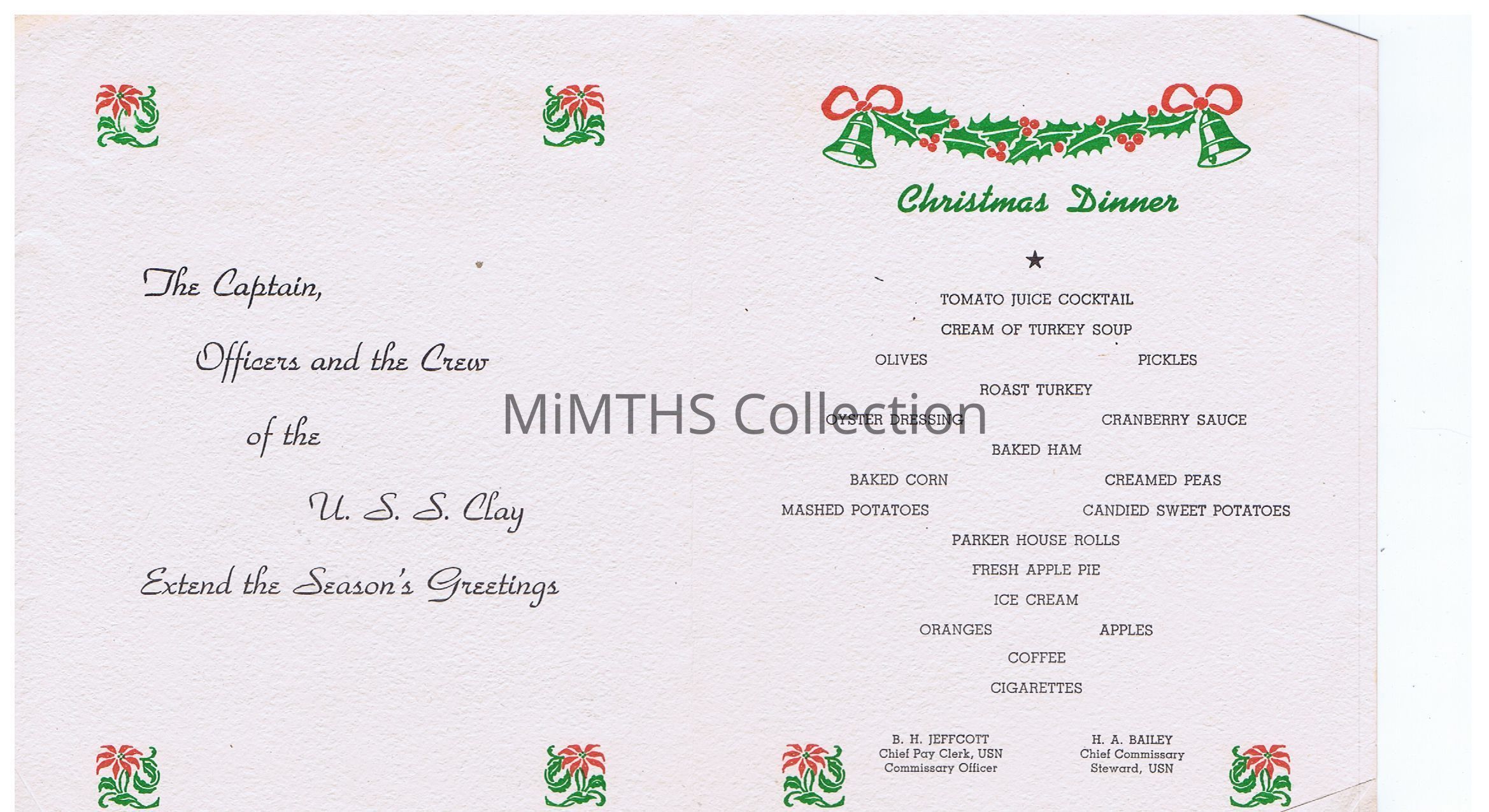 Inside left: "The Captain Officers and the Crew of the USS Clay Extend the Season's Greetings"