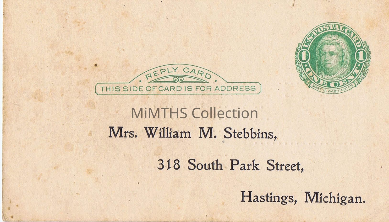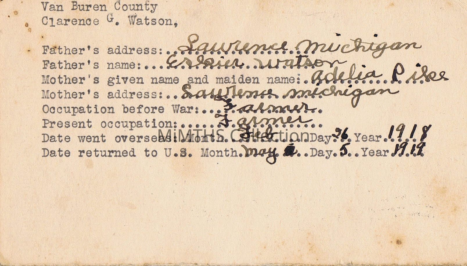 Post card addressed to Mrs. Wm. M. Stebbins in hastings Michigan verifying information on Veteran Clarence G. Watson. From the Watson collection.Cataloged By