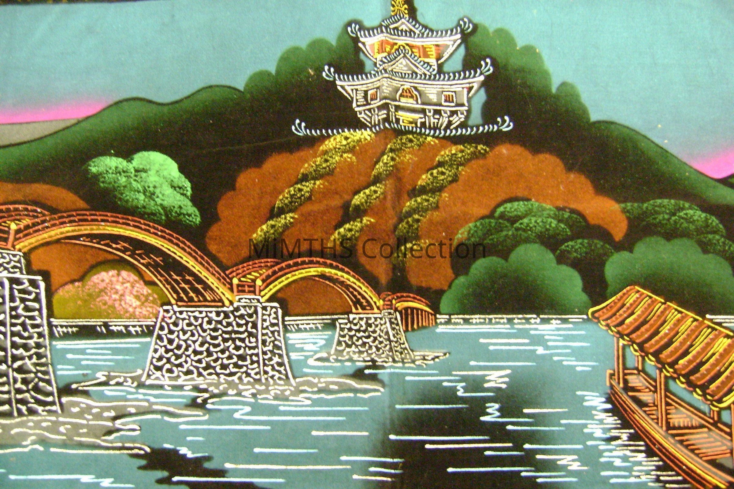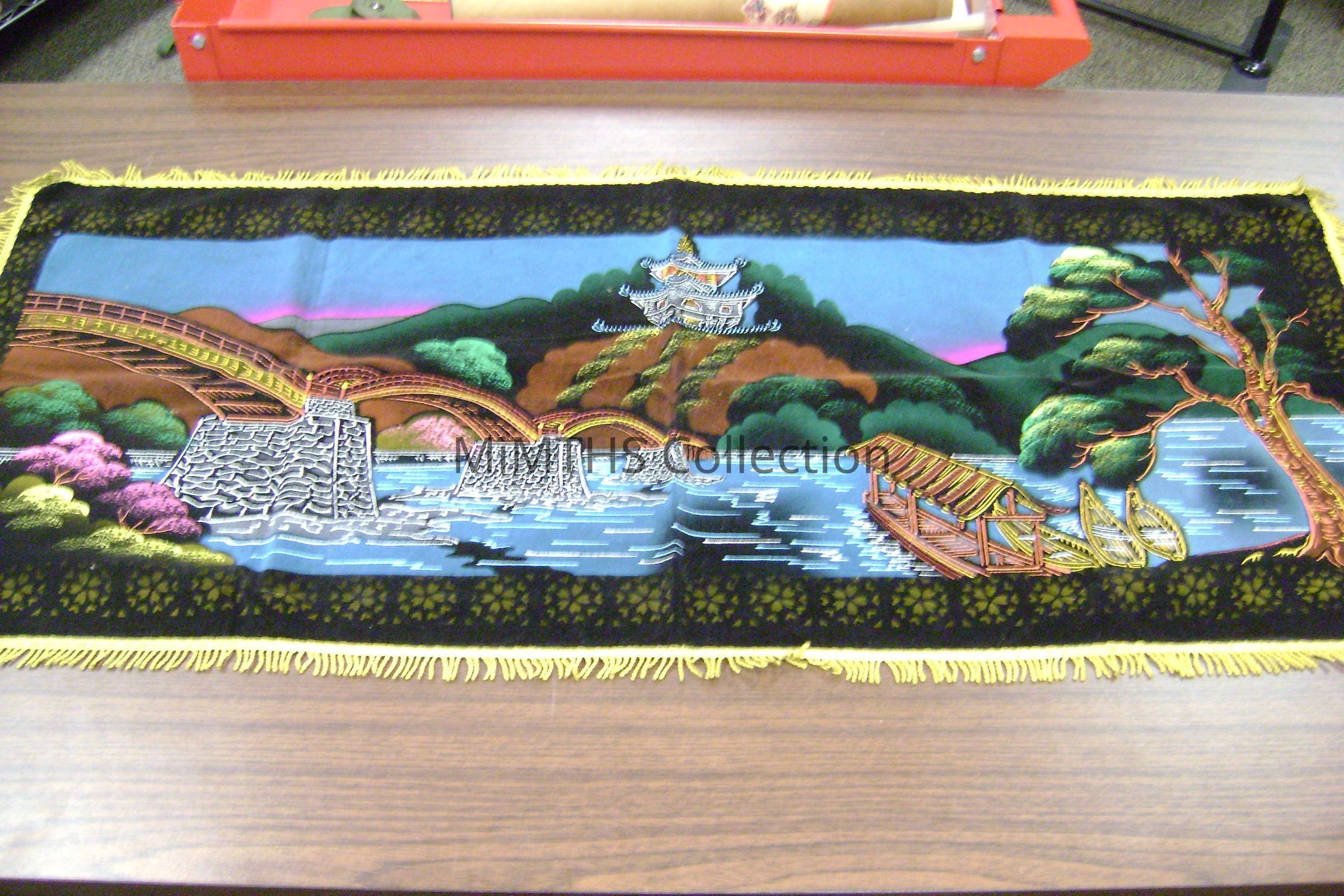3.5ftx1.5ft velvet banner with gold fringe. Depicts a Vietnamese river land scape with bridge and building in the distance.
