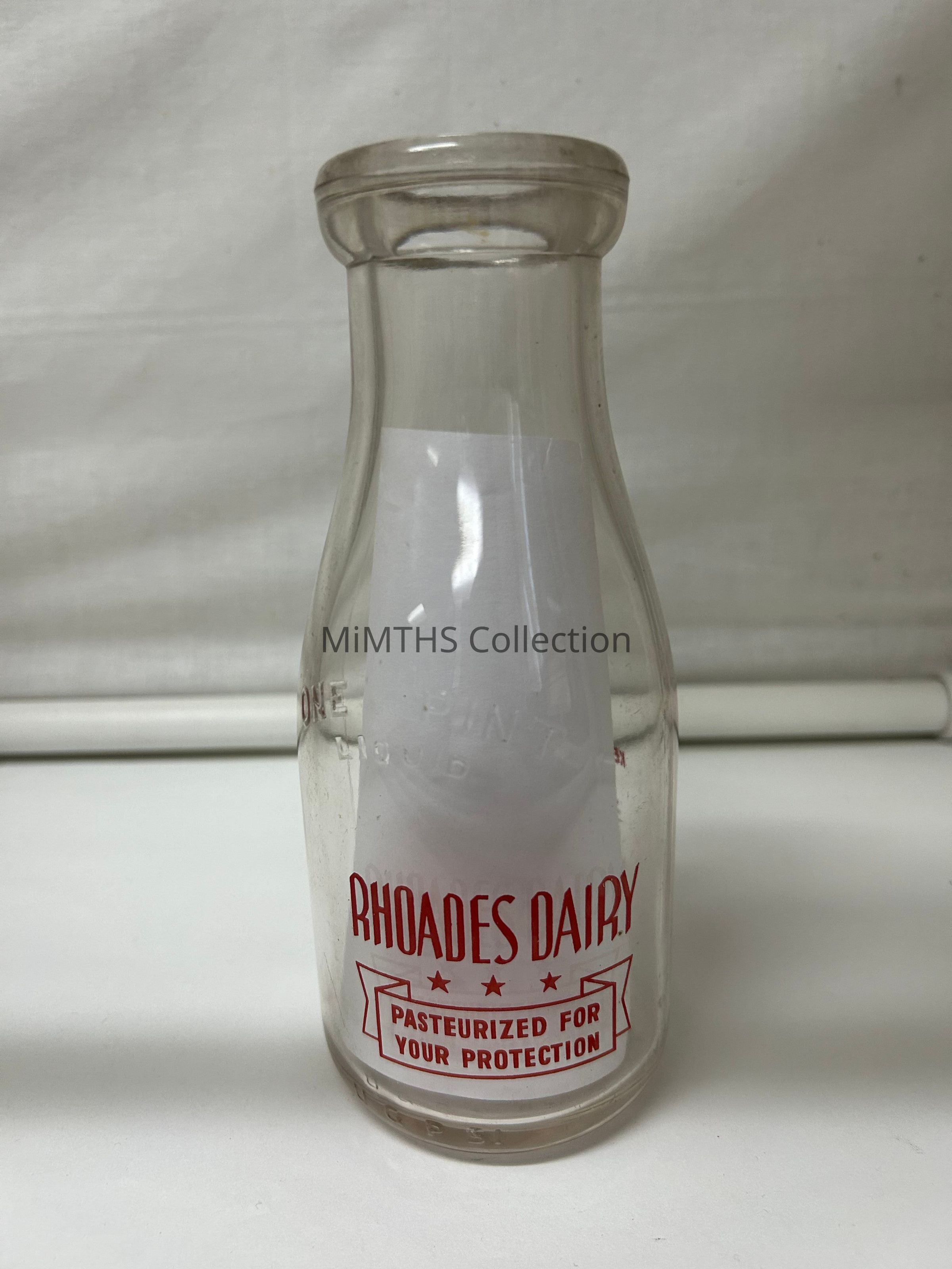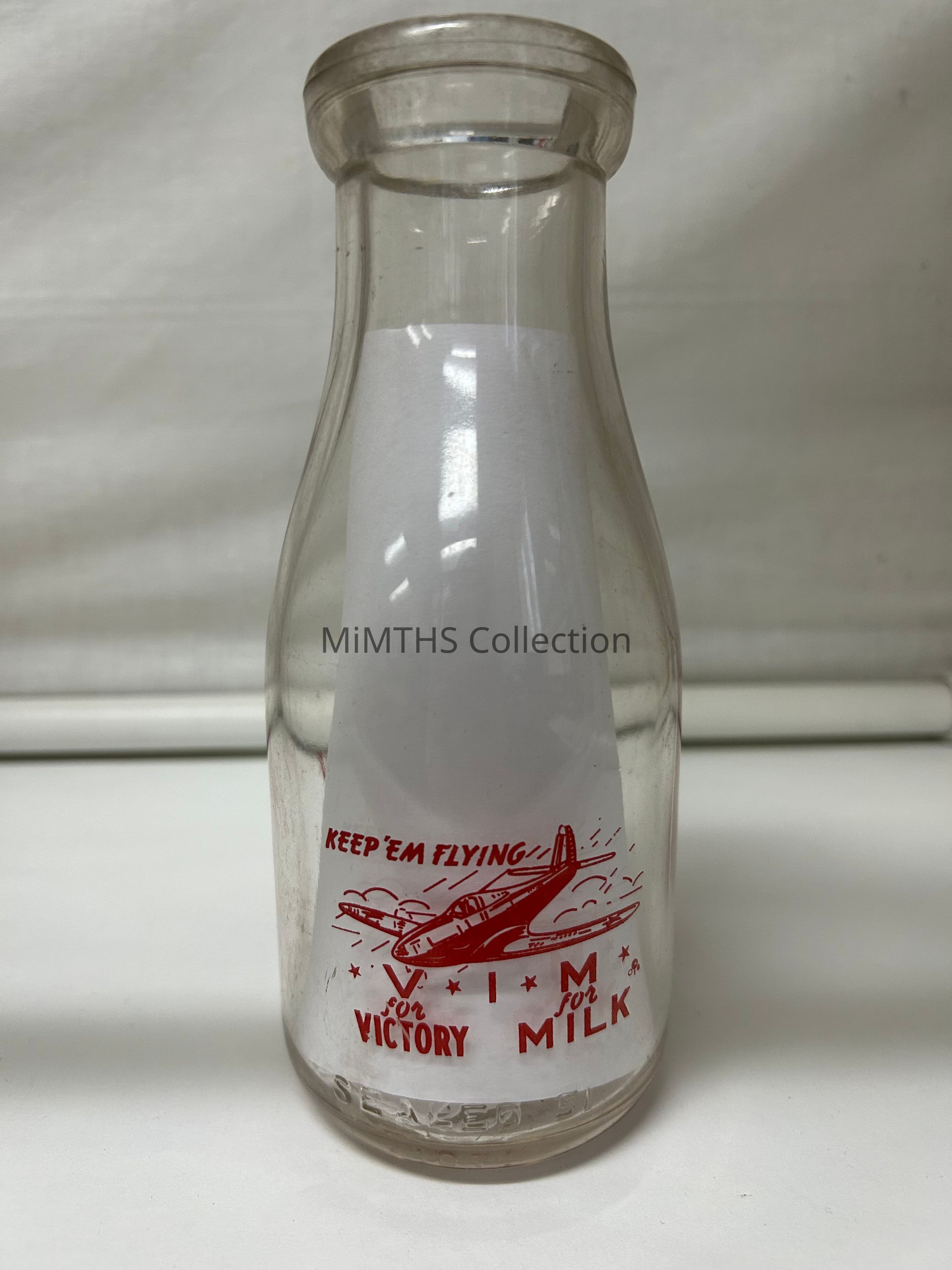 A one pint glass milk bottle from Rhoades Dairy with stylized P-39 and "V is for Victory, M is for Milk." On the back is Rhoades Dairy's logo and "pasteurized for your protection."Cataloged By