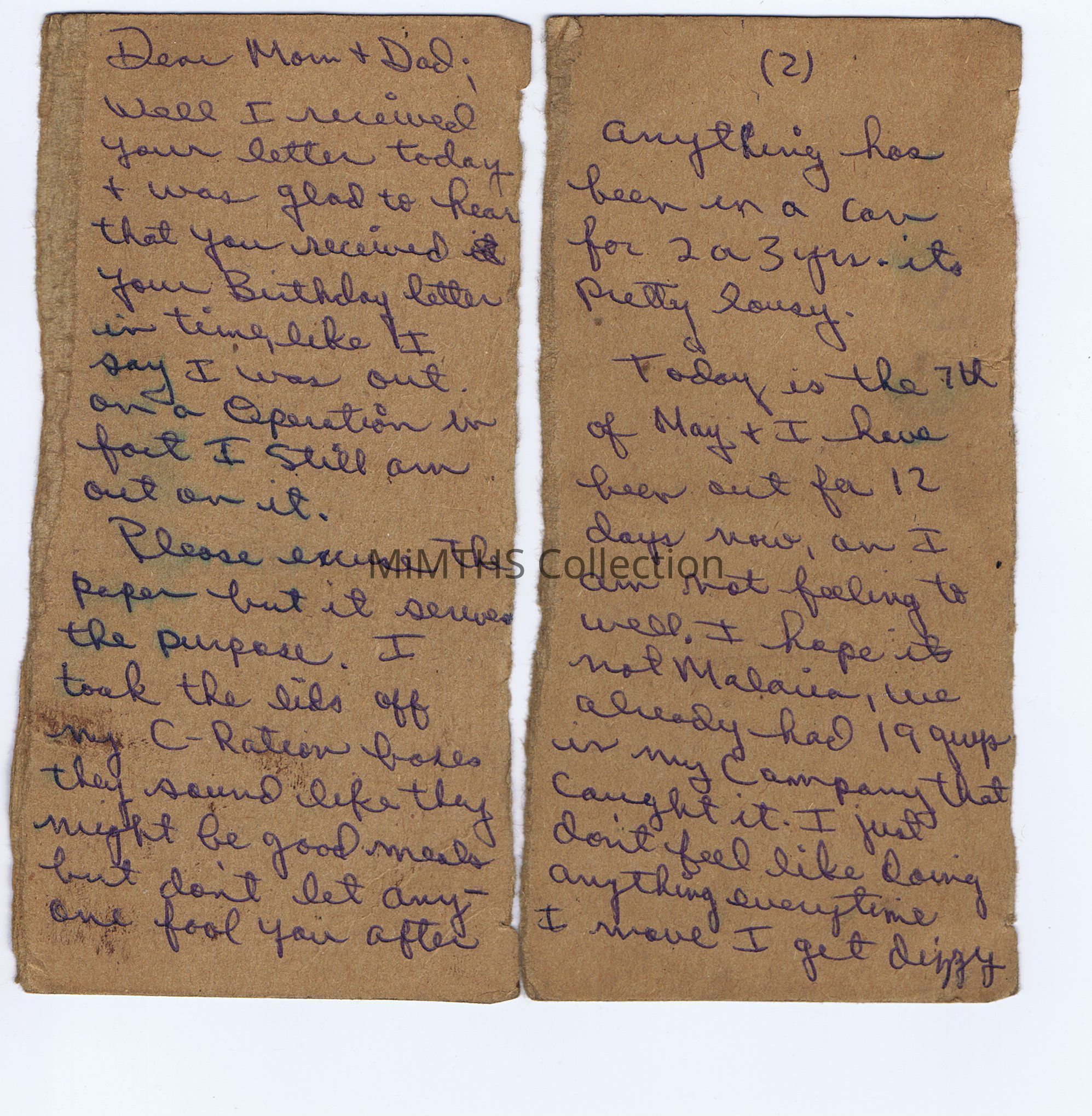 2 "page" letter written on the torn edges of a C ration box ("beef, spiced with sauce B-3 unit"). Each page is 6x3in. Dated 7th of May, no year. Might have had additional pagesCataloged By