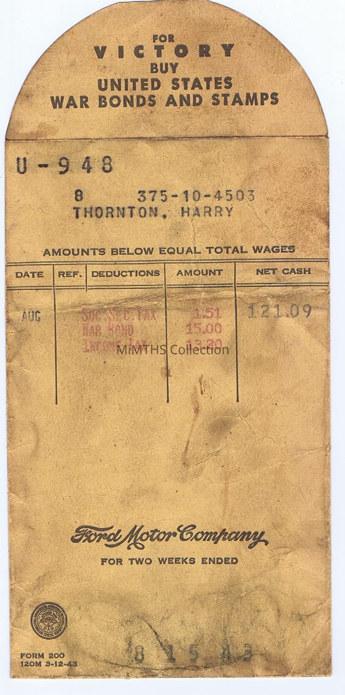 Ford Motor Company envelope and receipt for warbonds and paycheck for Harry Thornton (possibly Harry Eugene Thornton of Wayandotte?), from the Ford Motor Comapany paymaster