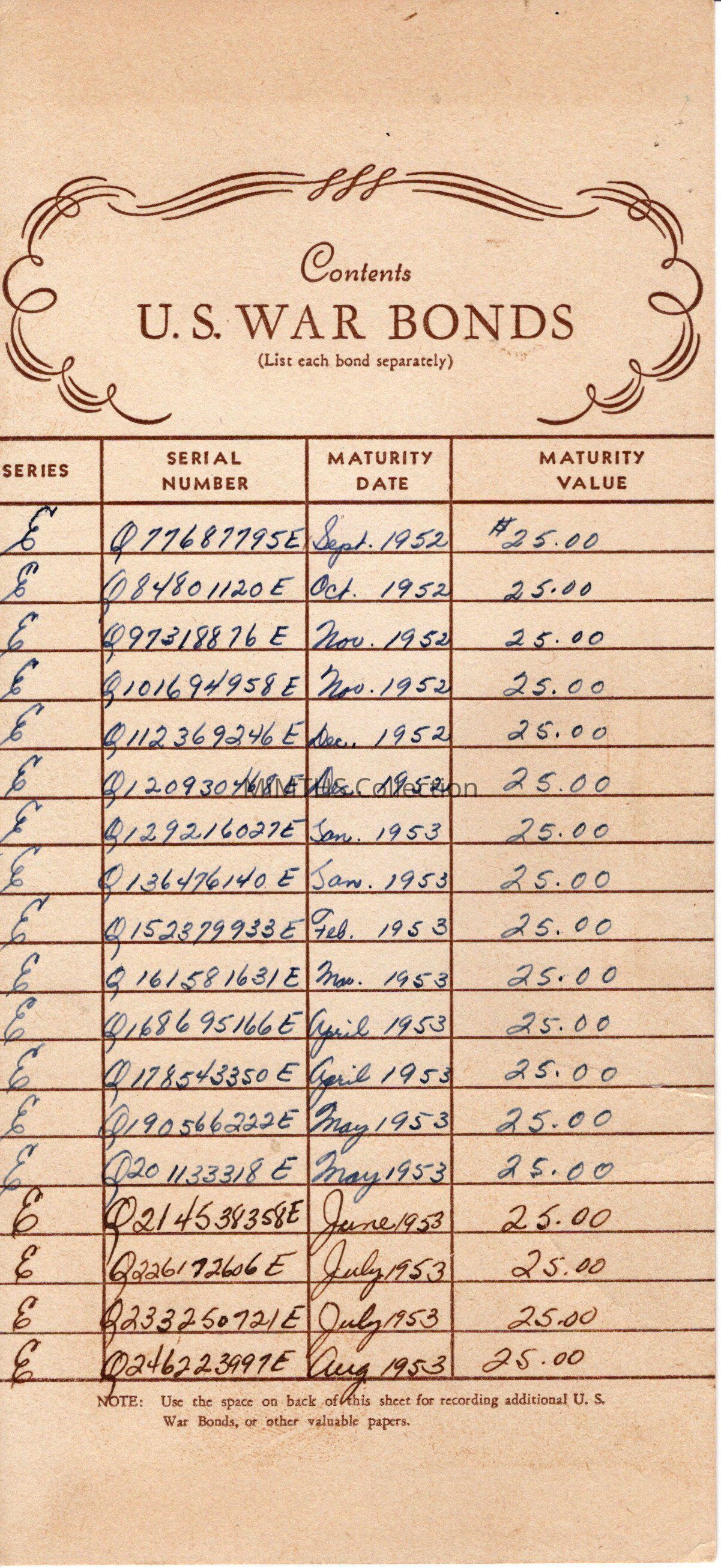 War Bond folder and insert listing bonds purchased, date and value. Korean War era.Cataloged By