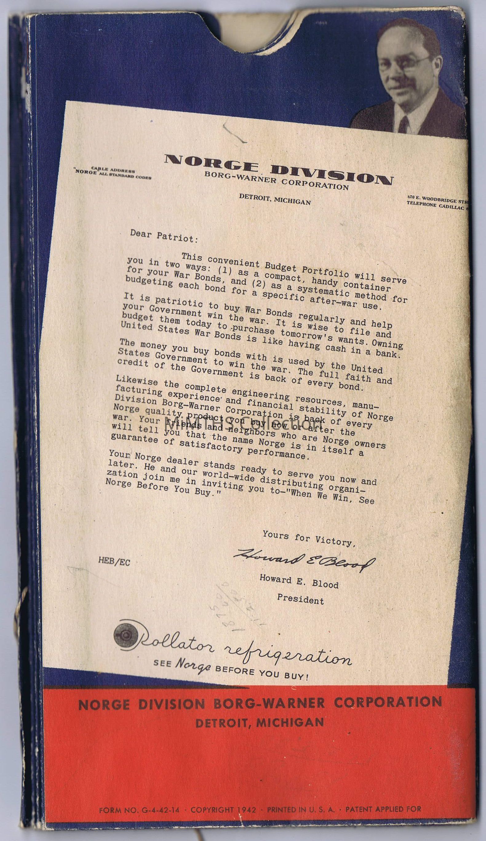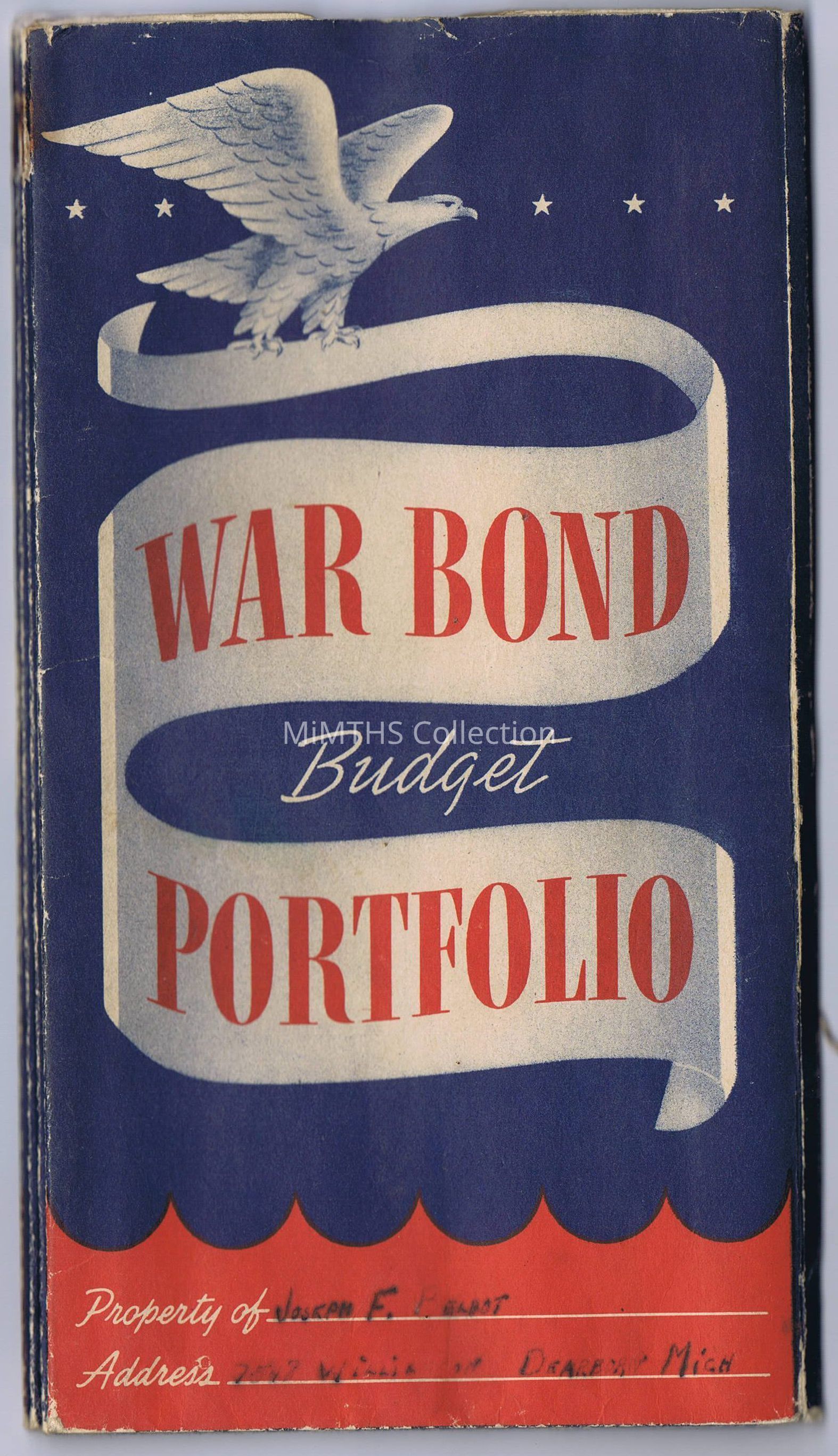 War Bond portfolio, from Joseph & Elenor Belbot of Detroit. The folio is from the Norge Division of Borg Warner Corp, Detroit. Filled out, this couple appear to have purchased many bondsCataloged By