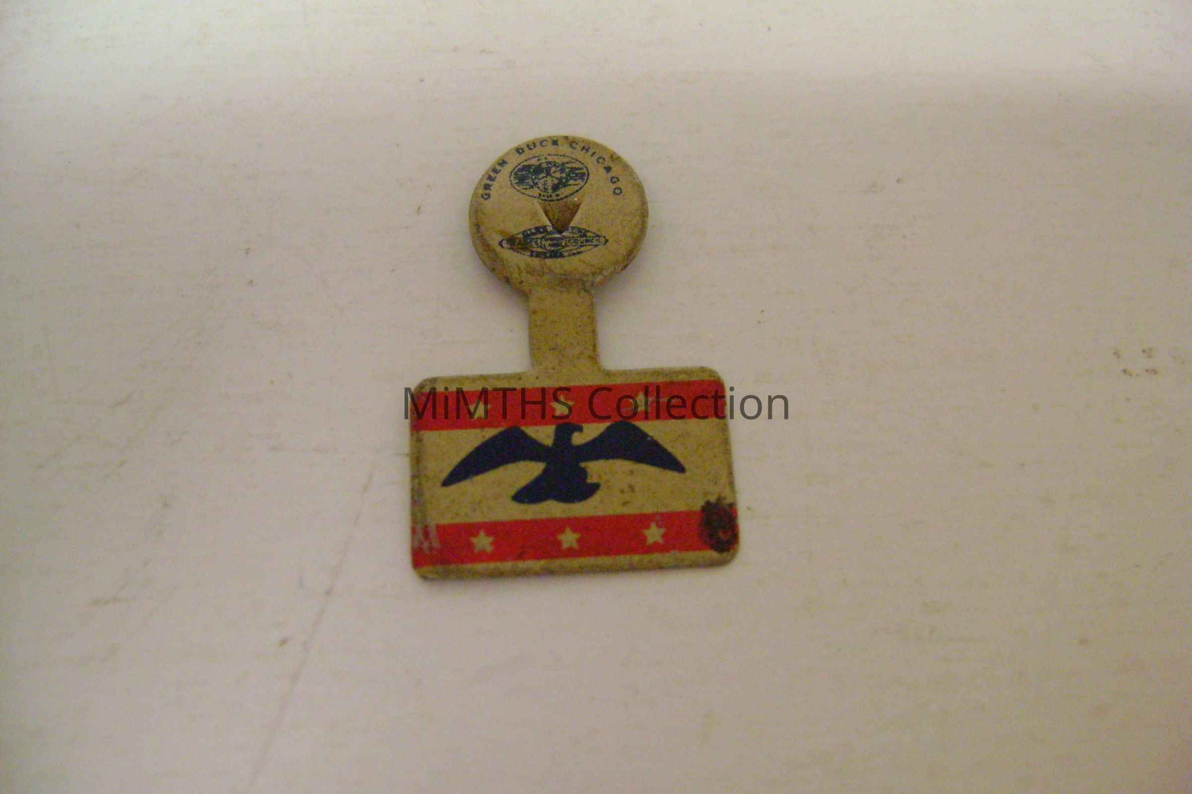 War Chest tab pin small rectangle with blue eagle, given "in recognition of Meritorious Service Rendered the 1943 United Community Campaign of the War Chest of Metropolitan Detroit." Belonged to Mrs. HalbenCataloged By
