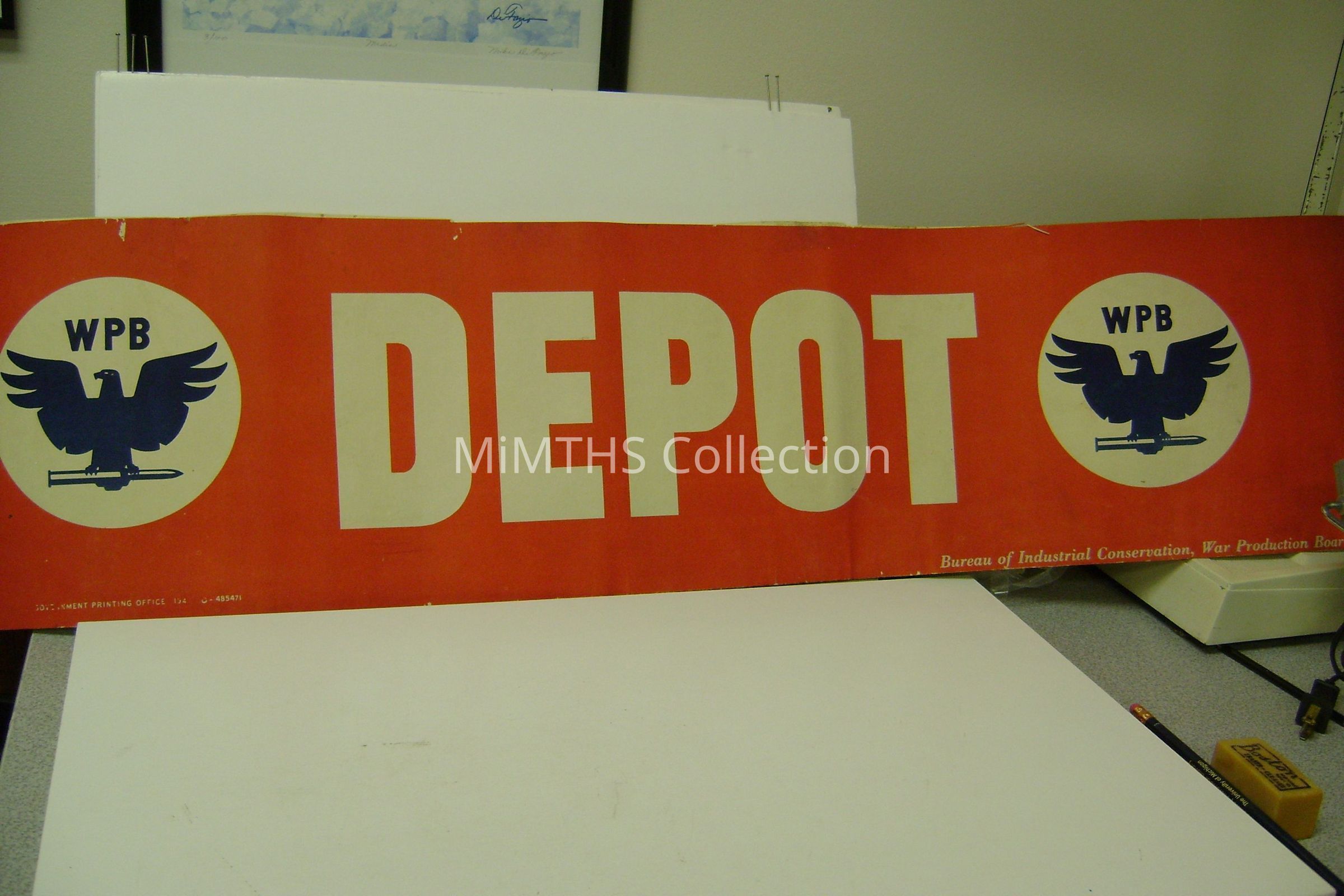 40"x9" red banner on heavy paper with the WPB logo on each end and "Depot" in the center. Donor says this was the bottom of a larger poster that was water damaged and this was what they saved.