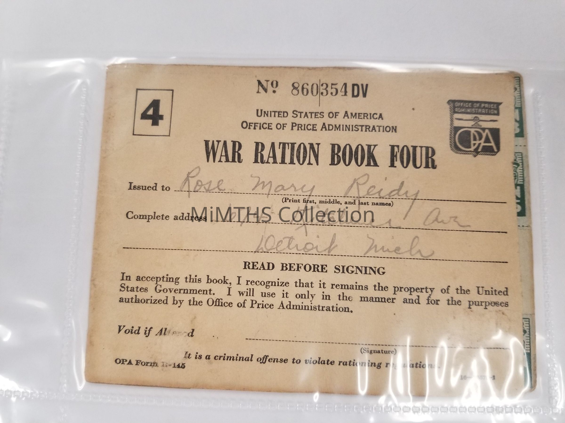 Office of Price Administration war ration book four, issued to Rose Reidy of Detroit MI. Still has a selection of stamps insideCataloged By