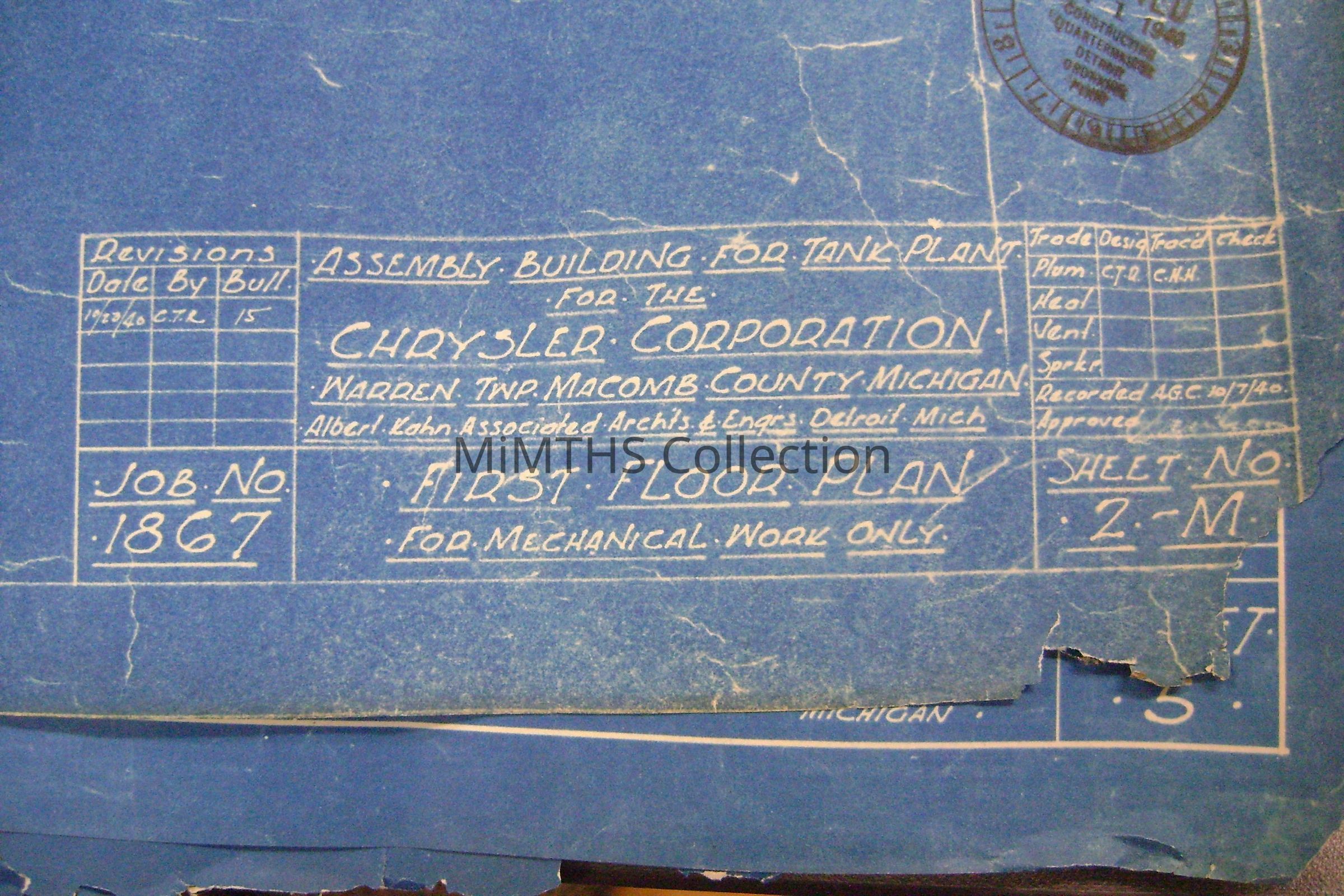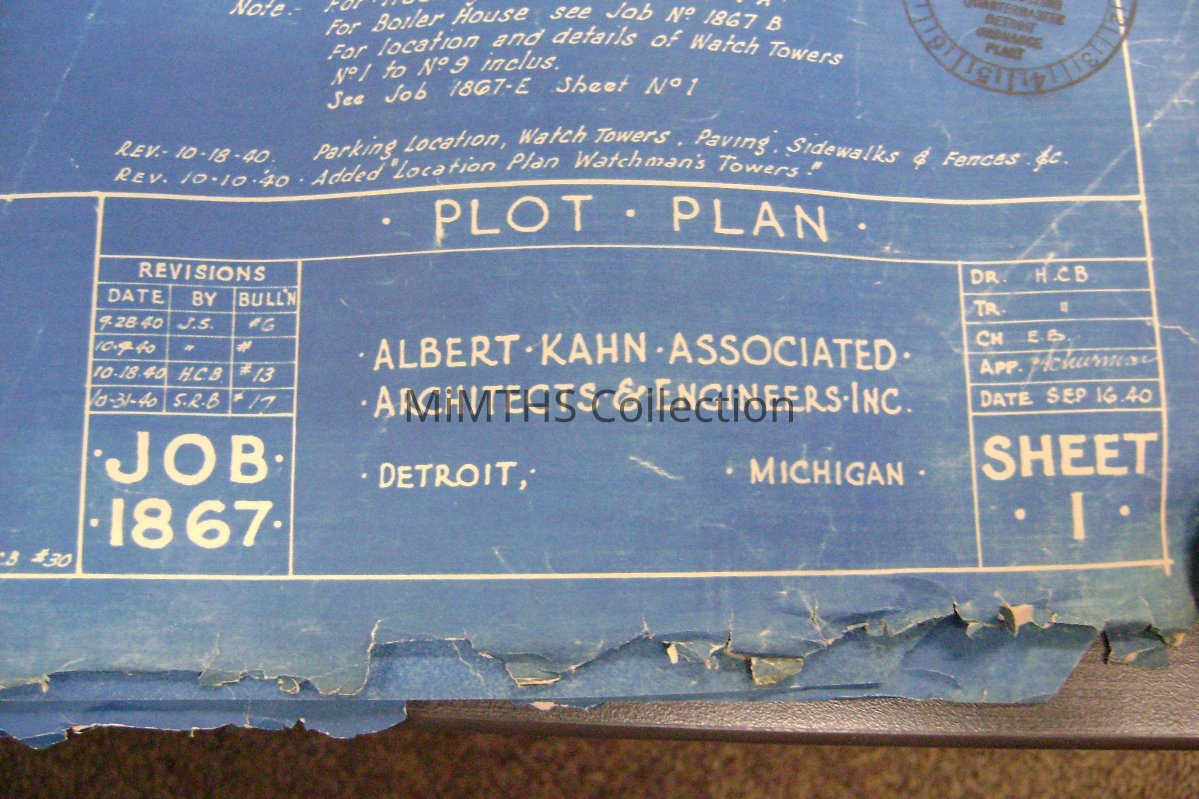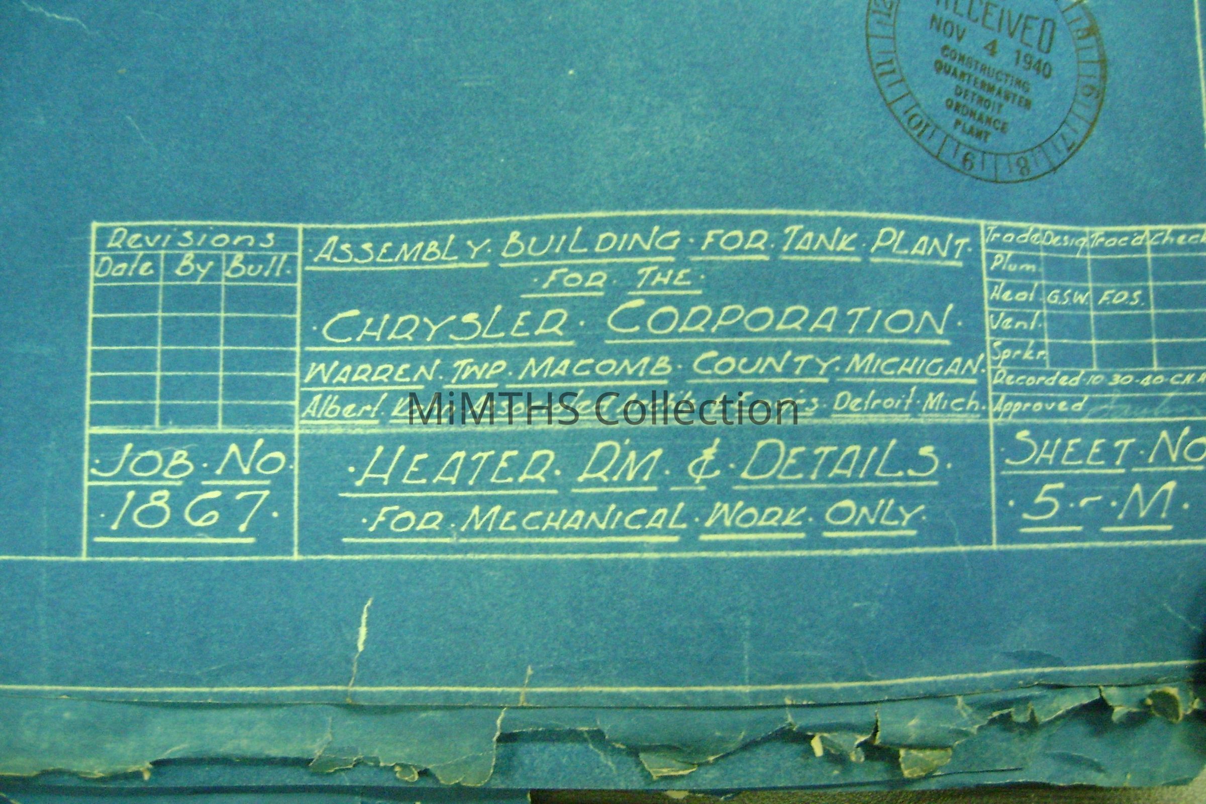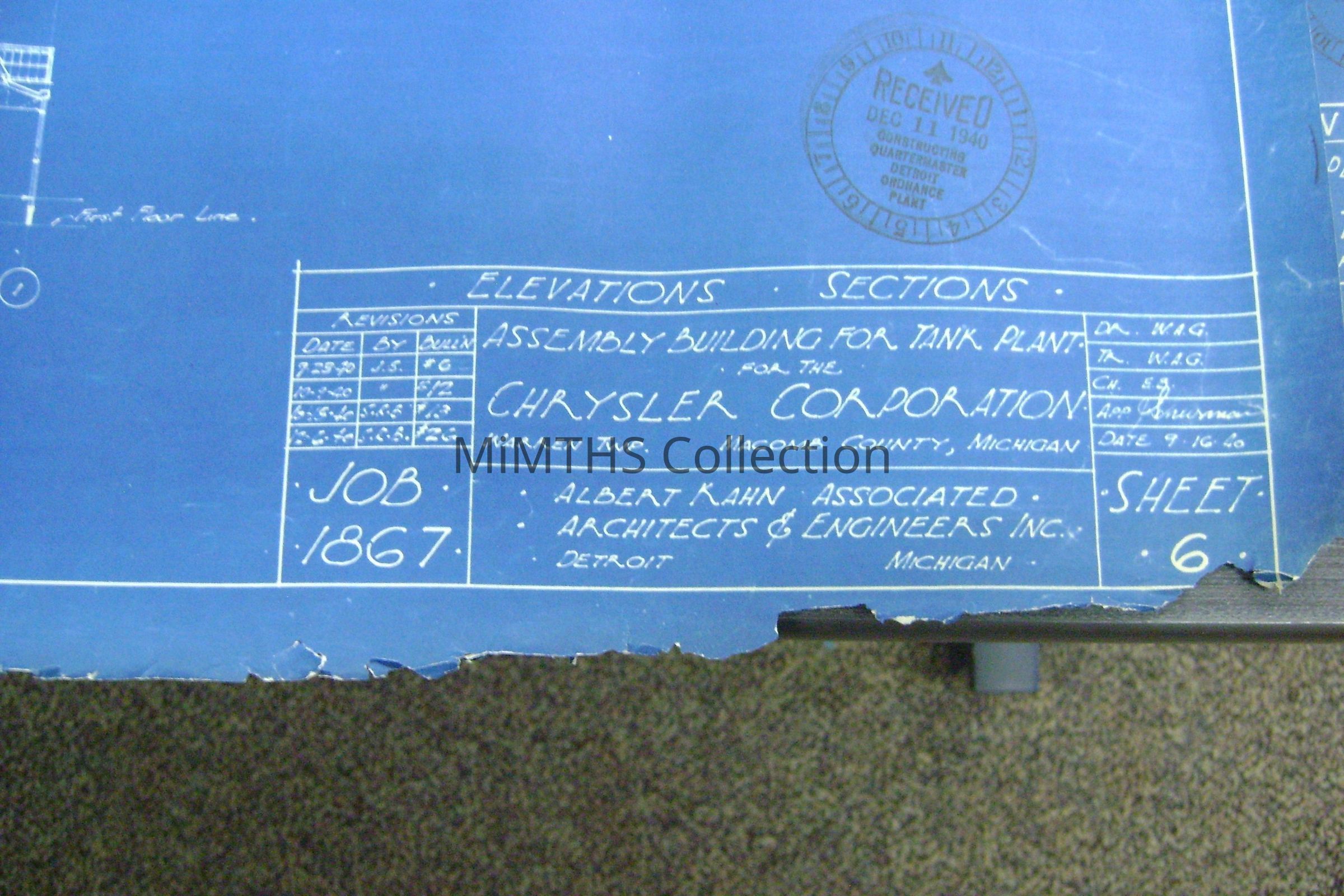 Set of blueprints from Albert Kahn Associated for the Chrysler Tank Plant. Nine drawings are 25"X56" two are 34"X17" and one 16"x24" hand drawn one. Drawing one is and overall site plan, two show east and west elevation, the rest are infrastructure drawings. Two smaller ones are production schedules.