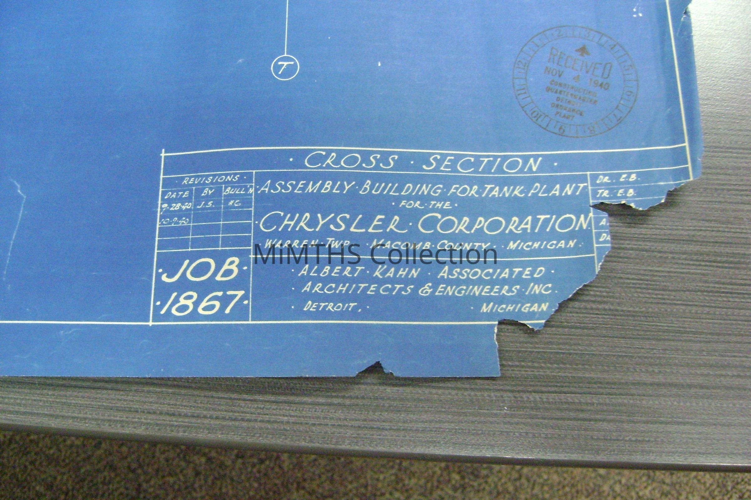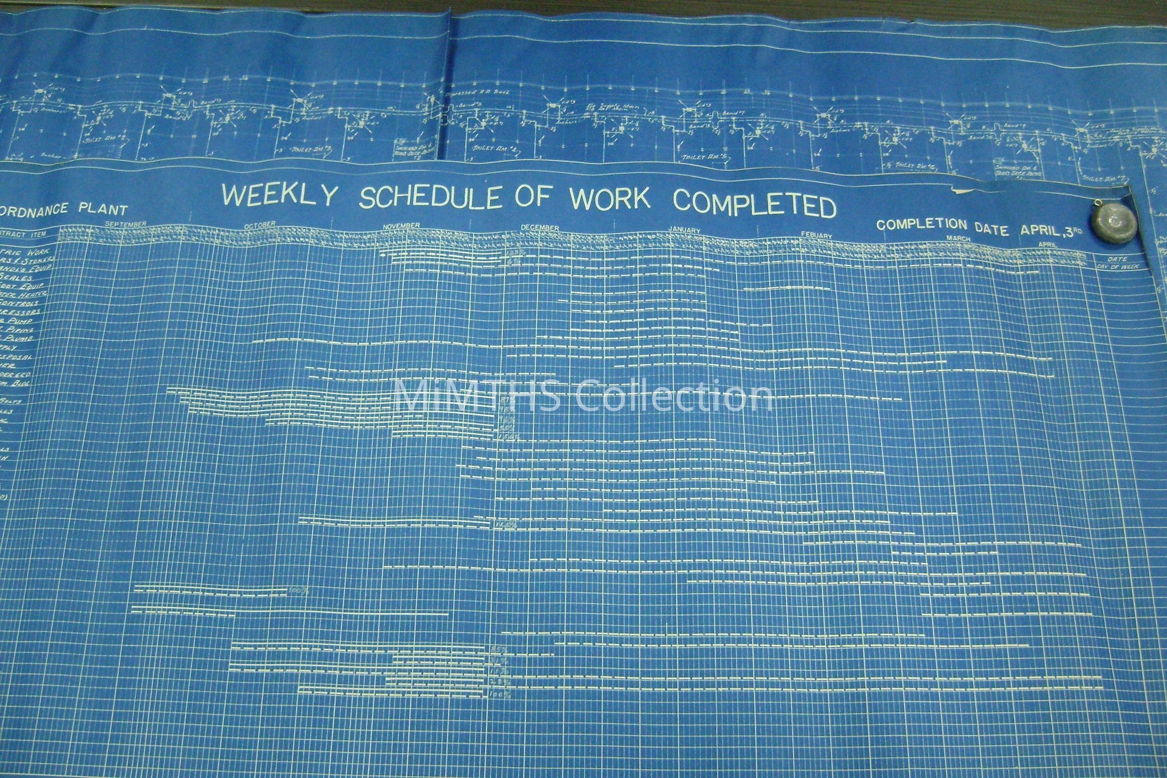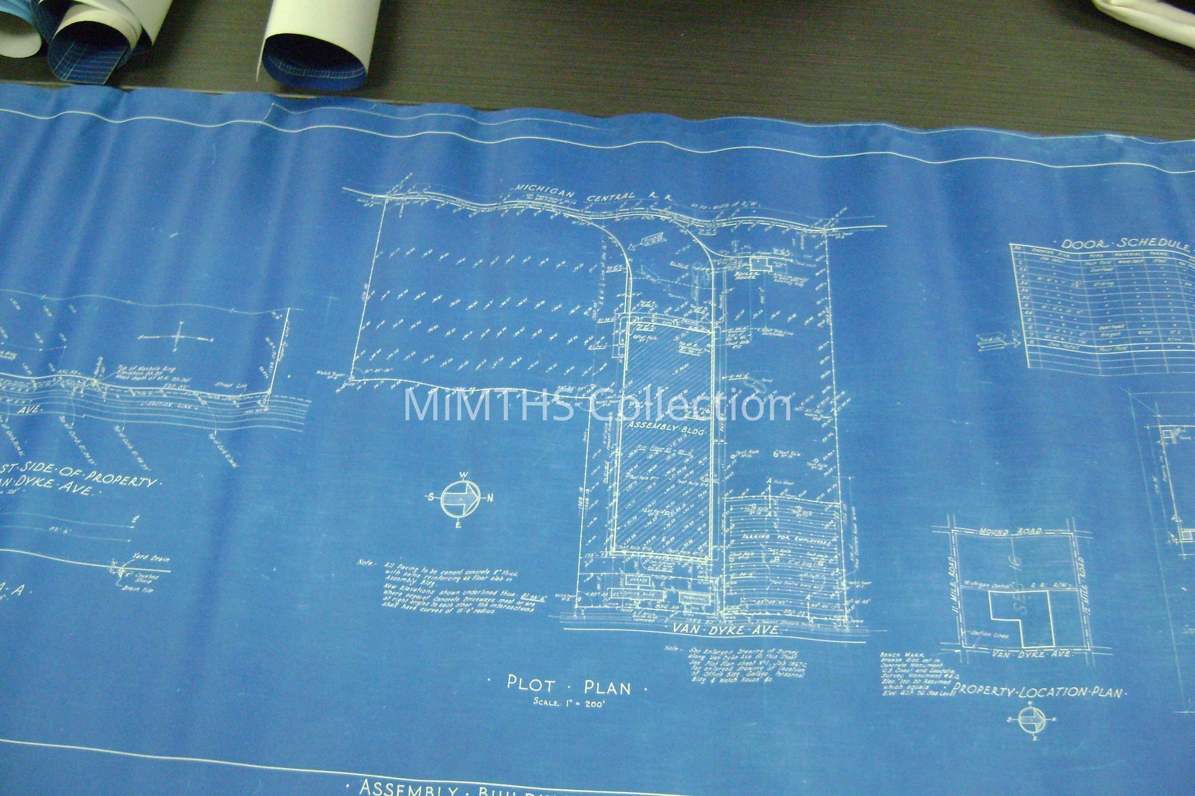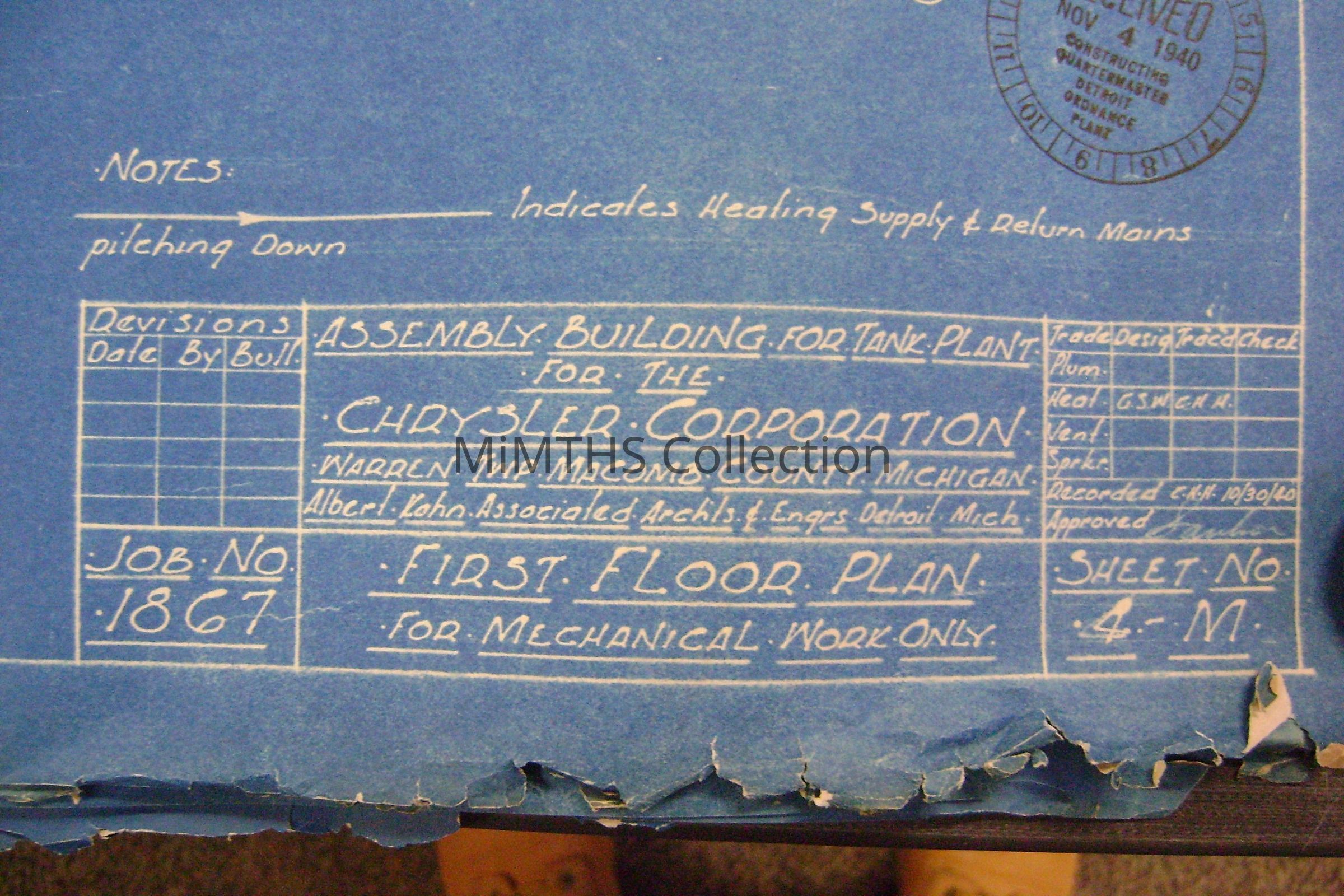 Set of blueprints from Albert Kahn Associated for the Chrysler Tank Plant. Nine drawings are 25"X56" two are 34"X17" and one 16"x24" hand drawn one. Drawing one is and overall site plan, two show east and west elevation, the rest are infrastructure drawings. Two smaller ones are production schedules.
