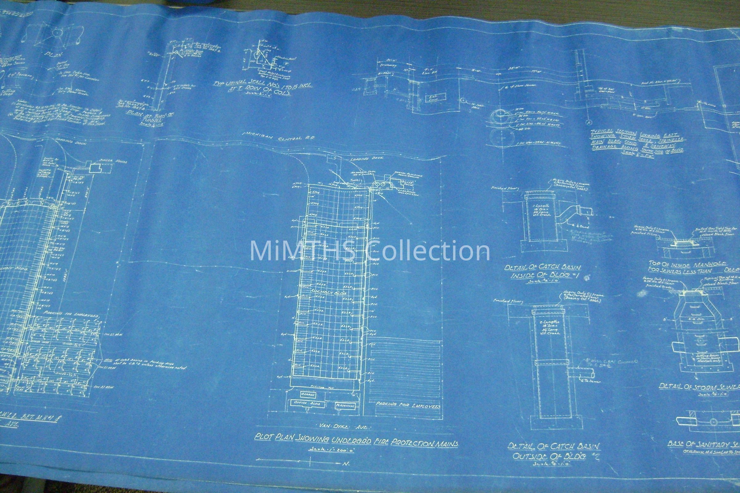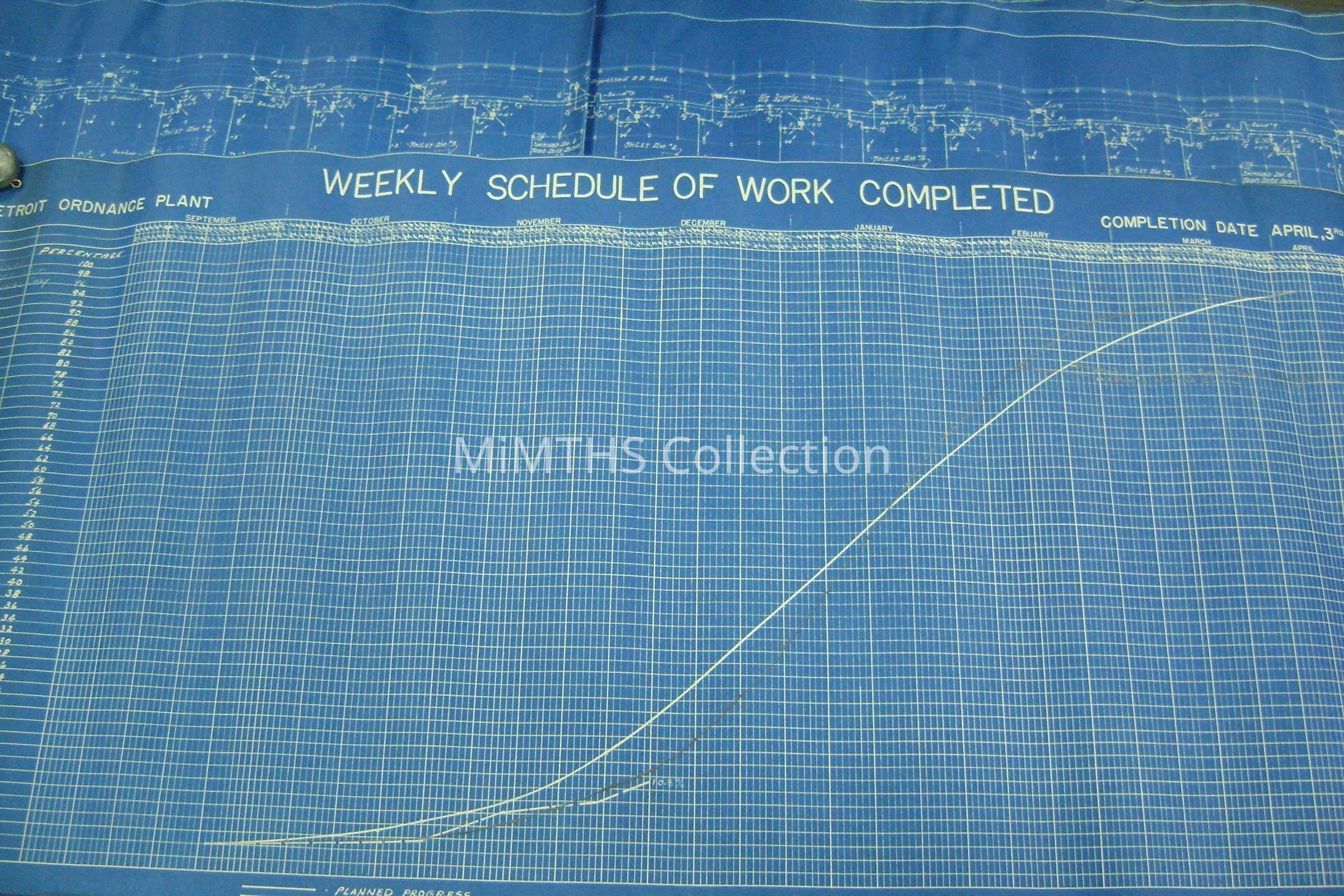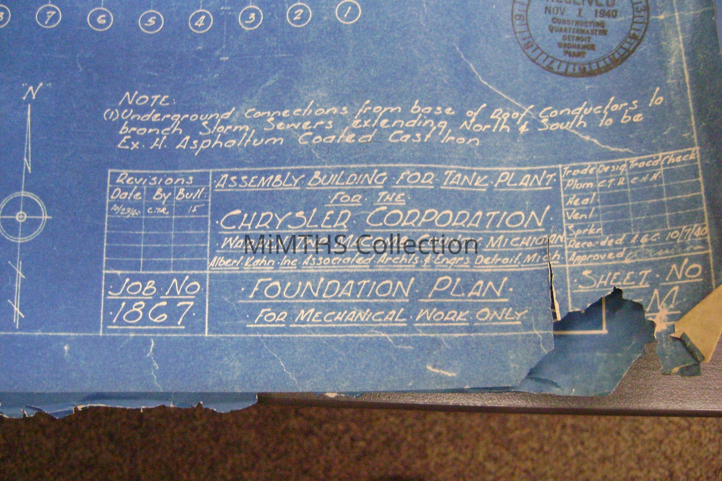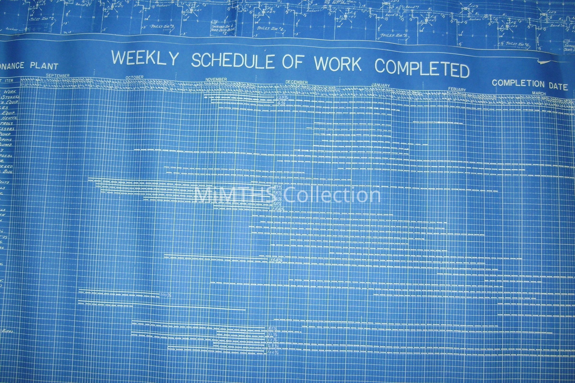 Set of blueprints from Albert Kahn Associated for the Chrysler Tank Plant. Nine drawings are 25"X56" two are 34"X17" and one 16"x24" hand drawn one. Drawing one is and overall site plan, two show east and west elevation, the rest are infrastructure drawings. Two smaller ones are production schedules.
