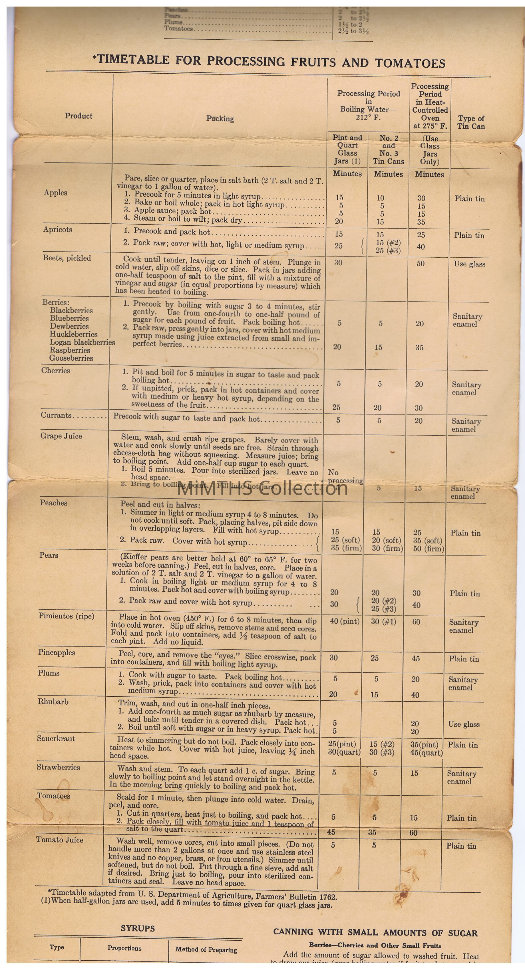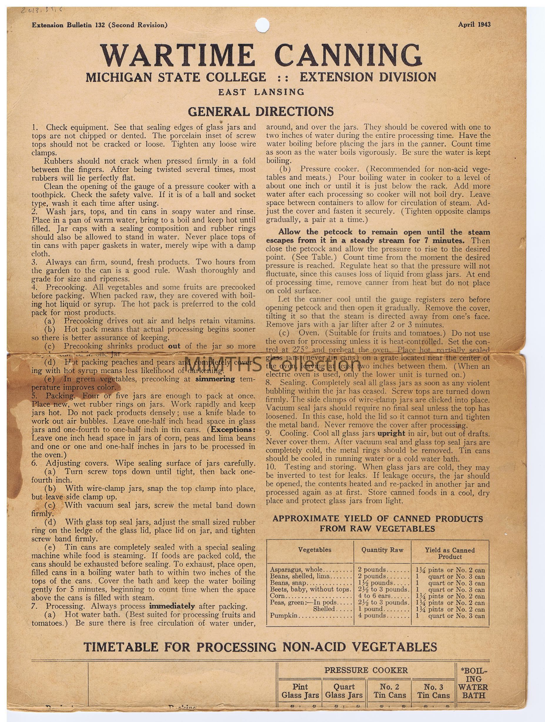 A double sided instructional chart for fruit and vegetable canning with limited sugar, created by Michigan State College, Extension Division, East Lansing.Cataloged By