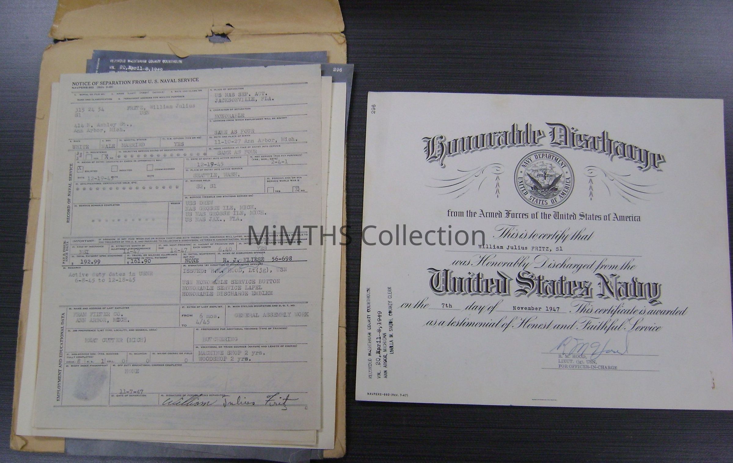 Document collection from Bill Fritz that tell of his 2 year service with the United States Navy. He was a Seaman Second Class aboard the USS Drew which served during the Pacific Theater of WWII and afterwards. He would be aboard ship during the post war clean up and recovery that it continued to do. Included are his discharge papers and a court copy of them, training certificate, two photographs, and a print out of the USS Drew.Cataloged By