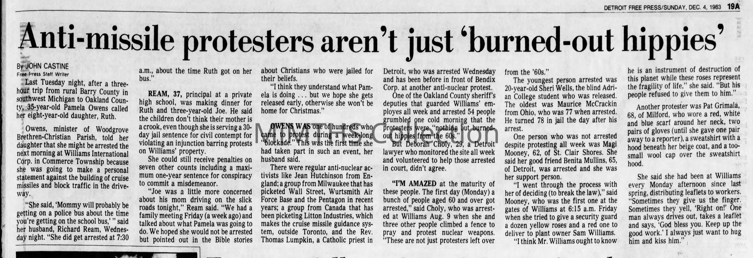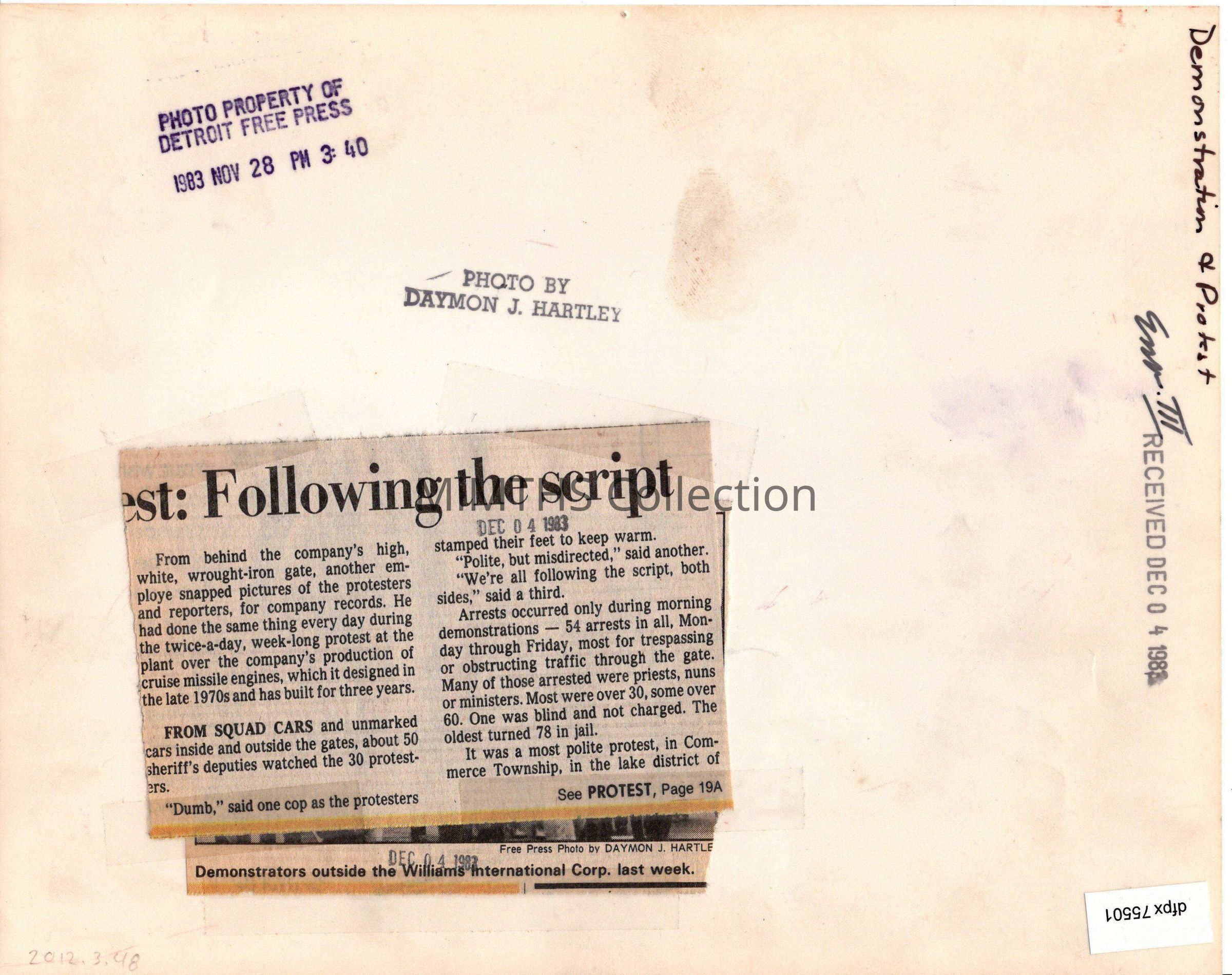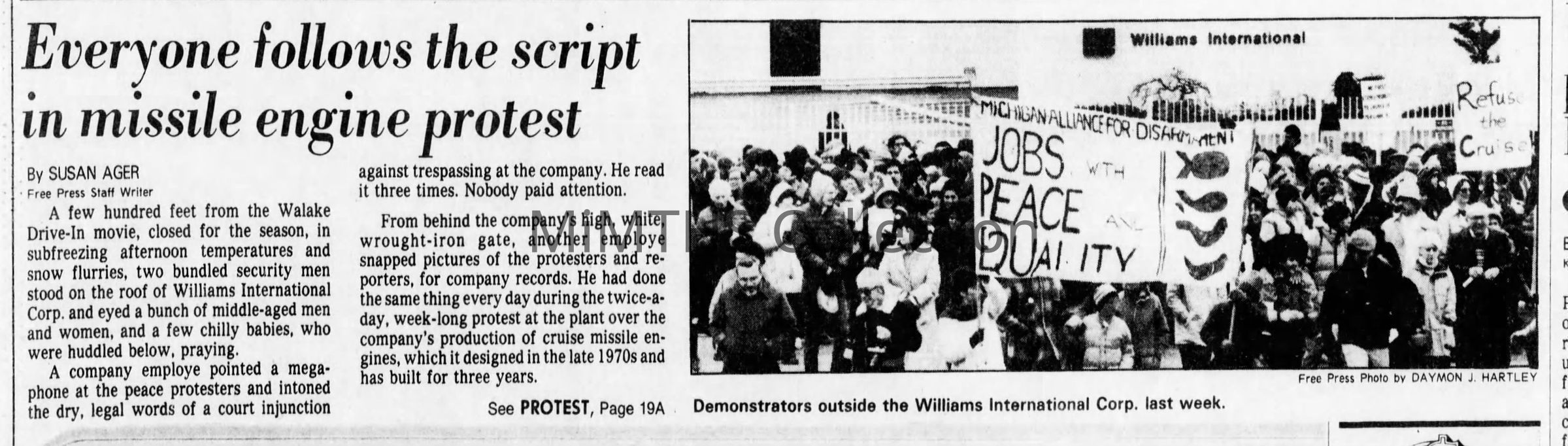 Detroit Free Press photo of an anti cruise missle protest outside Williams International plant in Commerce Township Nov 1983.