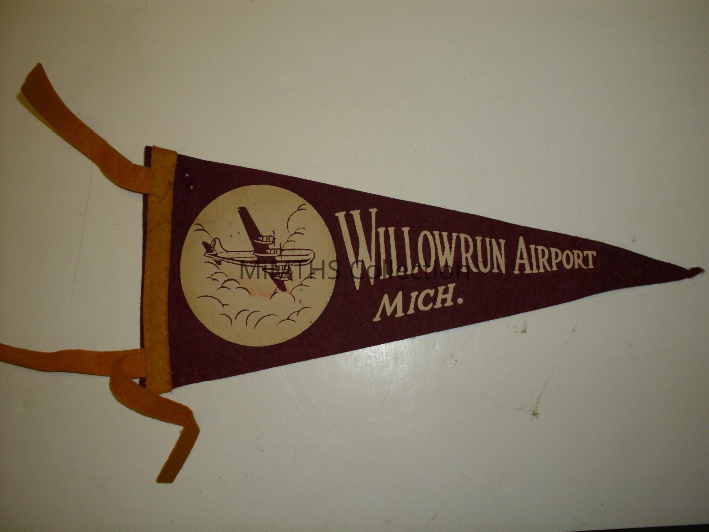 12" maroon felt pennant with yellow ties and Willow Run Airport inked on.Cataloged By