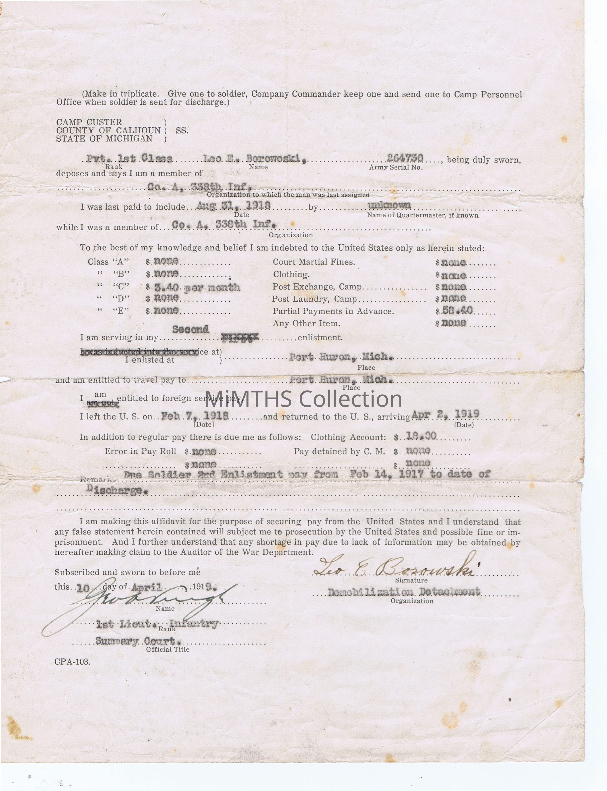 Allotment form for Pvt. 1st class Leo E. Borowski on discharge from Co. A 339th Inf at Camp Custer April 10, 1919Cataloged By