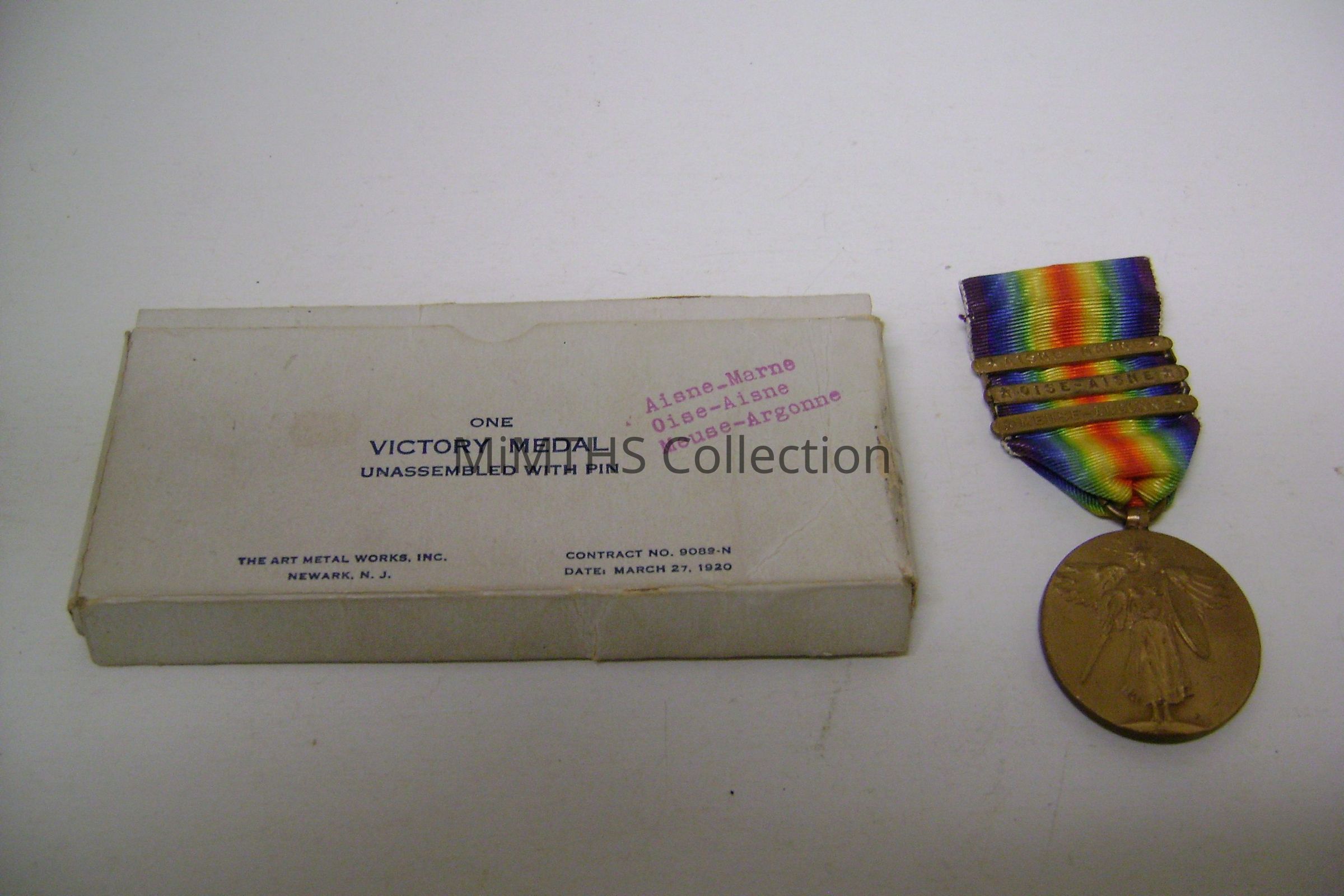 Victory Medal with battle clasps for Aisne-Marne, Oise-Aisne, and Meuse-Argonne.Cataloged By