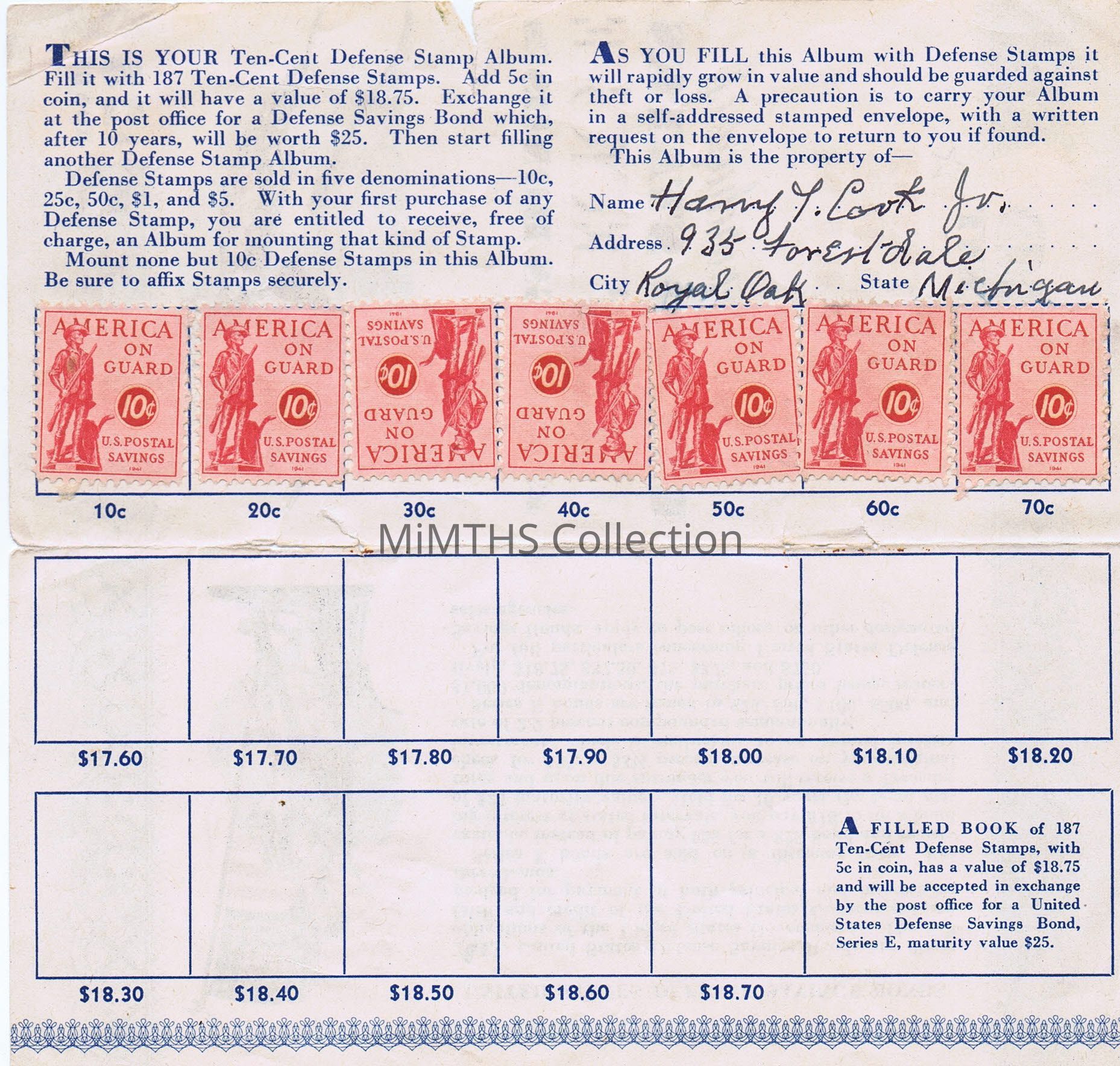 WWII 10 cent savings bond stamp book named to Harry Cook Jr. of Royal Oak MI. HAs .70$ in stamps affixedCataloged By
