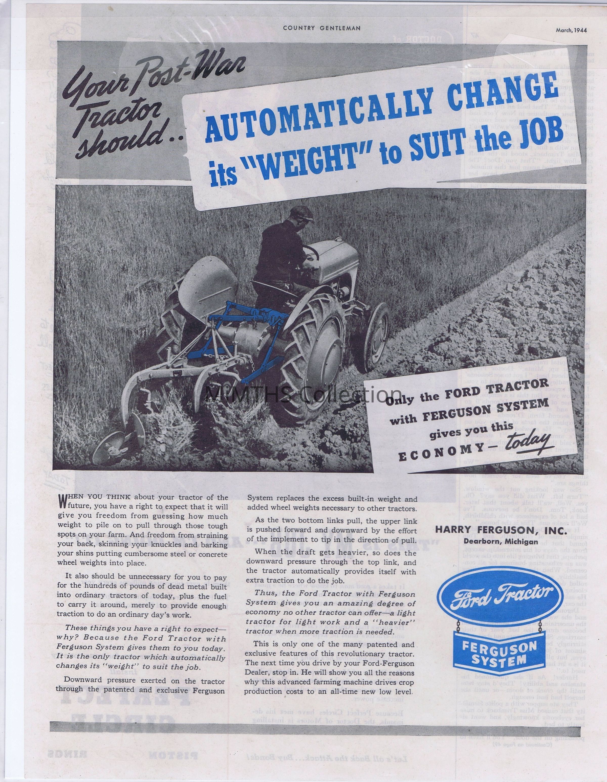Ad clipped from the March 1944 "Country Gentleman" featuring the Ford Tractor with the Ferguson System and how it will make post war farming easier.Cataloged By