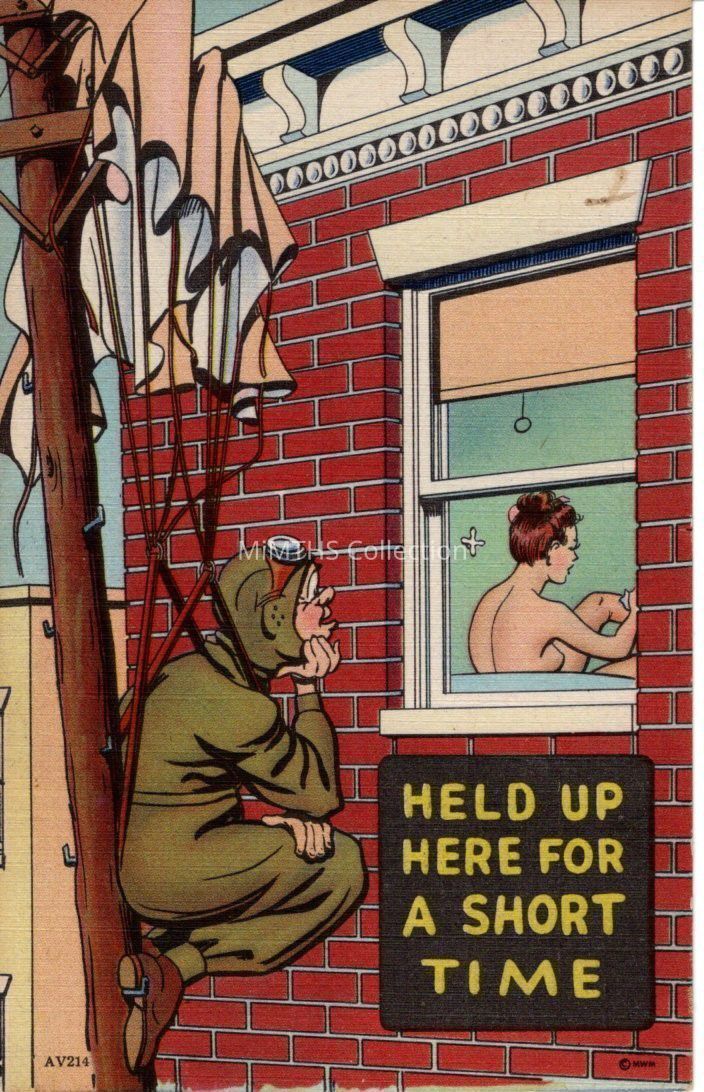 5.5"x3.5" postcard, WWII with humor "held up here for a short time"Cataloged By