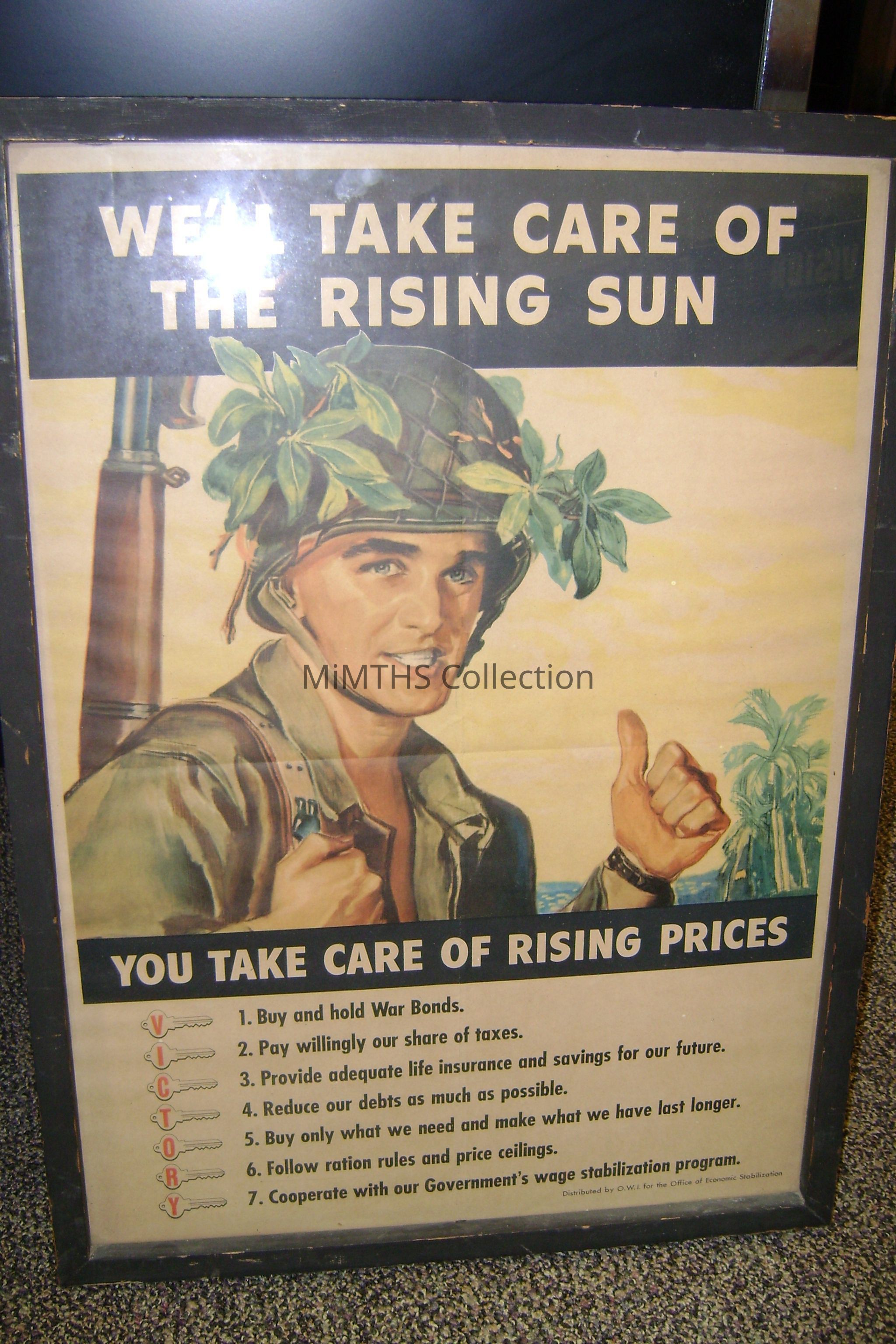 17x24" wood framed poster on Price control featuring a GI and the slogan " We'll take care of the rising sun, you take care of rising prices"