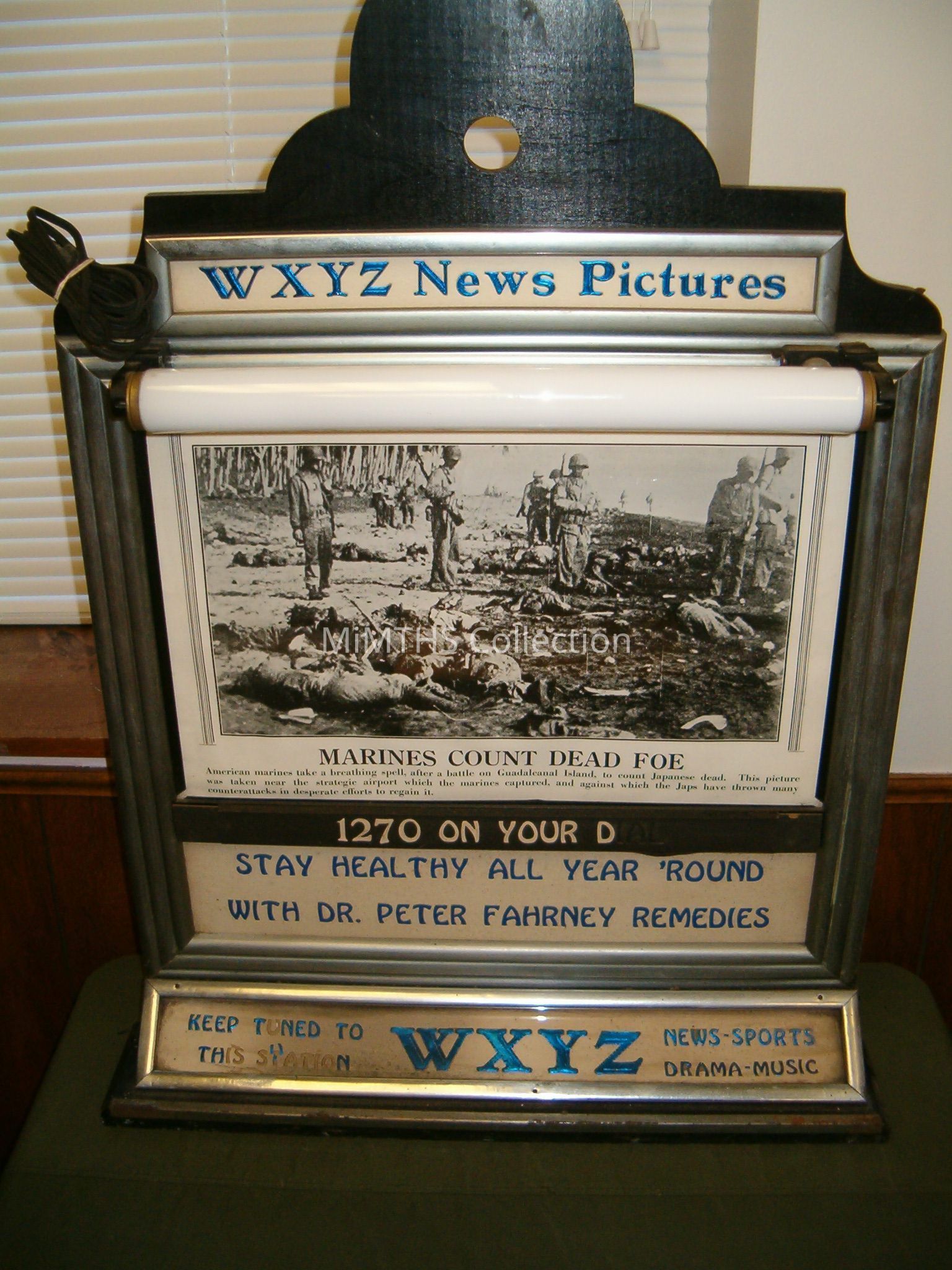 Counter top photo display From Vogt Import house, Detroit. Has 5 photod dated from October 1942. Advertiing WXYZ radio.Cataloged By