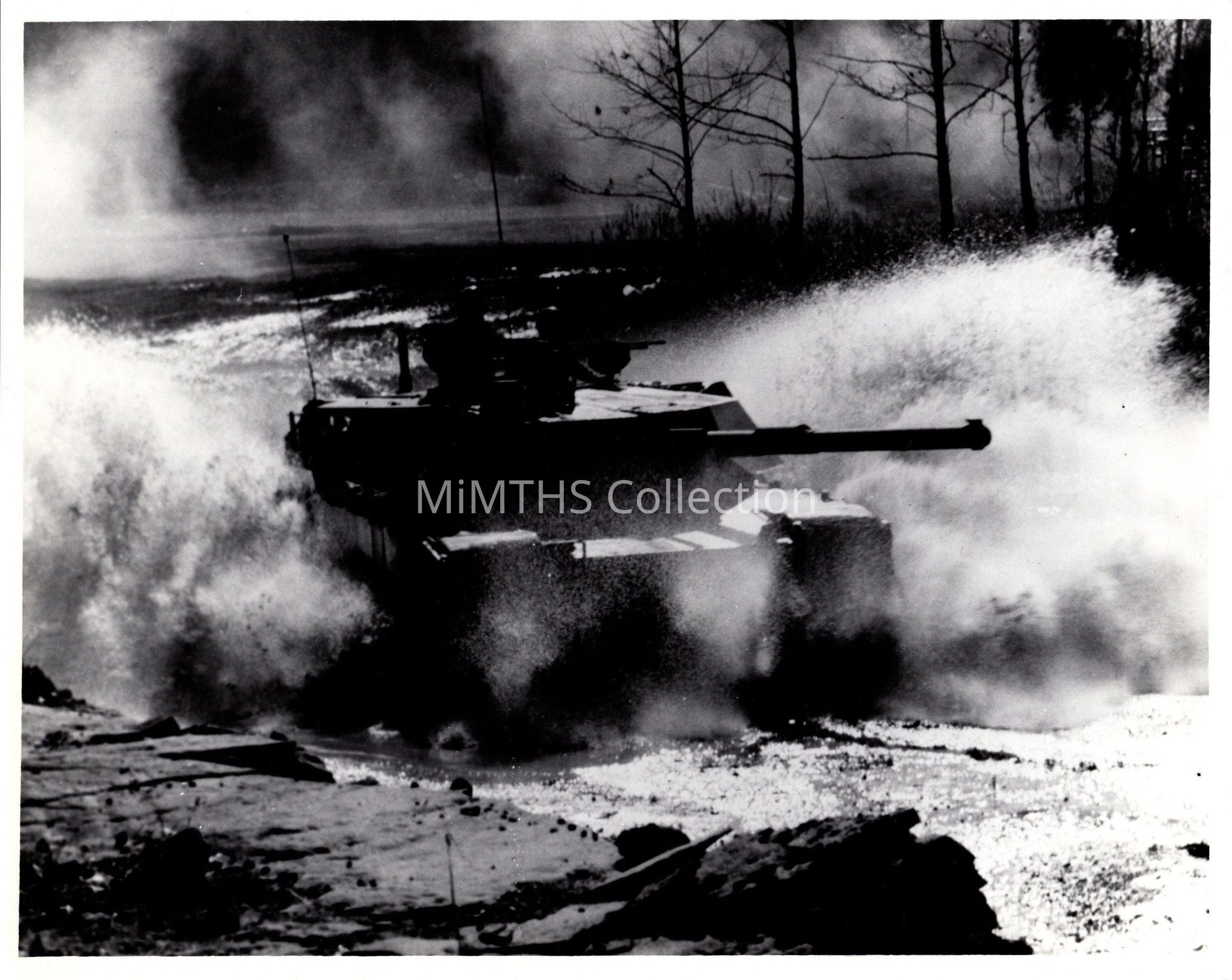 Original B&W photo of an XM1 Abrams Pilot Vehicle in waterPhotograph Details