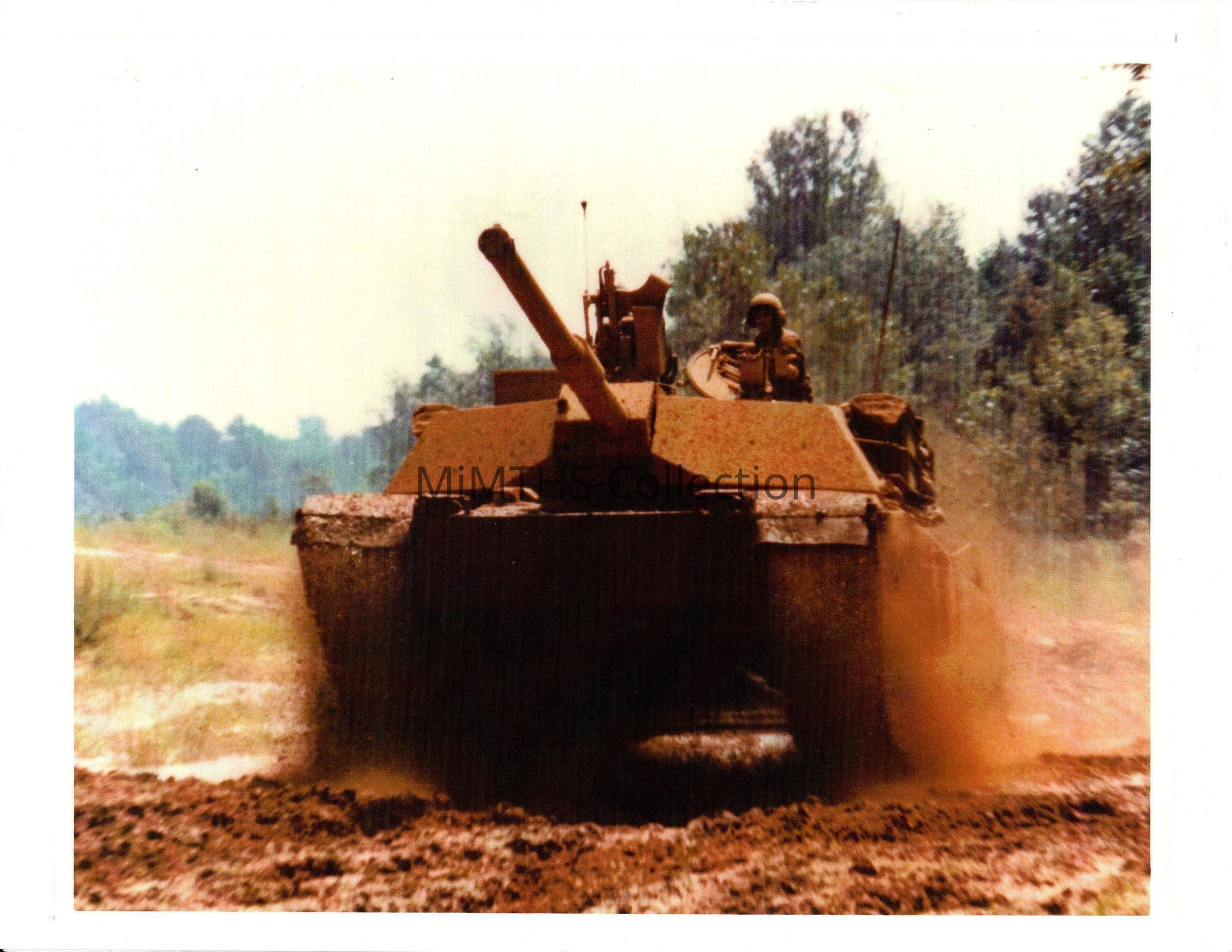 Front shot of an M1 Abrams driving in mud. Based on the commanders cupola, this is on of the pilot vehicles.Cataloged By