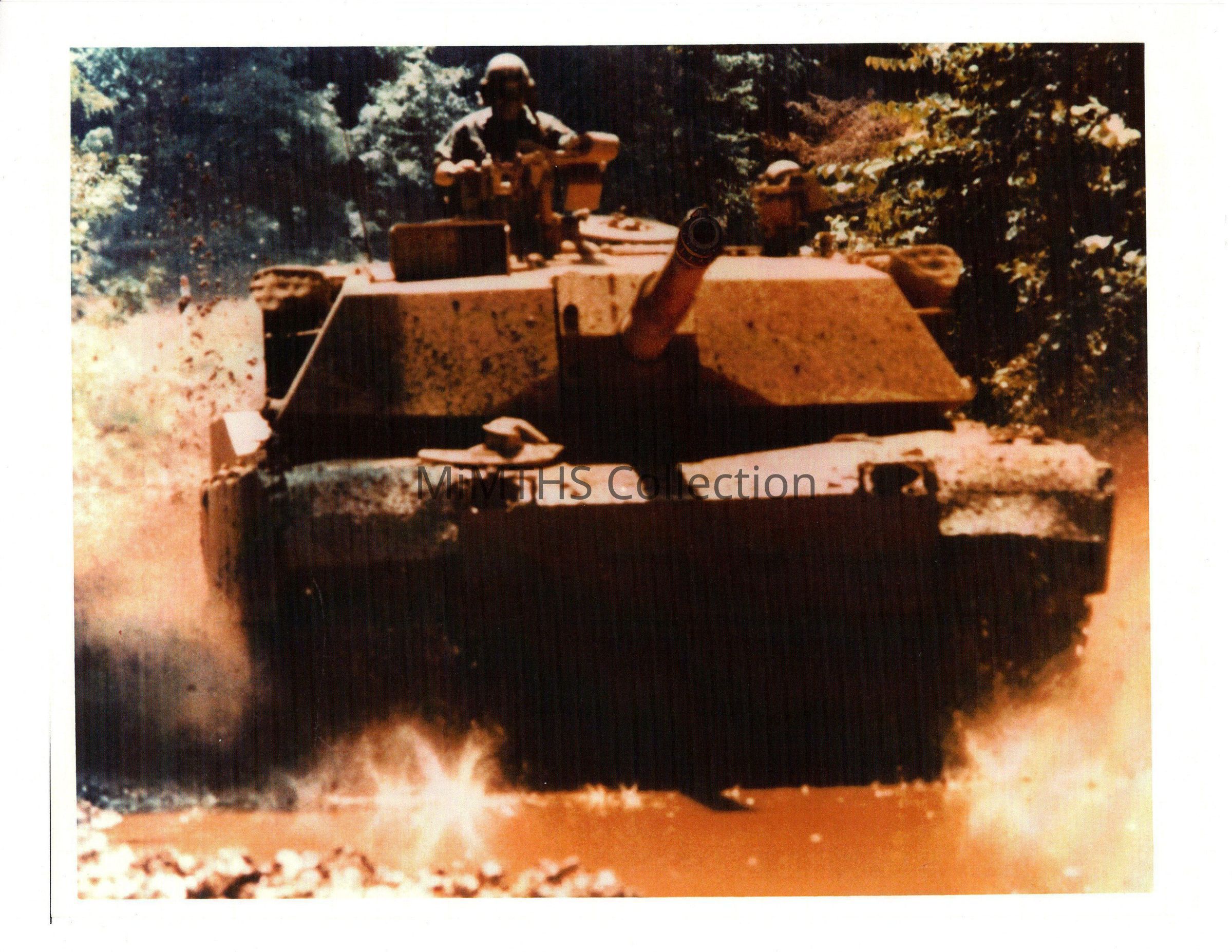 Front shot of an M1 Abrams driving in mud. Based on the commanders cupola, this is on of the pilot vehicles.Cataloged By