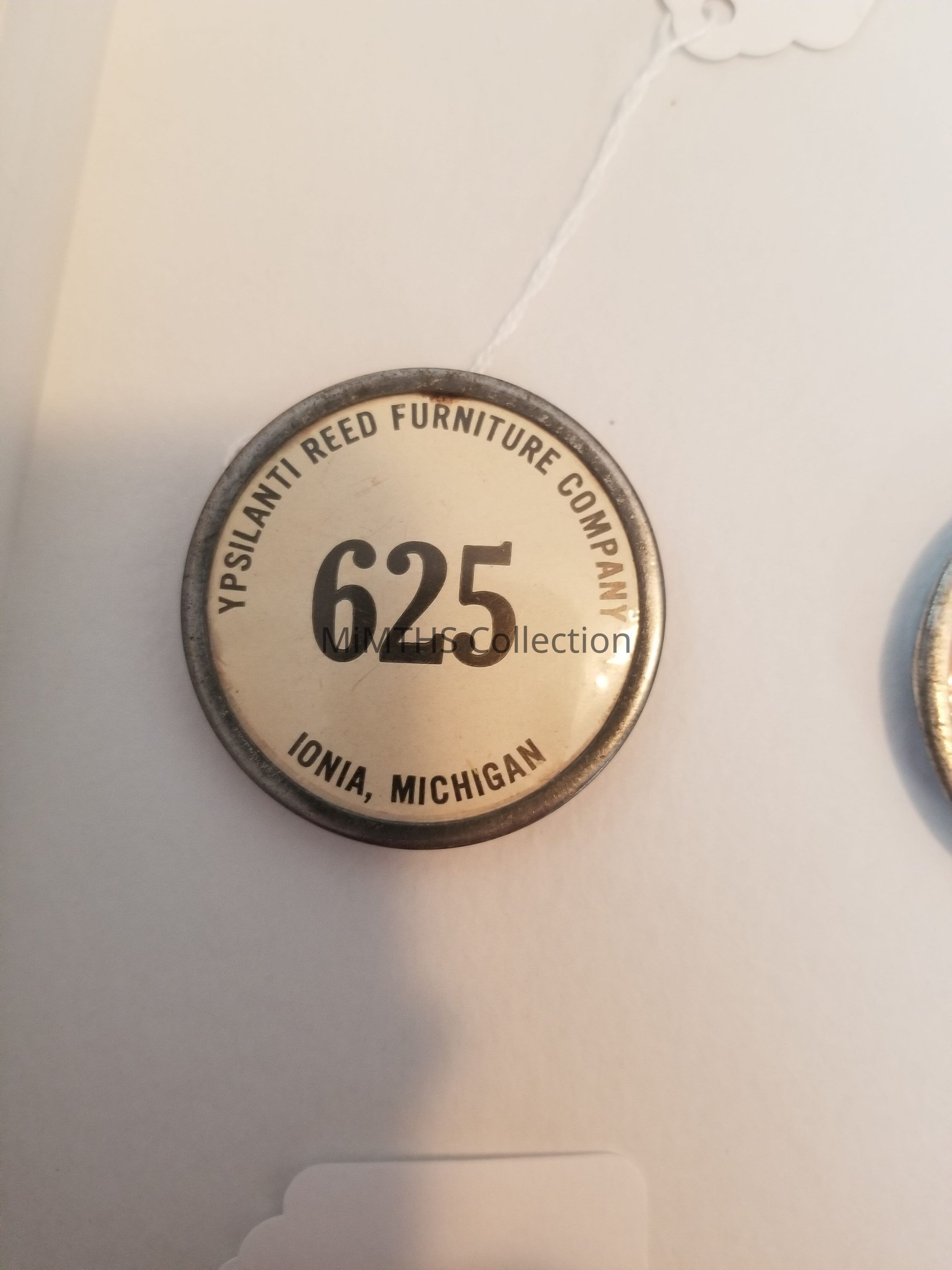 2" round pin back badge with White background from the Ionia, MI Ypsilanti Reed Furniture Co.