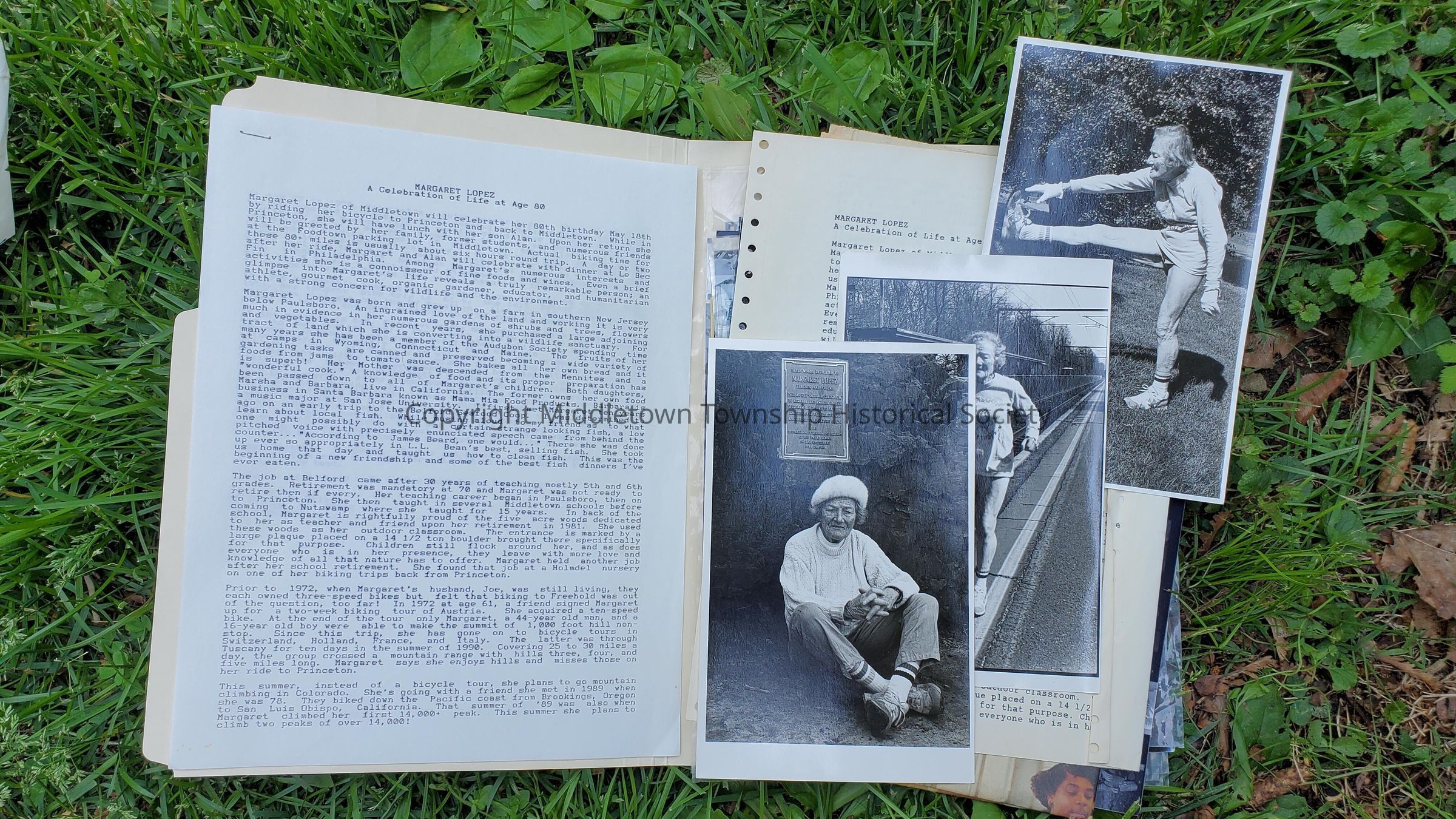 Draft of story by Mary Jo Kenny, which became basis of an article published by Asbury Park Press on May 17, 1991 (also included). Includes three photos and negatives. Margaret Lopez was longtime teacher at Nut Swamp School, and lived in a historic house on Kings Highway. She was active in exercise into her old age.Acquisition