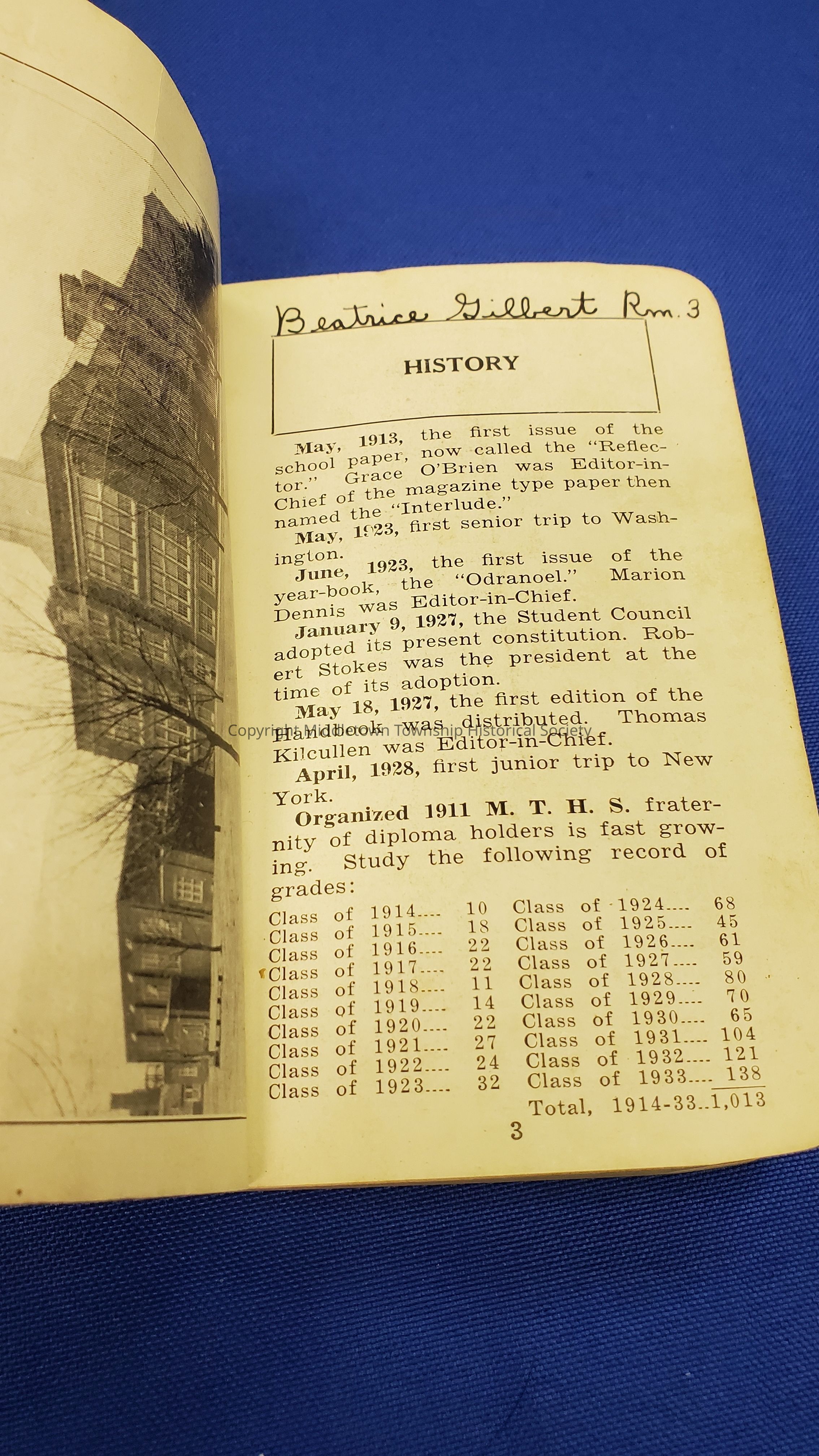 Student Beatrice Gilbert's 1933-34 Middletown Township High School handbook. Also included is a photograph outside the high school. Handbook includes school history and attendance numbers.Acquisition