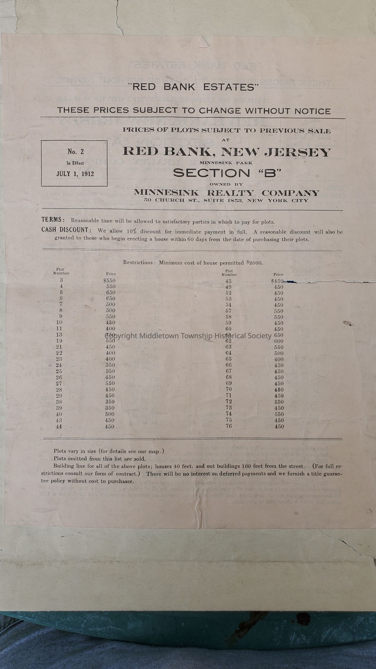 1954 maps showing layout of the Minnesink Park development. 1912 Red Bank Estates price list, 23x27 1912 map, 1912 map 19x17Acquisition