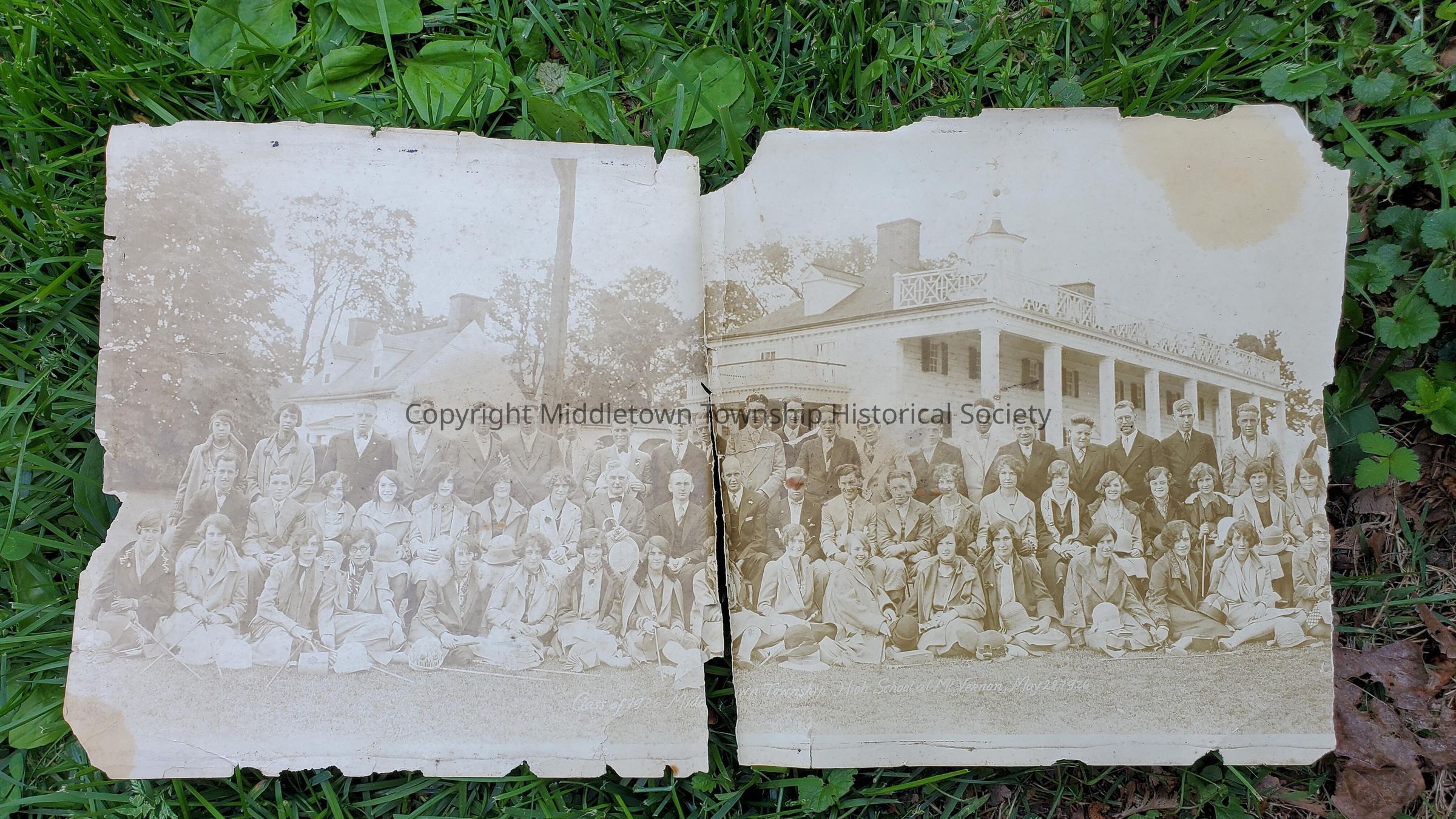 Large photograph (in two pieces, poor condition) of Senior class trip to Washington D.C. and Mount Vernon. Students and chaperones are posed in front of Mount Vernon on May 28, 1926.Acquisition