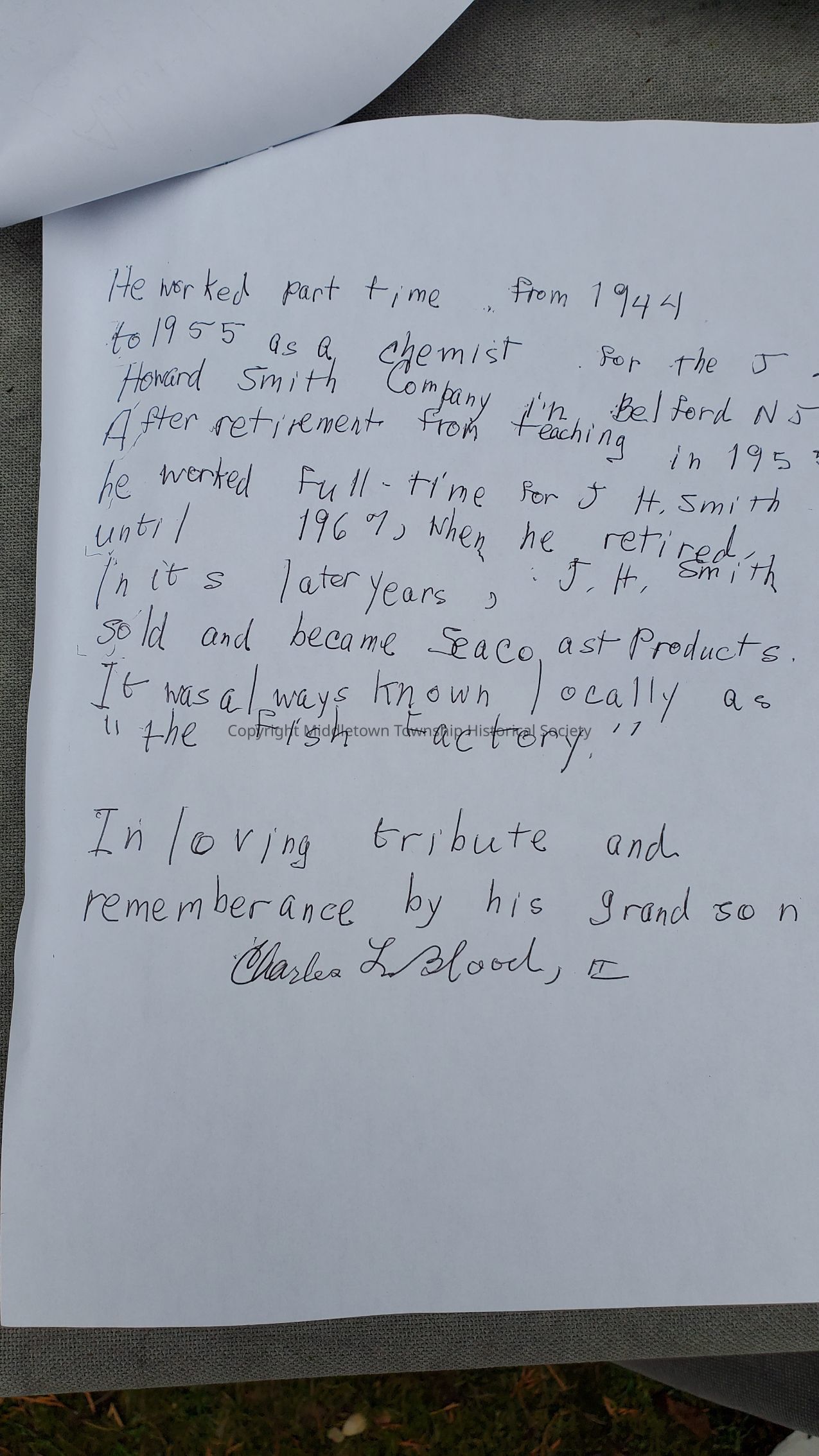 A model made for a U.S. Patent application that was issued in 1962 to Leonardo resident Lewis H. Blood. Blood was for many years a teacher and coach at Middletown Township High School. In the summers and after retiring from teaching, Blood worked at the J. Howard Smith Fish Factory in Belford, which led to the development of this invention that was intended to extract liquid from objects. Includes wooden model, copy of the patent, and letter of explanation from grandson Charles L. Blood, II.Acquisition