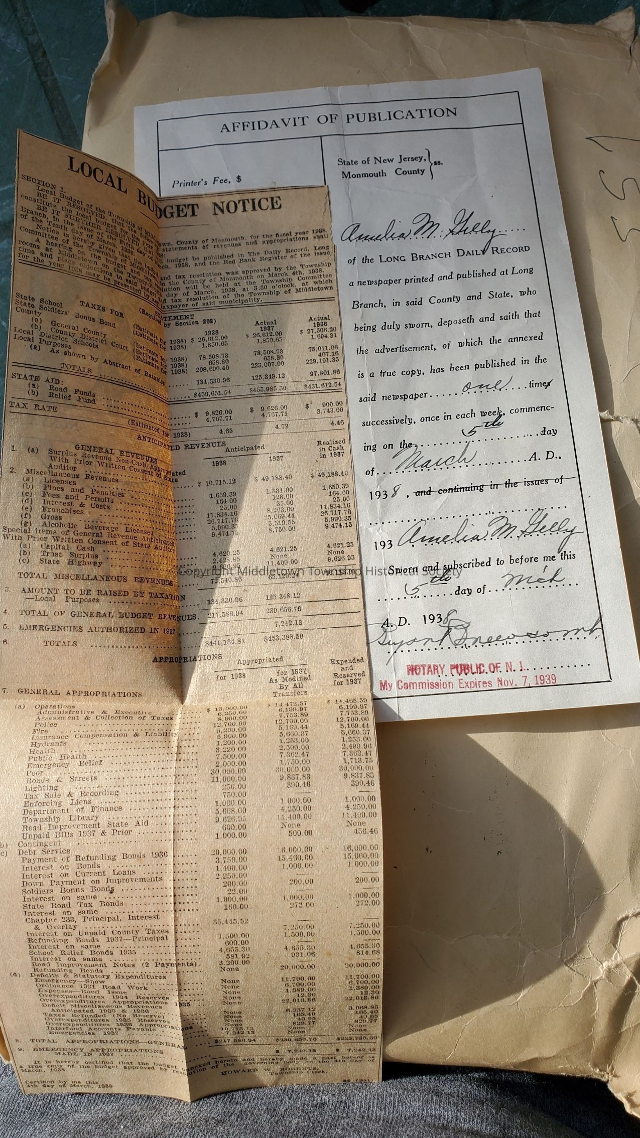 Affidavits of Publication for Ordinances, 1938