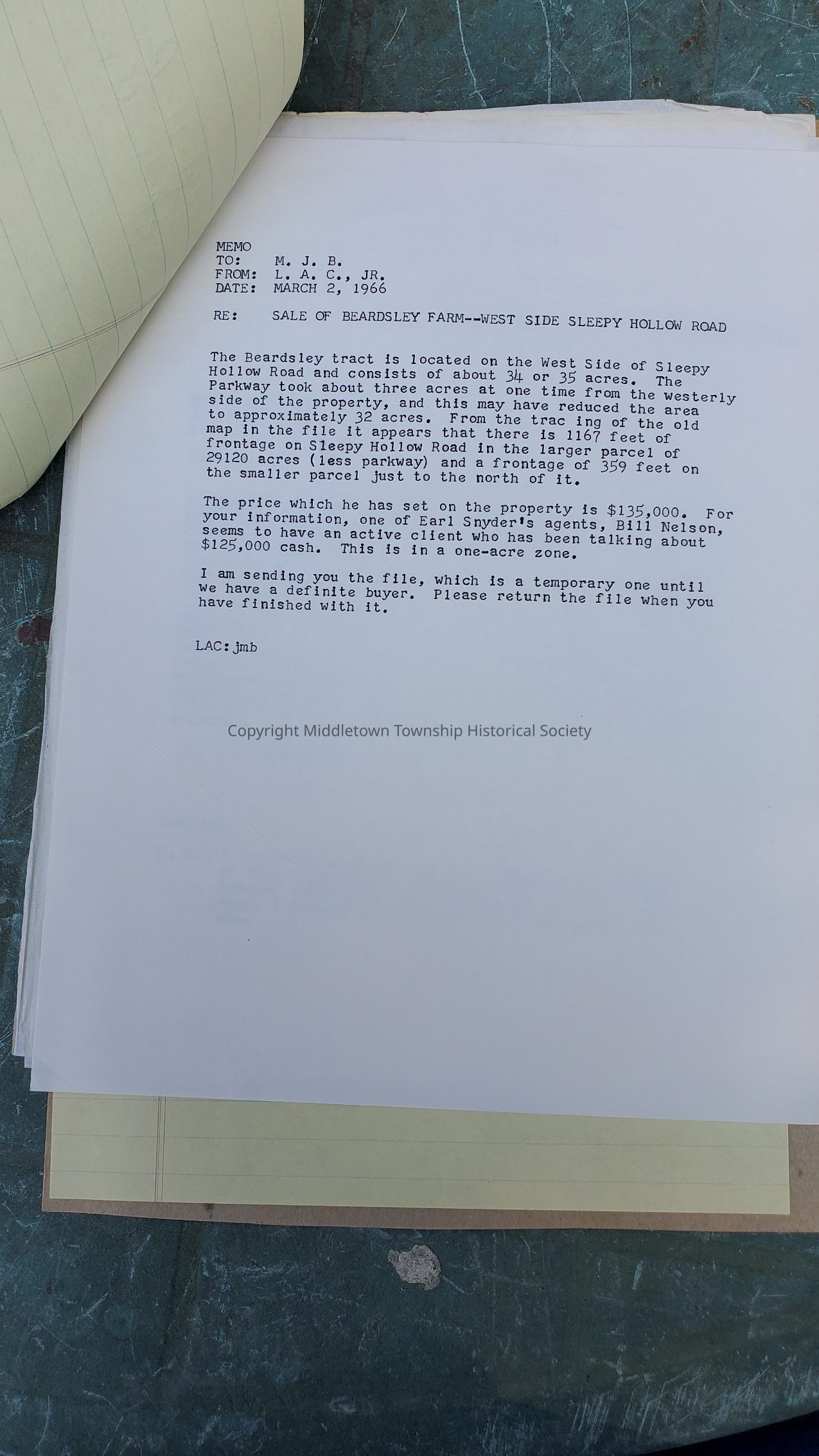 Map of Tilton Estate and documents pertaining to the 1966 sale of the Beardsley farm on west side of Sleepy Hollow Road, owned by Randolph Henry Beardsley, attorney. The family house was at 89 Sleepy Hollow Road, known as the Burrowes/Coe Mansion, now occupied by O.A.S.I.S. Beardsley bought the property in 1951 from Judge John Warren, when it was known as Still Pond FarmAcquisition