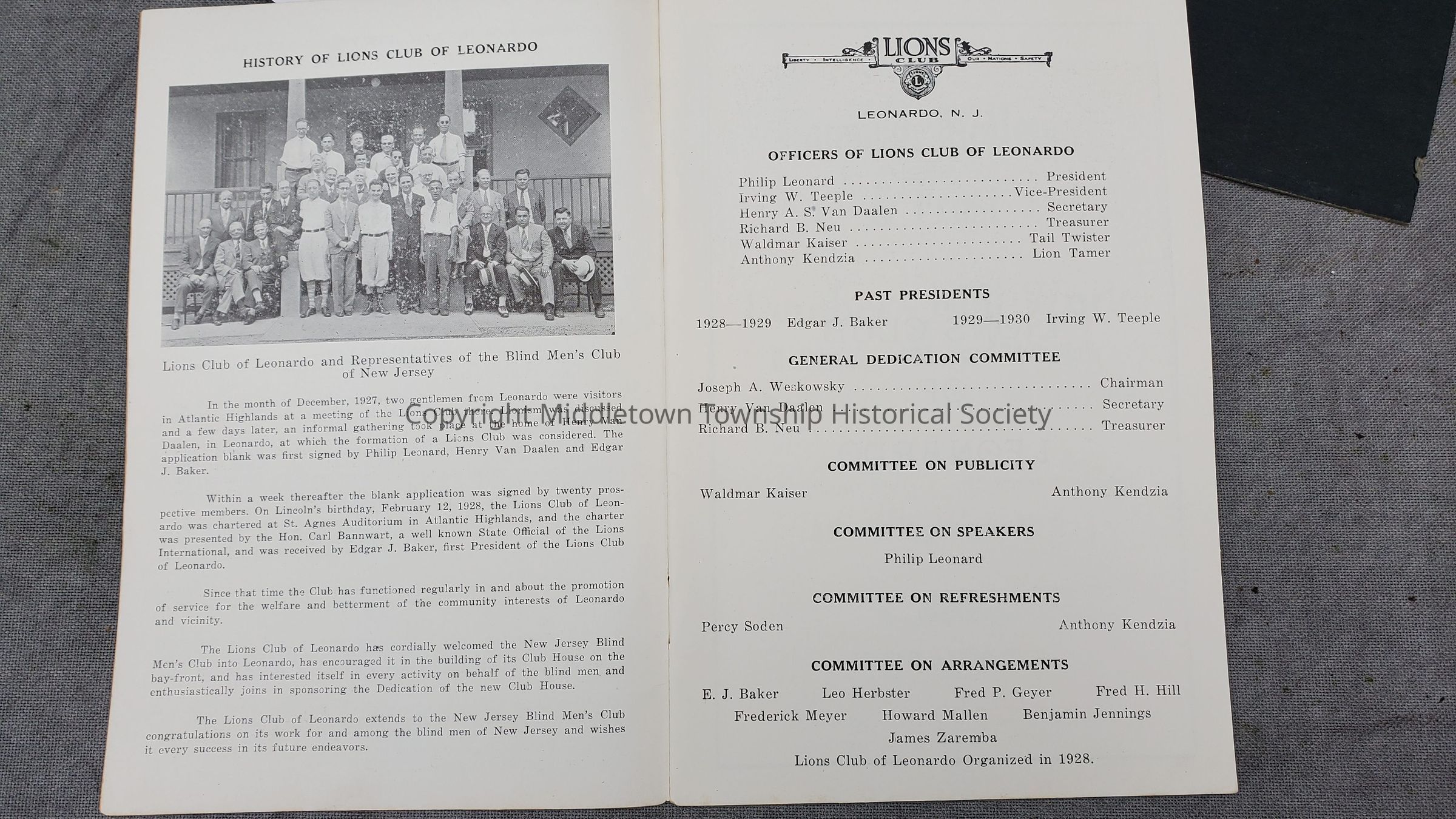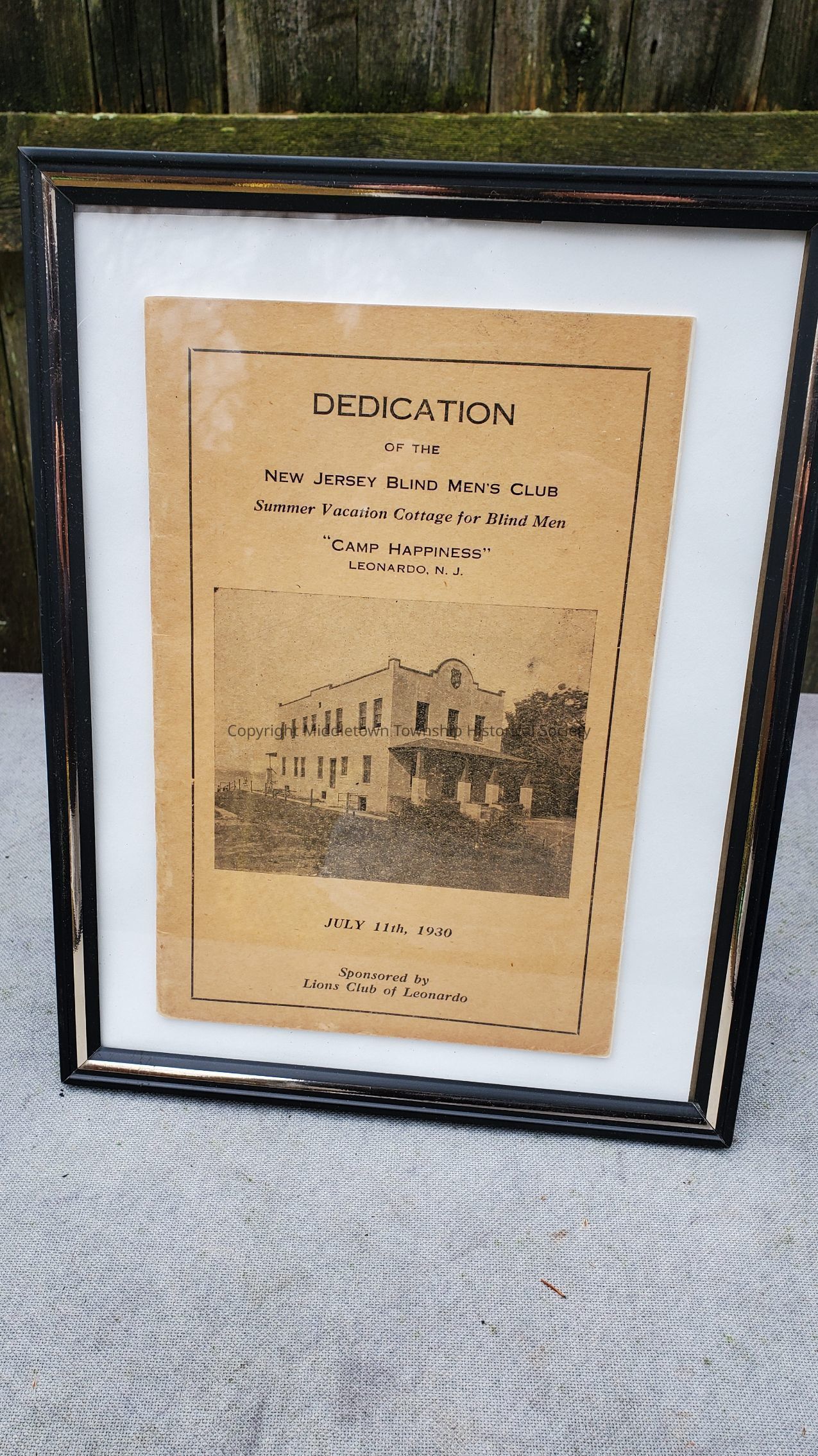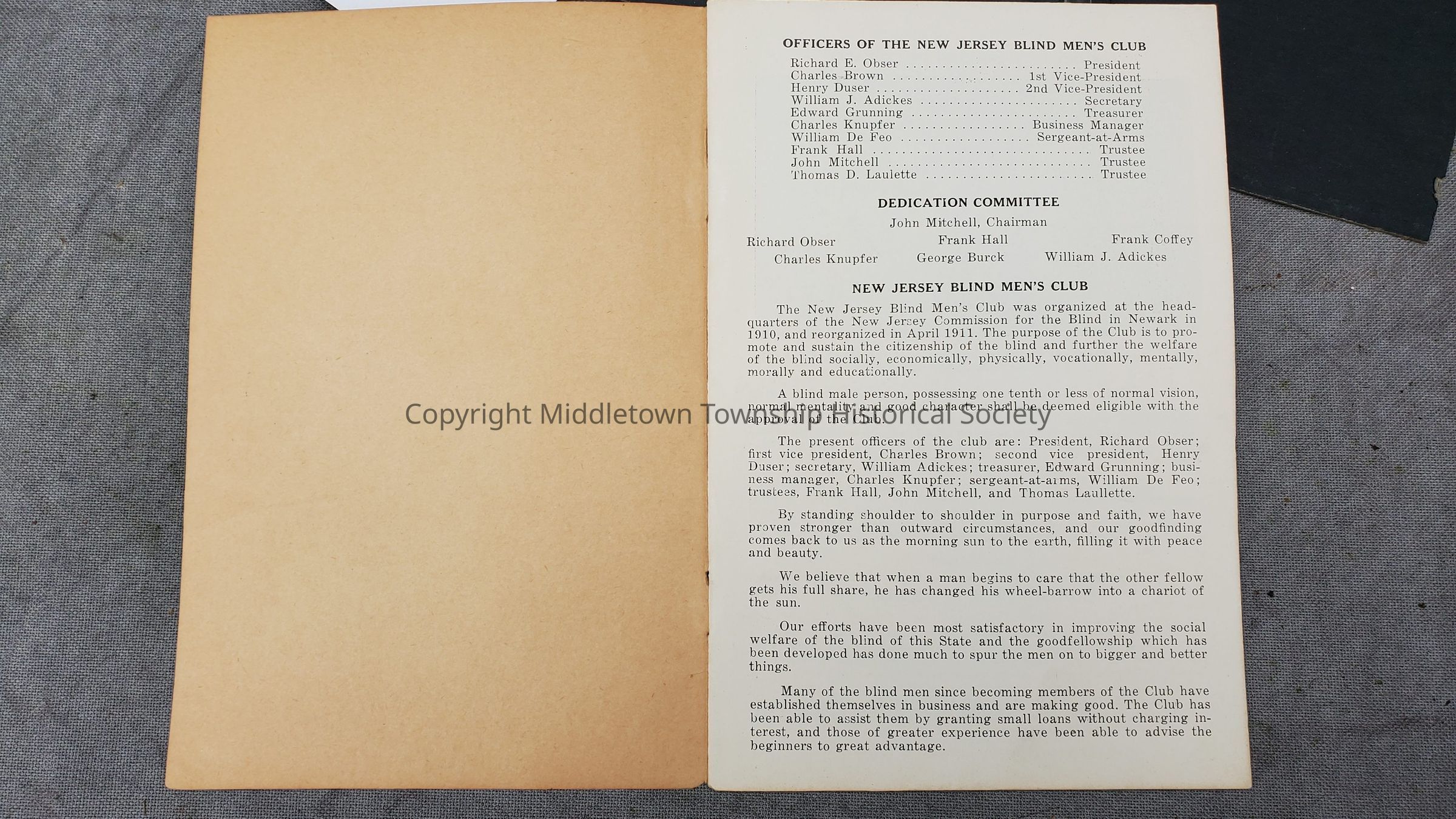 Program booklet from the July 11, 1930 dedication of a new building (Camp Happiness) for the New Jersey Blind Men's Club. The program lists dignitaries, history of the NJBMC, Leonardo Lions club, and ads from supporters.Acquisition