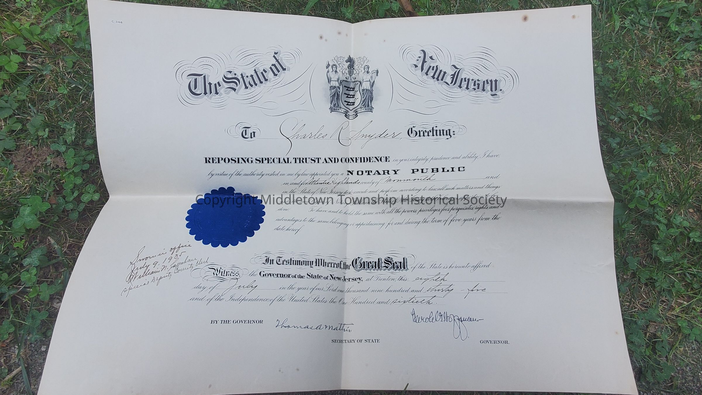 1935 Notary Public certification for Charles Snyder and an index of wills created by his law firm in Atlantic Highlands.Acquisition