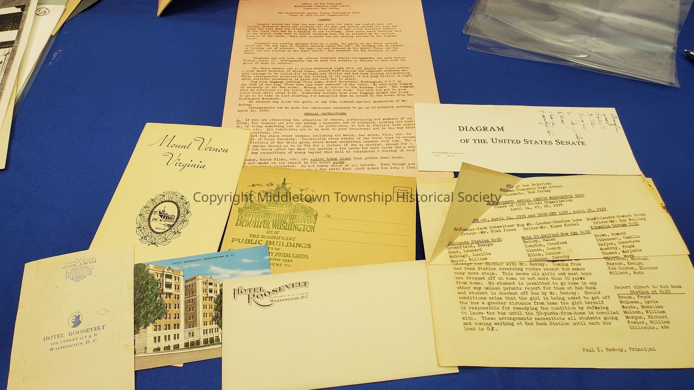 Collection of ephemera from a Middletown Township High School student's senior trip to Washington DC. Included are a postcard, envelope, and soap wrapper from Hotel Roosevelt; Mount Vernon pamphlet; US Senate guide; instructions from the school.Acquisition