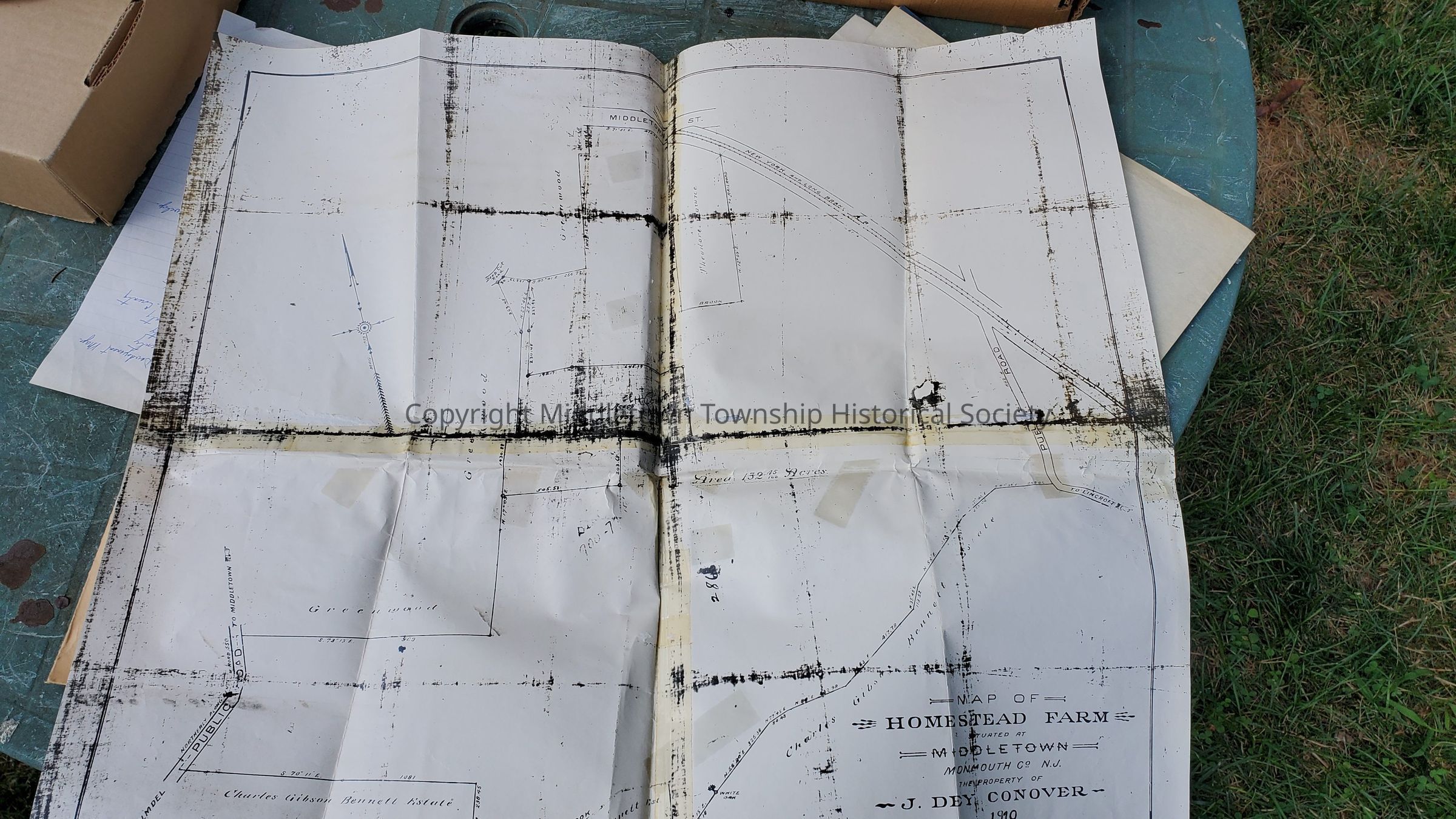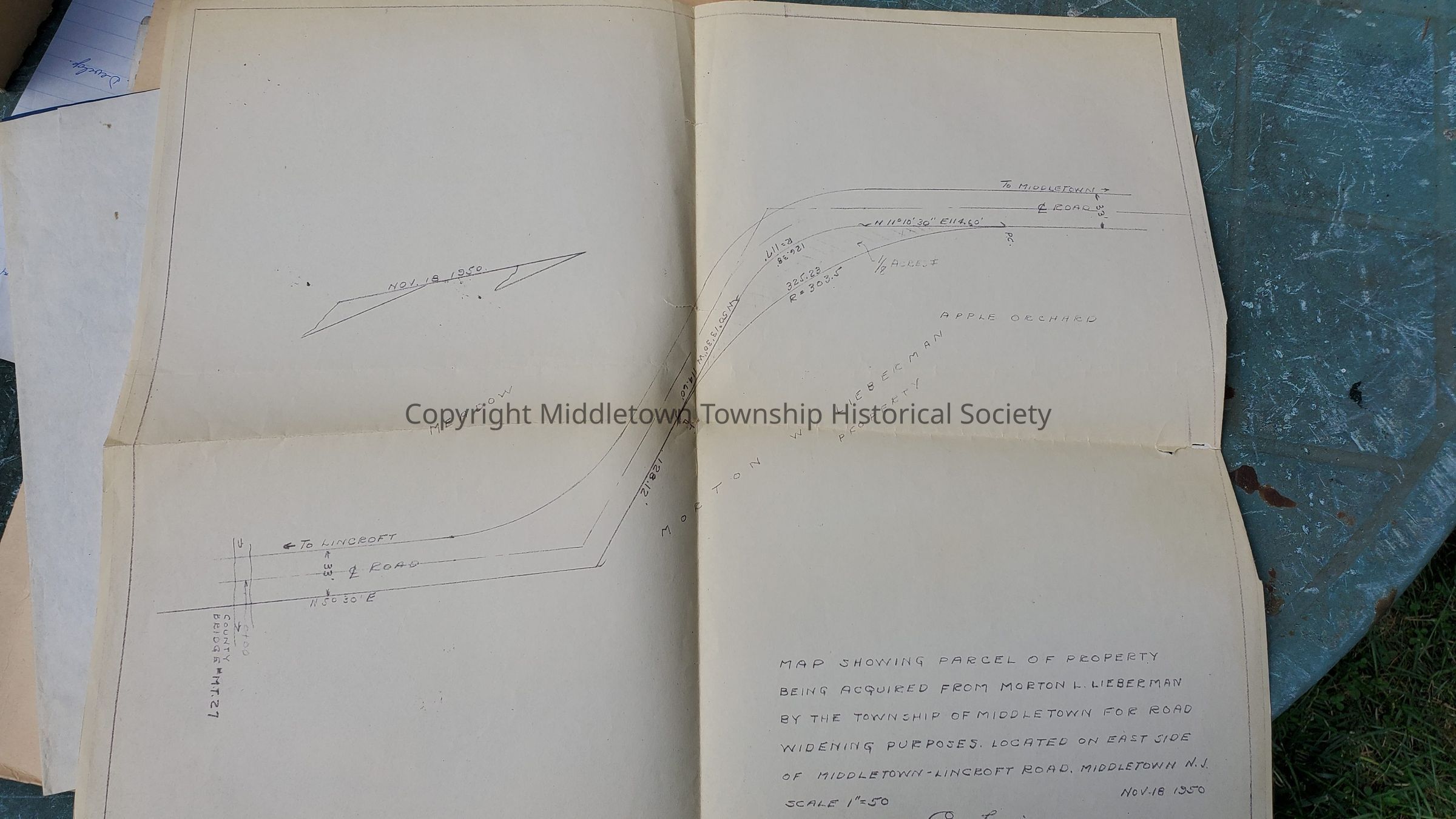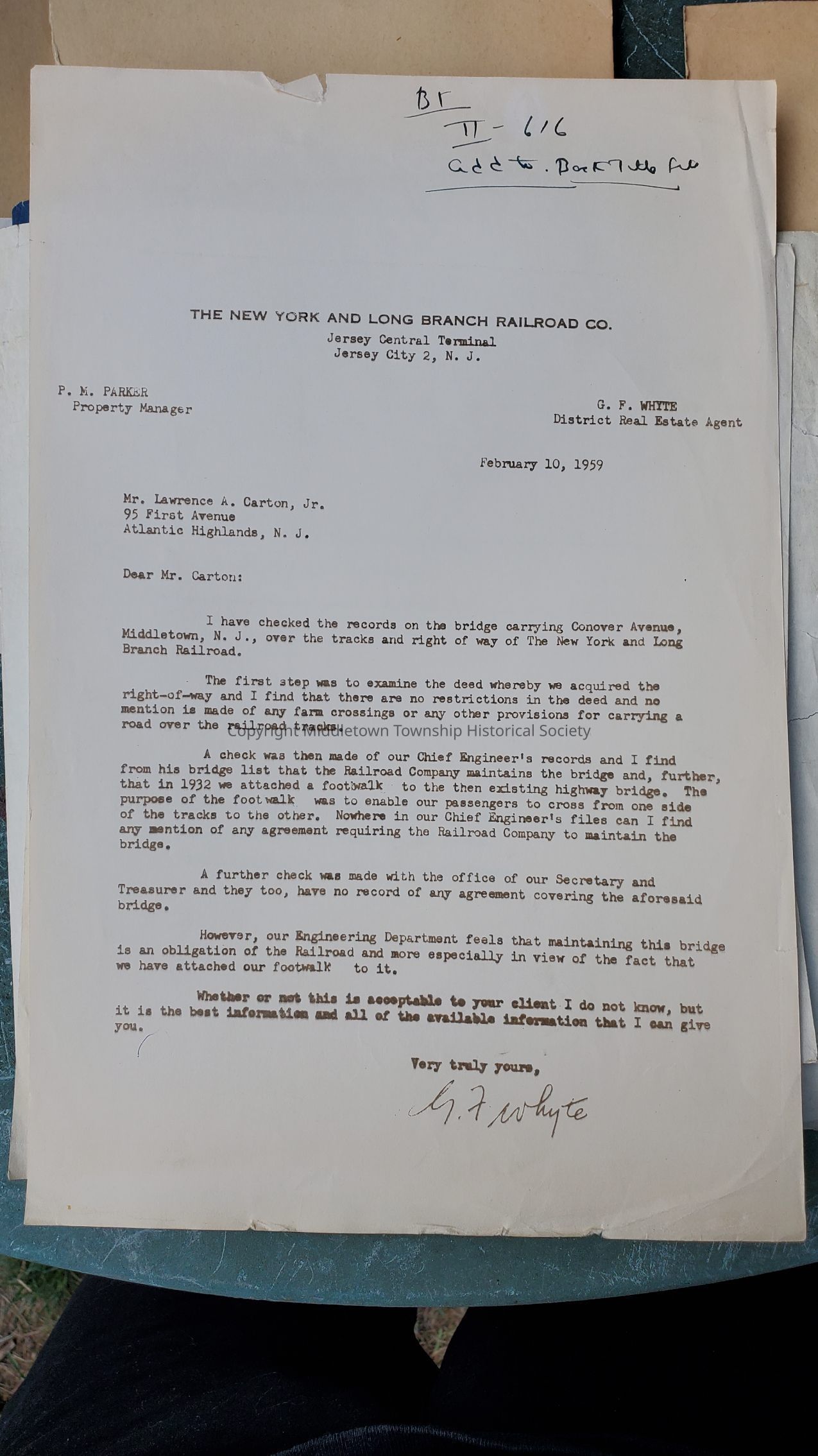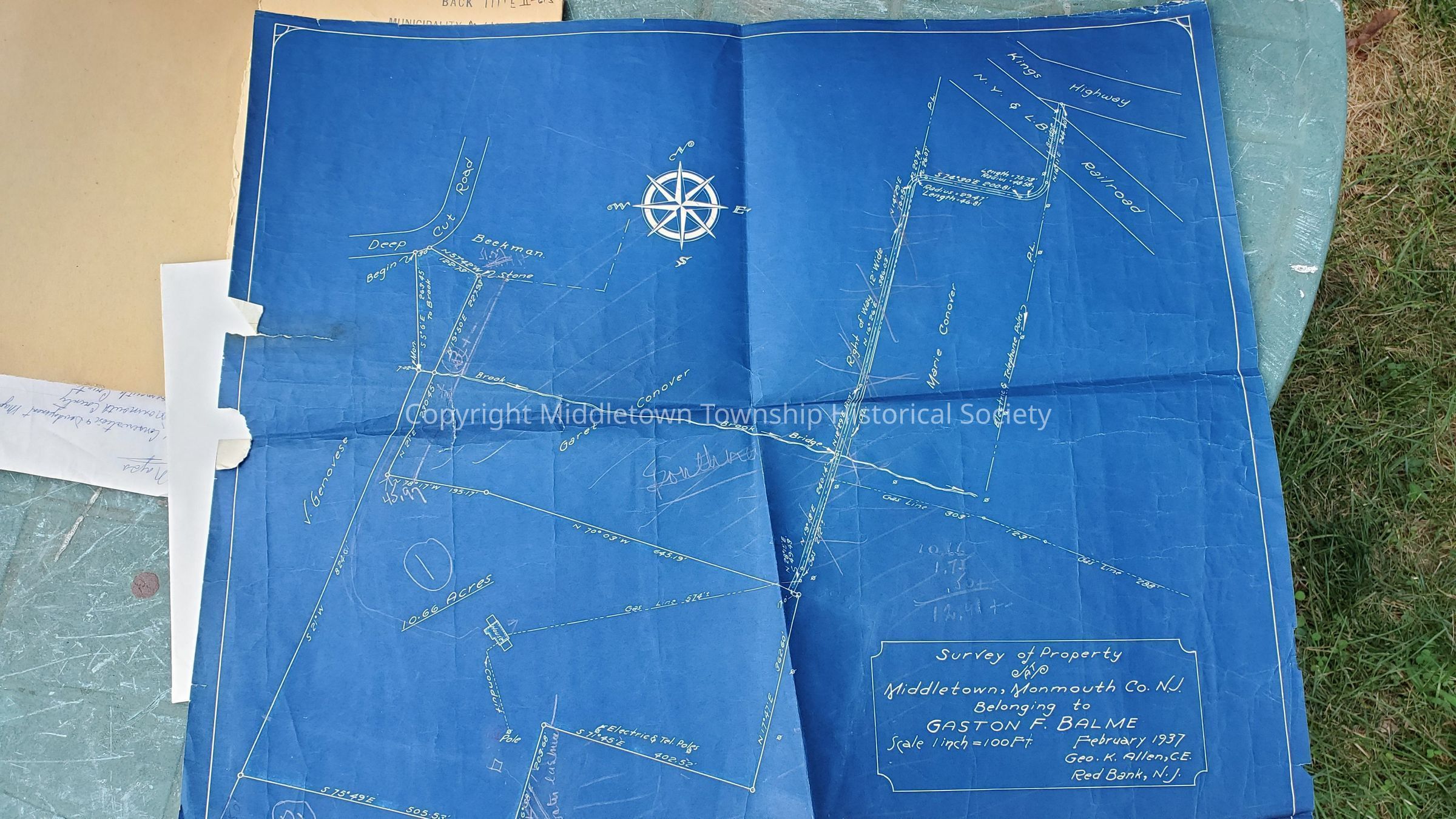 Letters from 1959 concerning a railroad bridge near Conover Avenue. Maps from 1937 (showing property owners Conover, Genovese, Beekman) and 1890 are included. Unrelated map of Morton Lieberman's land on Middletown Lincroft Road also included.Acquisition